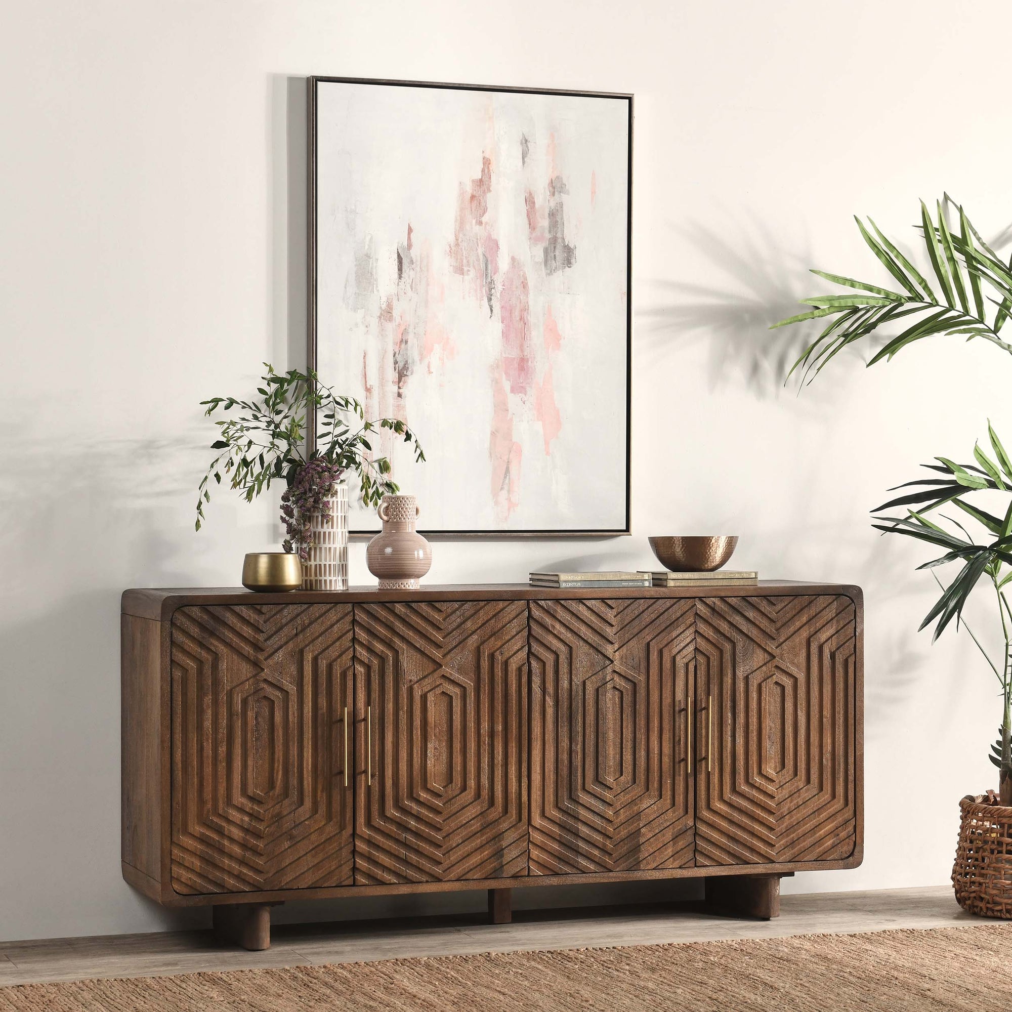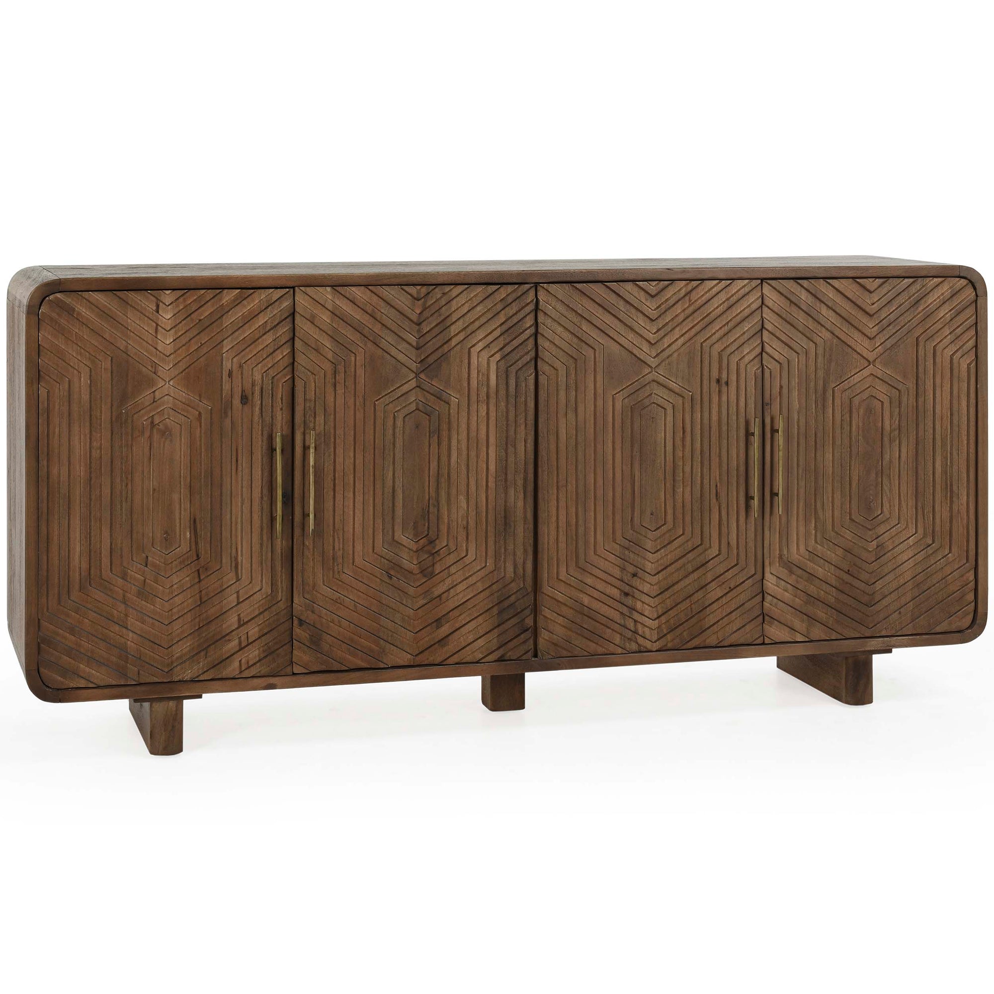 The Holmes Buffet is crafted from durable mango wood with an artisan brown finish, highlighting its natural grain and texture. Featuring four doors and a clean, modern design, this buffet provides ample storage while adding a touch of contemporary elegance to any dining or living space.