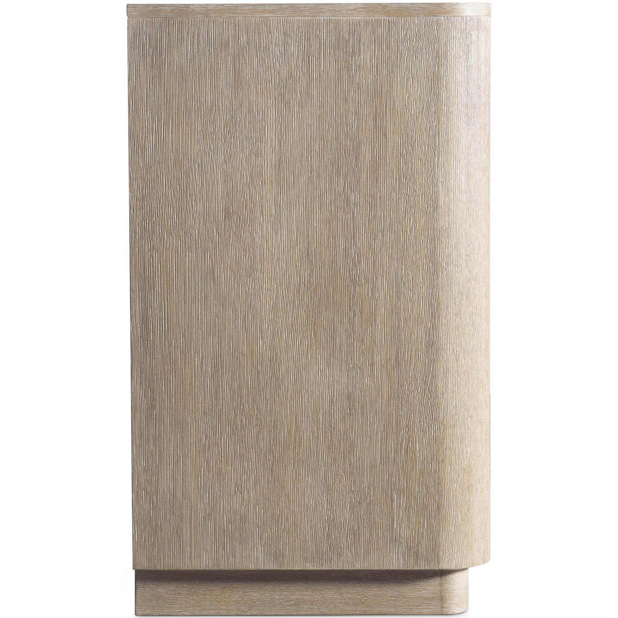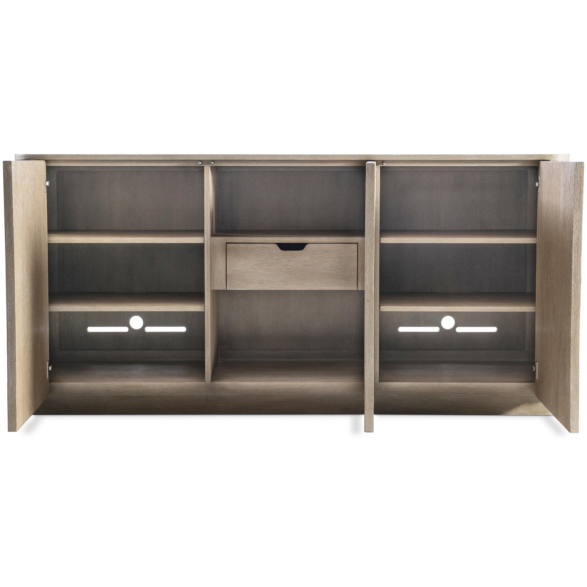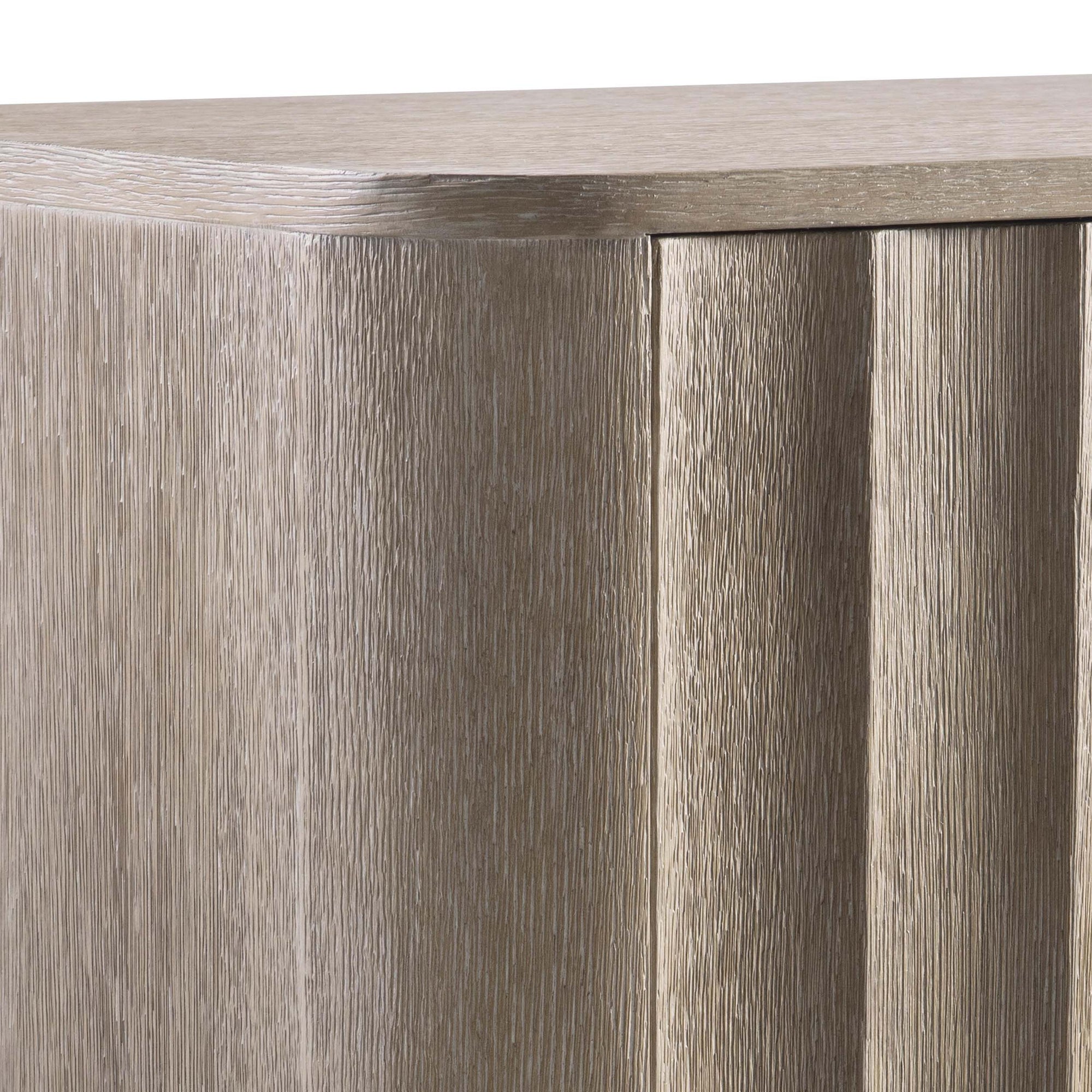 The Loggia Sideboard creates stunning dimension and contrast with a beautifully scalloped, fluted design across its three push-to-open doors. Finished in a light Aria hue, the wire-brushed oak case features a top with softened, rounded corners and rests on a solid plinth base. The doors open to reveal ample storage, including adjustable shelves and a soft-close interior drawer, blending high style with modern function.