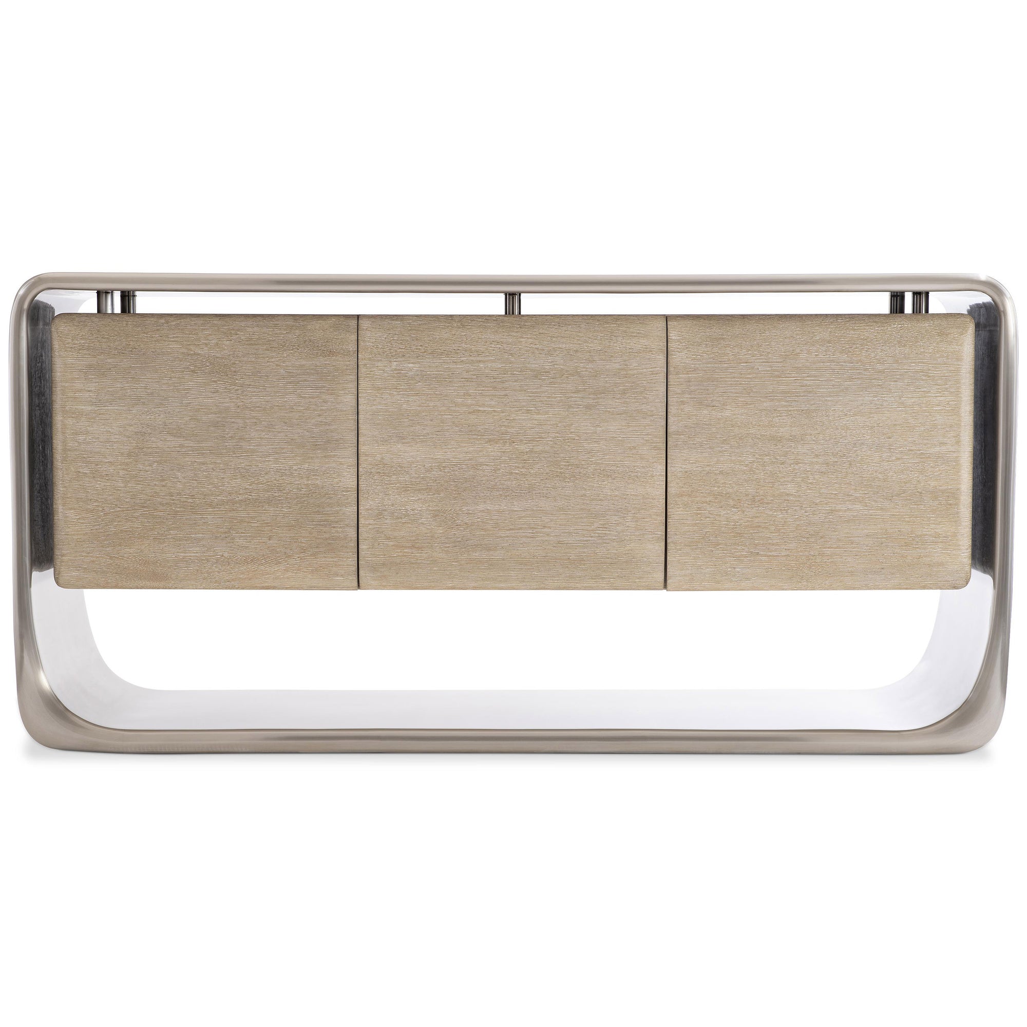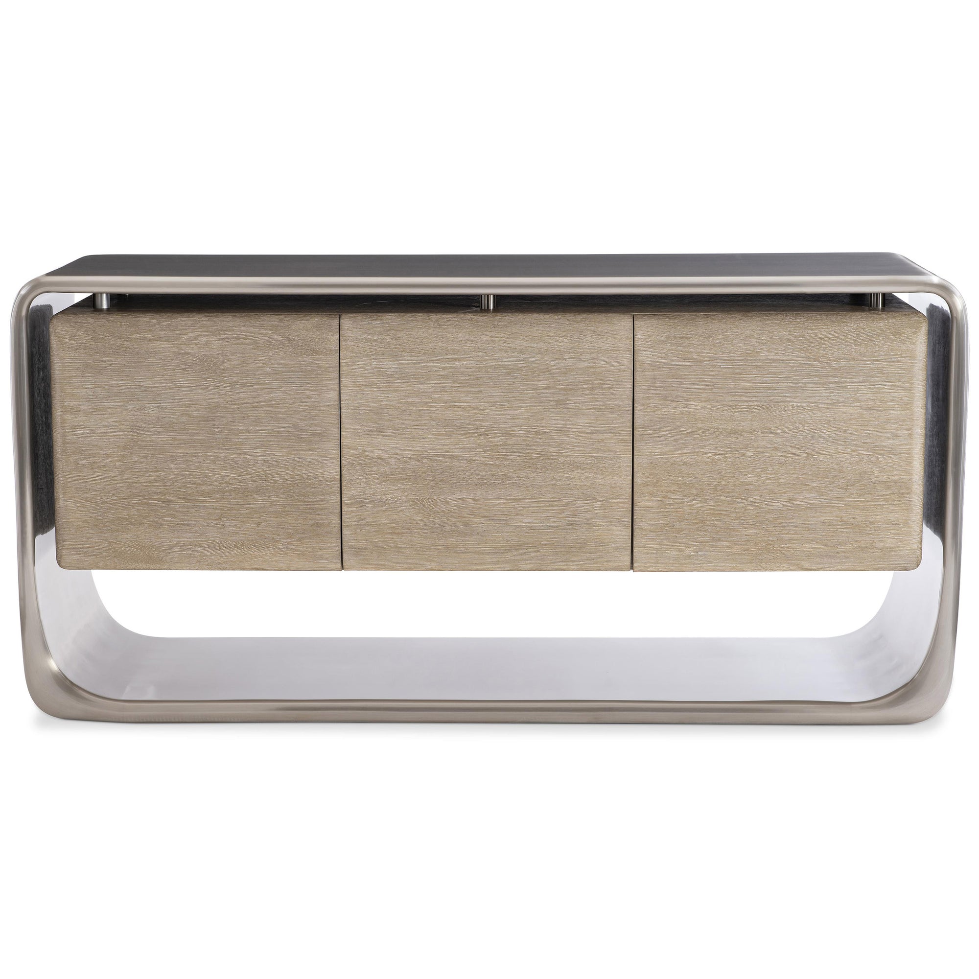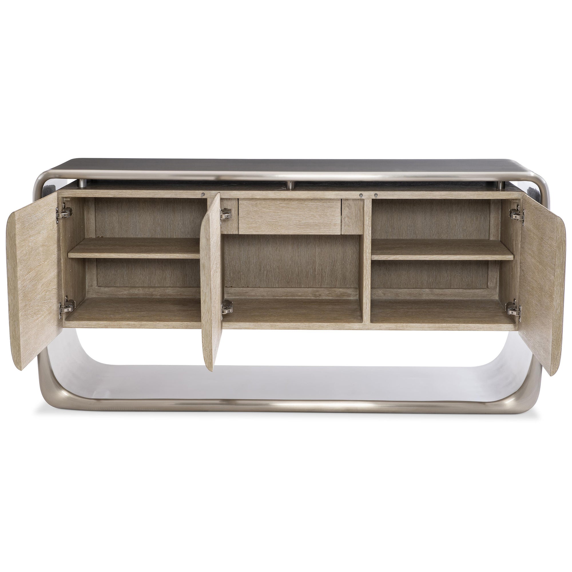 The Lomond Buffet blends jet-set glamour with modern simplicity, inspired by iconic ‘60s design. A sleek brushed stainless steel frame in Tarnished Nickel surrounds an oak case finished in Trevin, creating a floating effect within the softly curved shell. Three push-to-open doors reveal a thoughtful interior layout, including an adjustable shelf behind each side door and a soft-close drawer with silver insert behind the center. Elevated and refined, it’s a timeless statement piece.