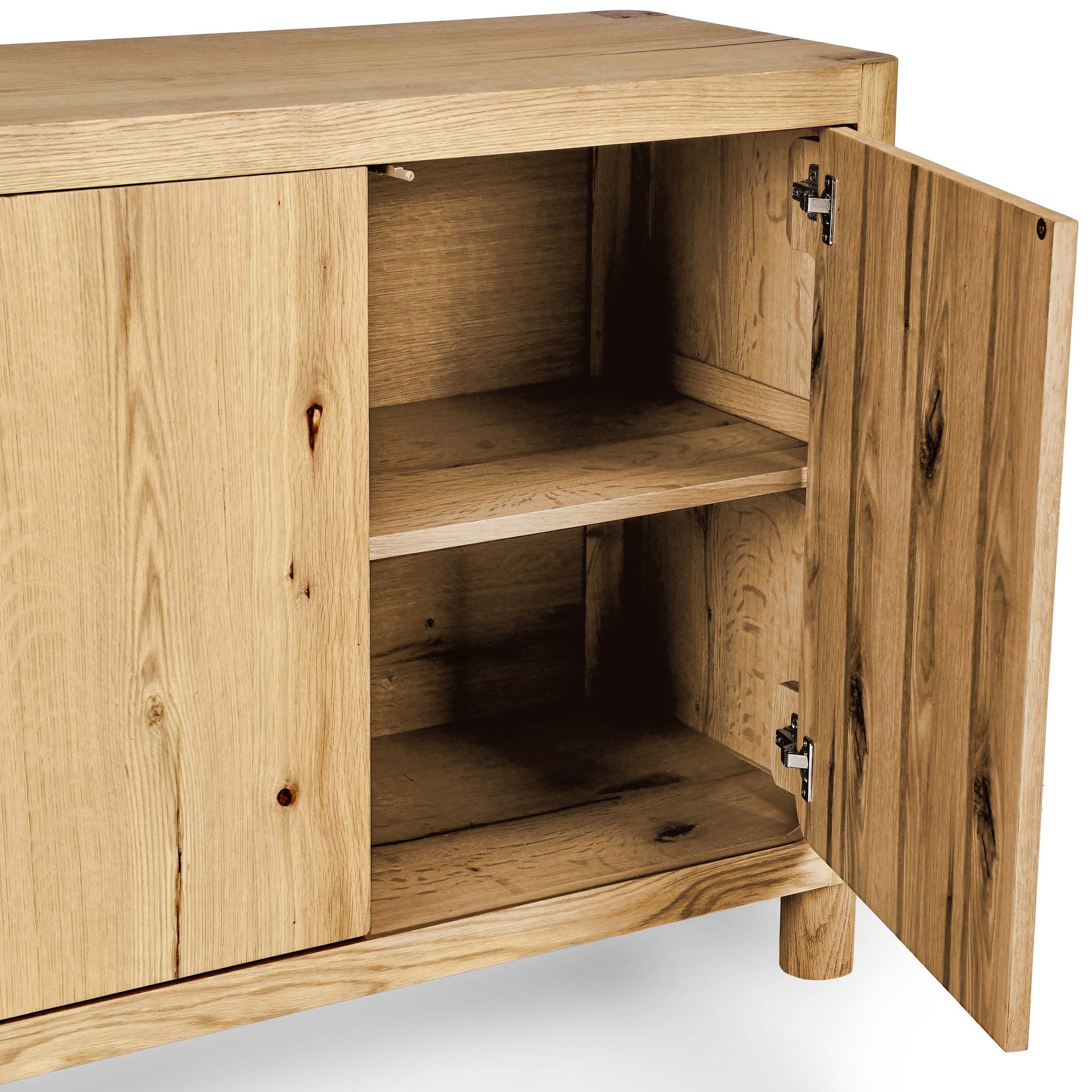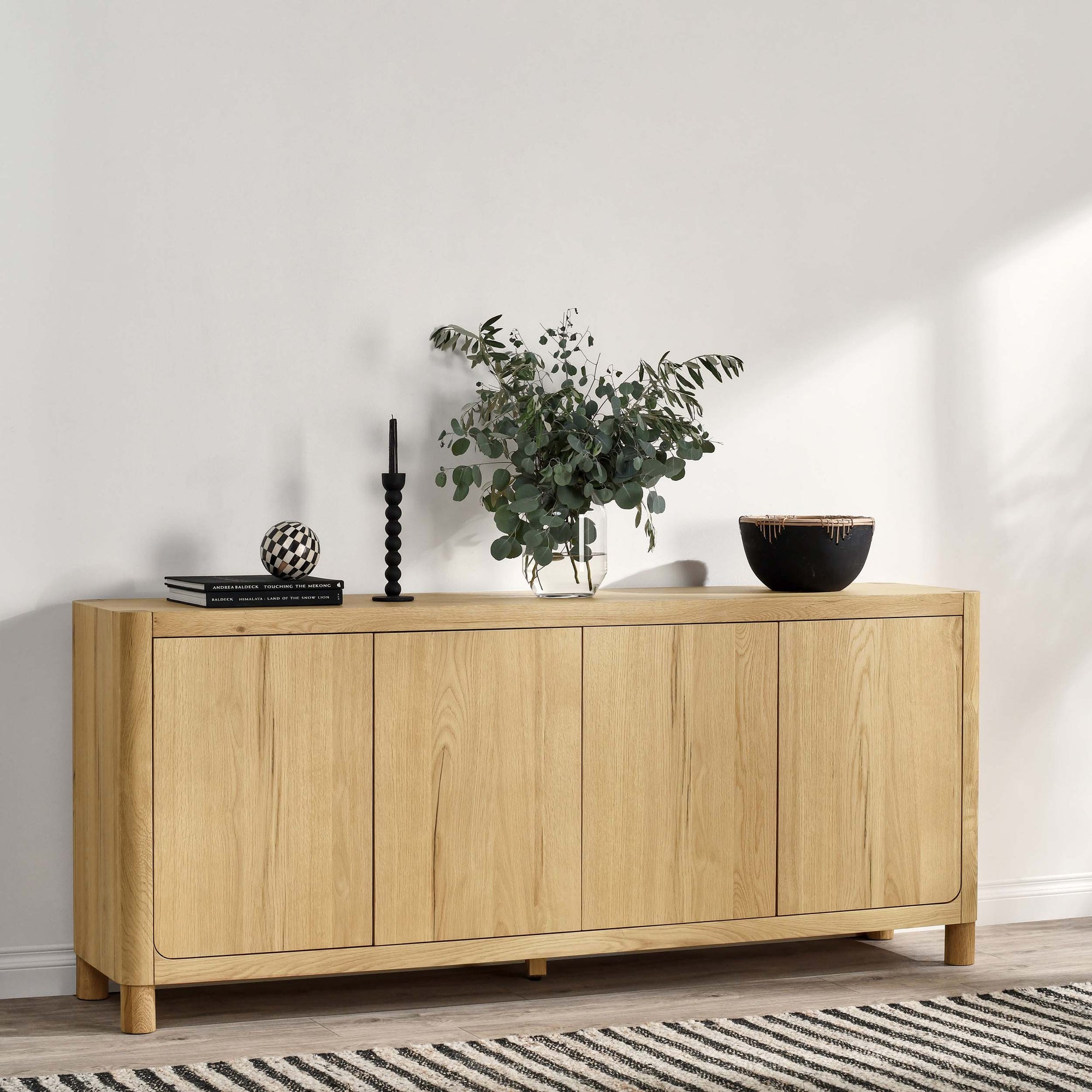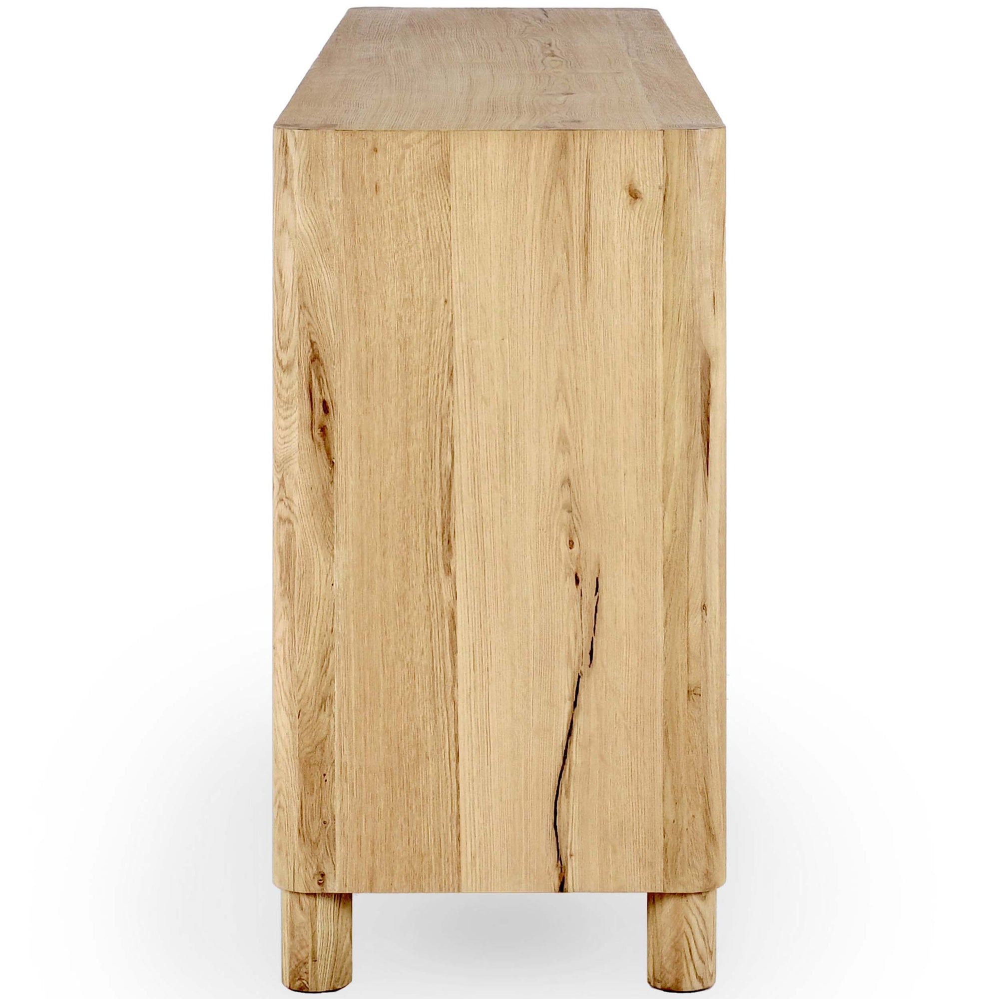 The Orlando Buffet is crafted from oak veneer and solid oak, featuring smooth rounded edges and a natural finish that highlights the wood’s grain. With four doors and spacious shelving, this buffet offers functional storage while adding a warm, organic touch to any dining or living space.