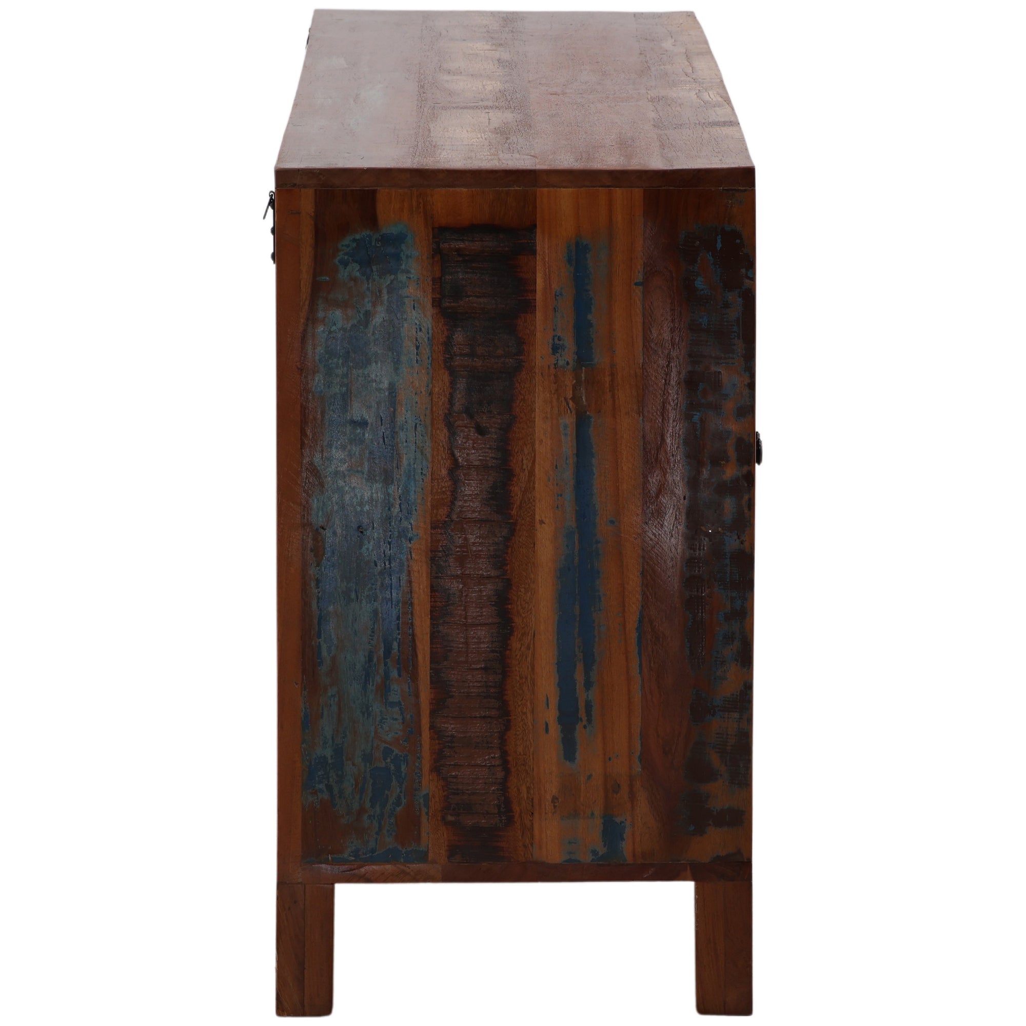 The Persea Sideboard is a striking piece that blends rustic charm with ample storage. Crafted from reclaimed mango wood, it features a unique distressed medium brown paint finish. As each sideboard is hand-finished, the paint tones and coverage will vary, ensuring that every piece is one-of-a-kind. Its generous surface and interior space make it a perfect functional centerpiece for a dining room, living area, or hallway, bringing a sense of history and character to your home.