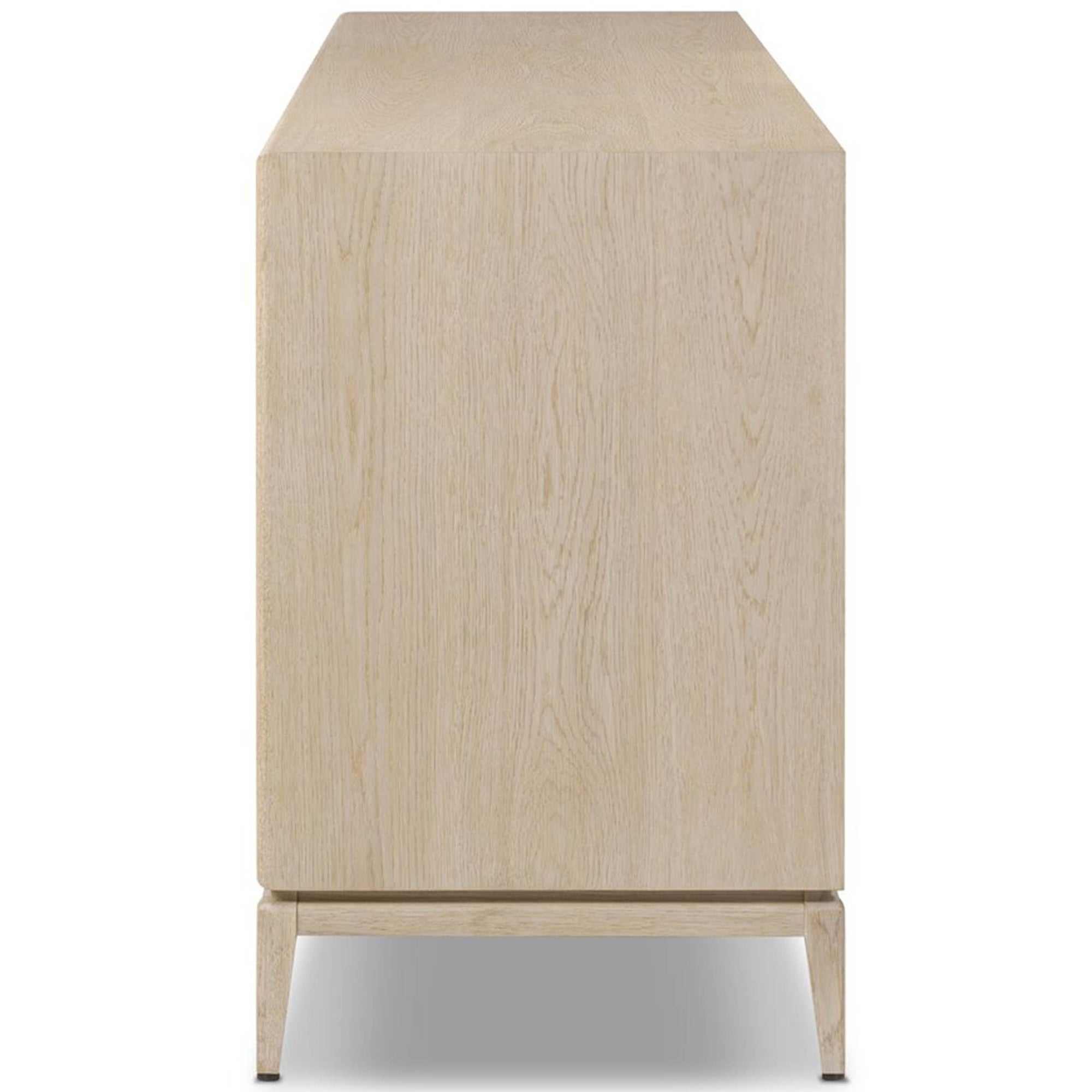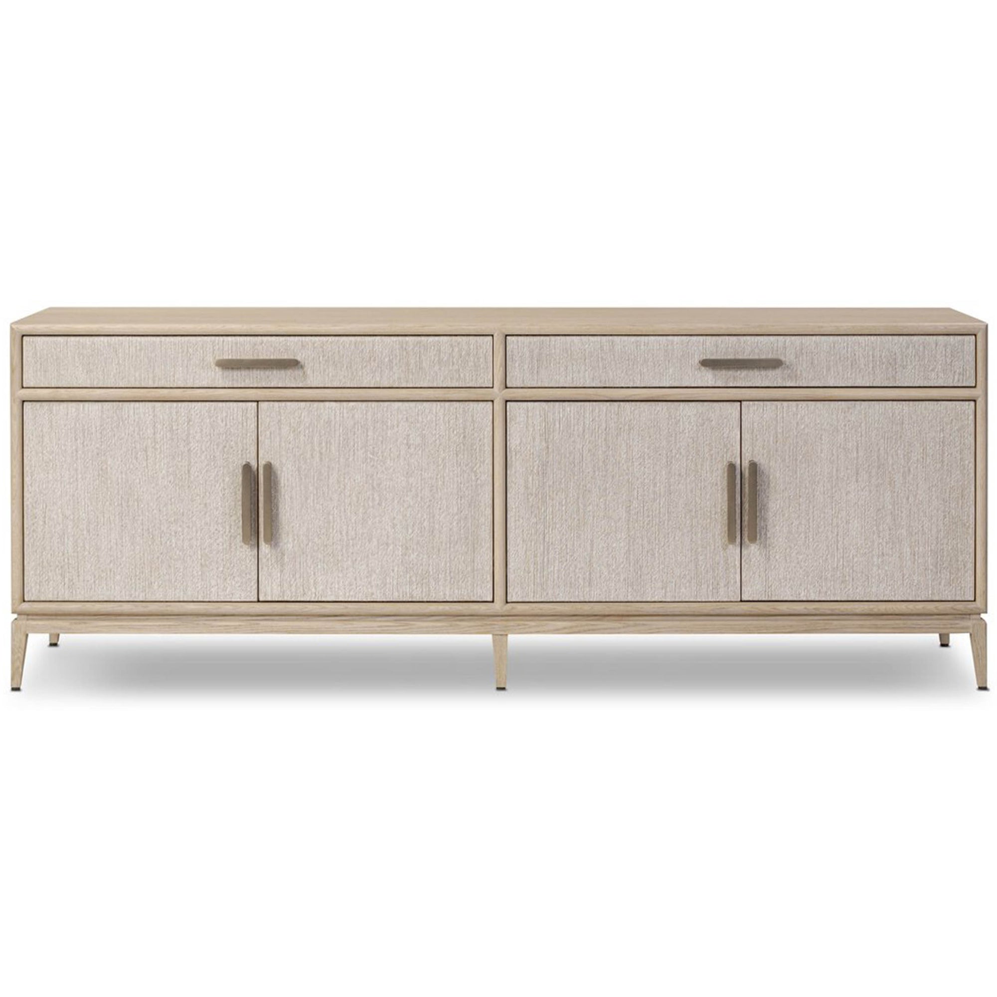 The Rosenell Sideboard blends Scandinavian-inspired design with versatile storage. Its black-finished oak construction features a smooth top surface, lower cabinetry, and upper drawers with woven paper cord fronts, adding a tactile contrast and timeless appeal to your dining space.