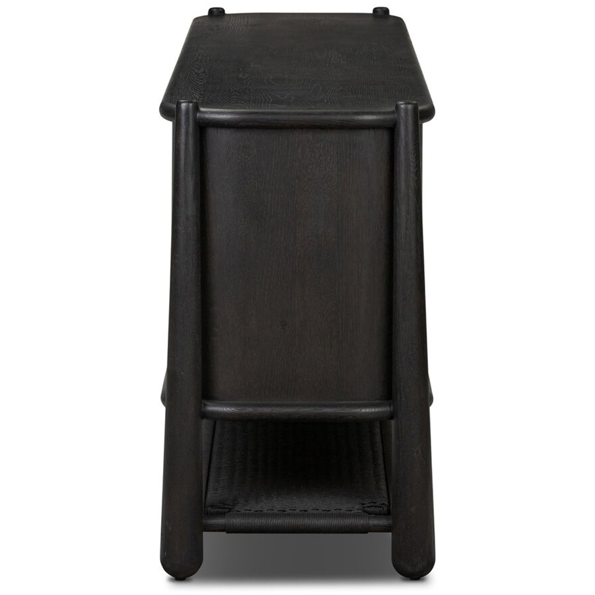 The Salvador Sideboard blends sculptural elegance with natural texture. Crafted from smoked black oak with visible knots and grain, this piece features tapered legs that pierce through the tabletop and a handwoven paper cord shelf. A design collaboration by Amber Lewis and Four Hands.