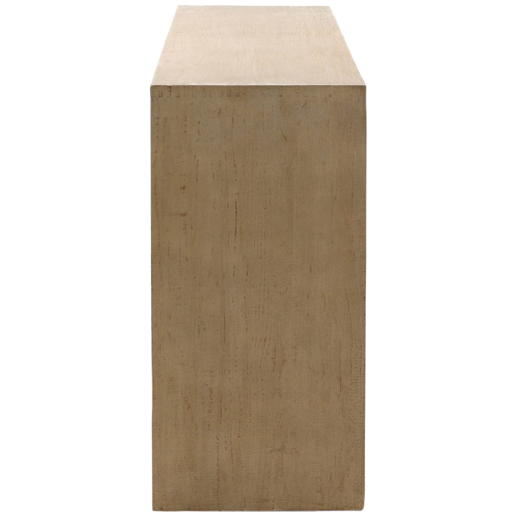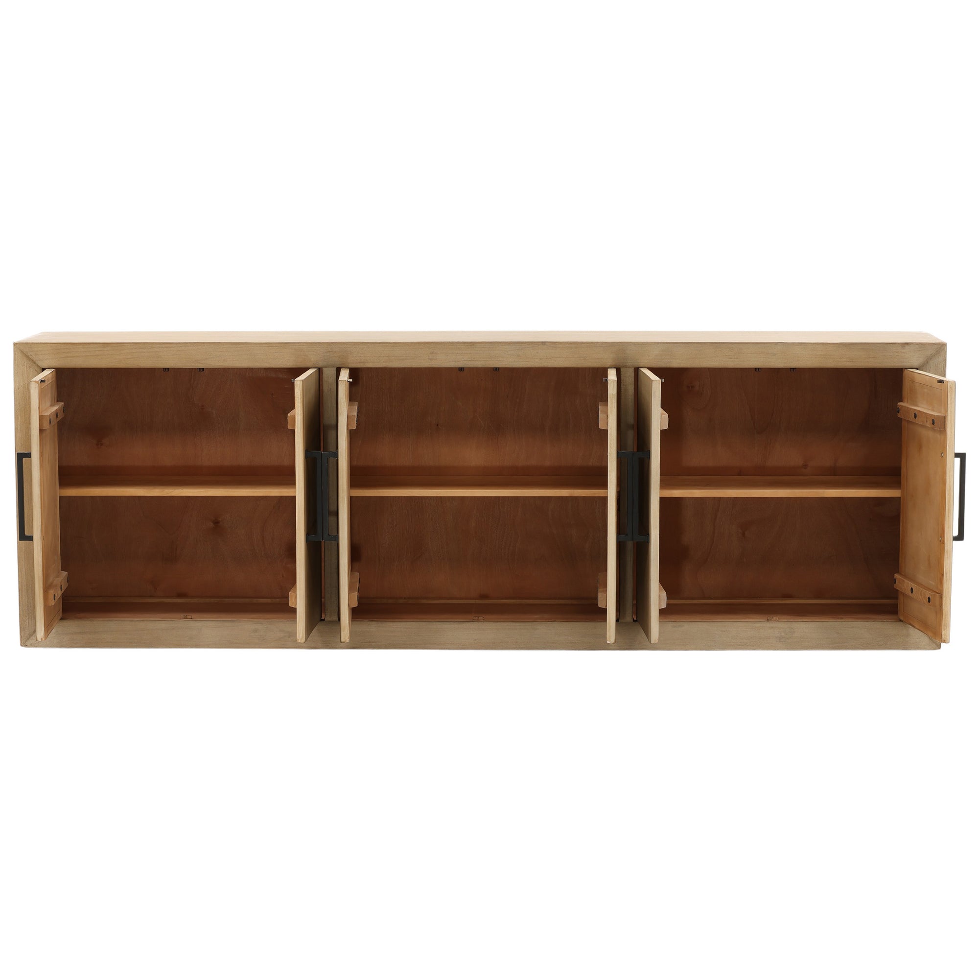 The Sonya Sideboard combines rustic appeal with practical storage. Crafted from reclaimed pine wood, it features a light grey wash finish that beautifully accentuates the wood's natural grain. Each piece is meticulously hand-finished, ensuring slight variations that make it truly one-of-a-kind. Behind its four doors, you'll find two spacious internal shelves, perfect for organizing your dining and living essentials. The Sonya Sideboard is a stylish and functional addition, bringing unique character to any home.