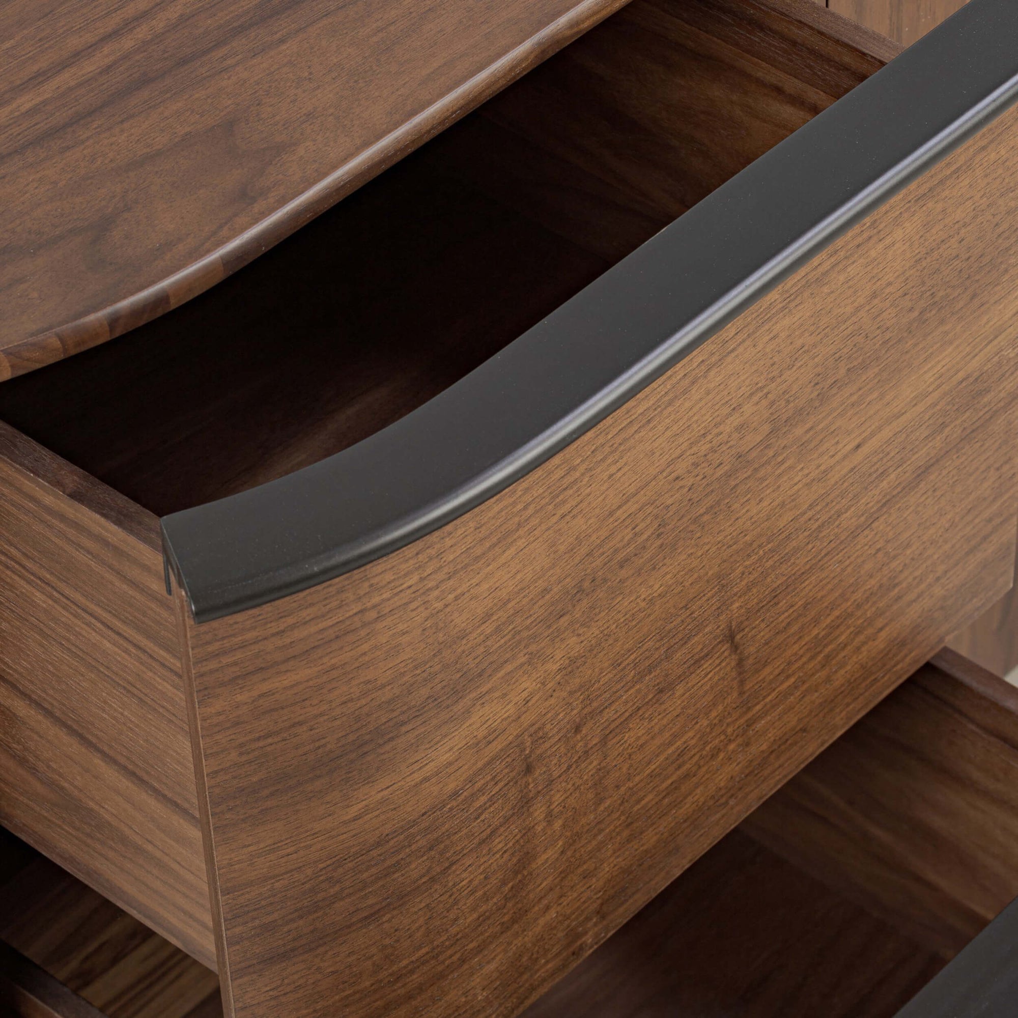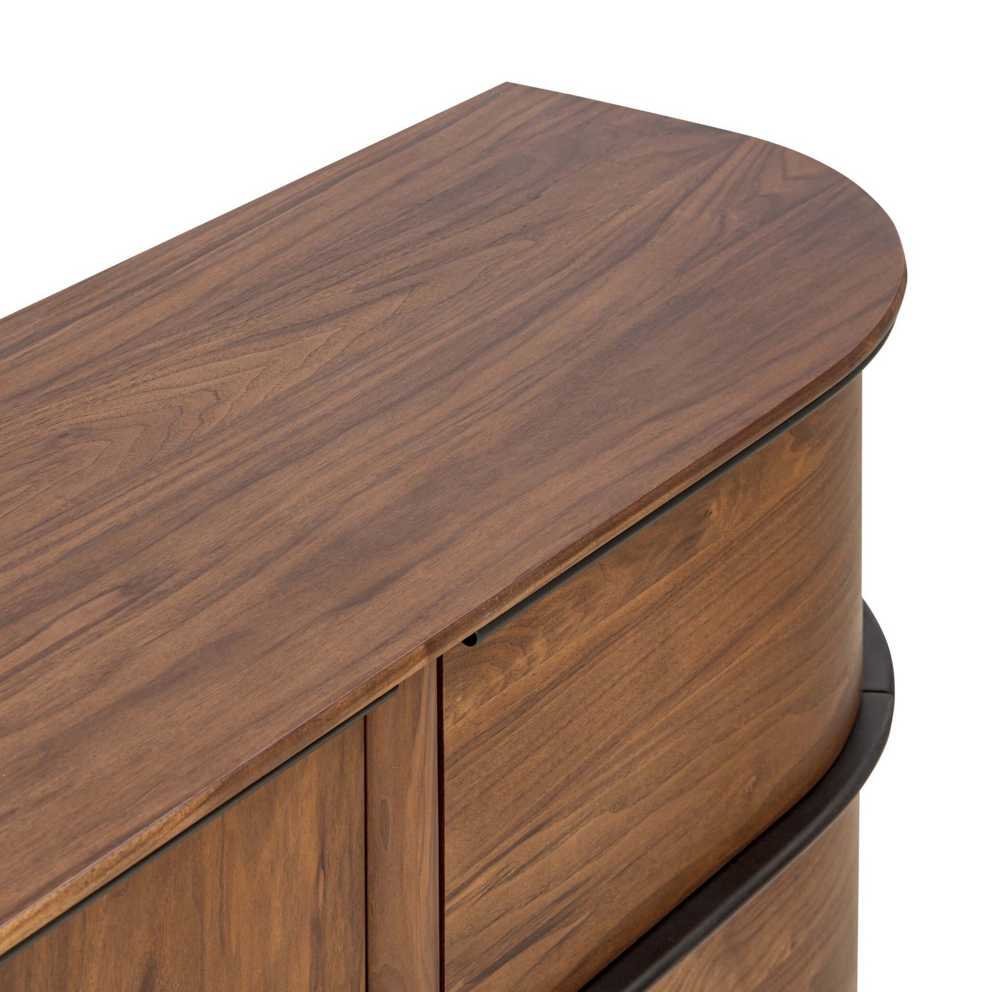 The Theo Sideboard blends sculptural form with functional storage. Crafted from dark brown walnut, its fluid, rounded corners create a smooth, organic silhouette set atop a distinctive ski leg base. Four spacious drawers—two on each side—are accented with sleek metal bar hardware that runs cleanly along the top edges, enhancing the seamless design. At the center, a set of doors opens to accommodate larger items, offering versatile storage for dining essentials or living room pieces. With its warm finish and refined details, the Theo Sideboard adds a touch of modern sophistication to any space.