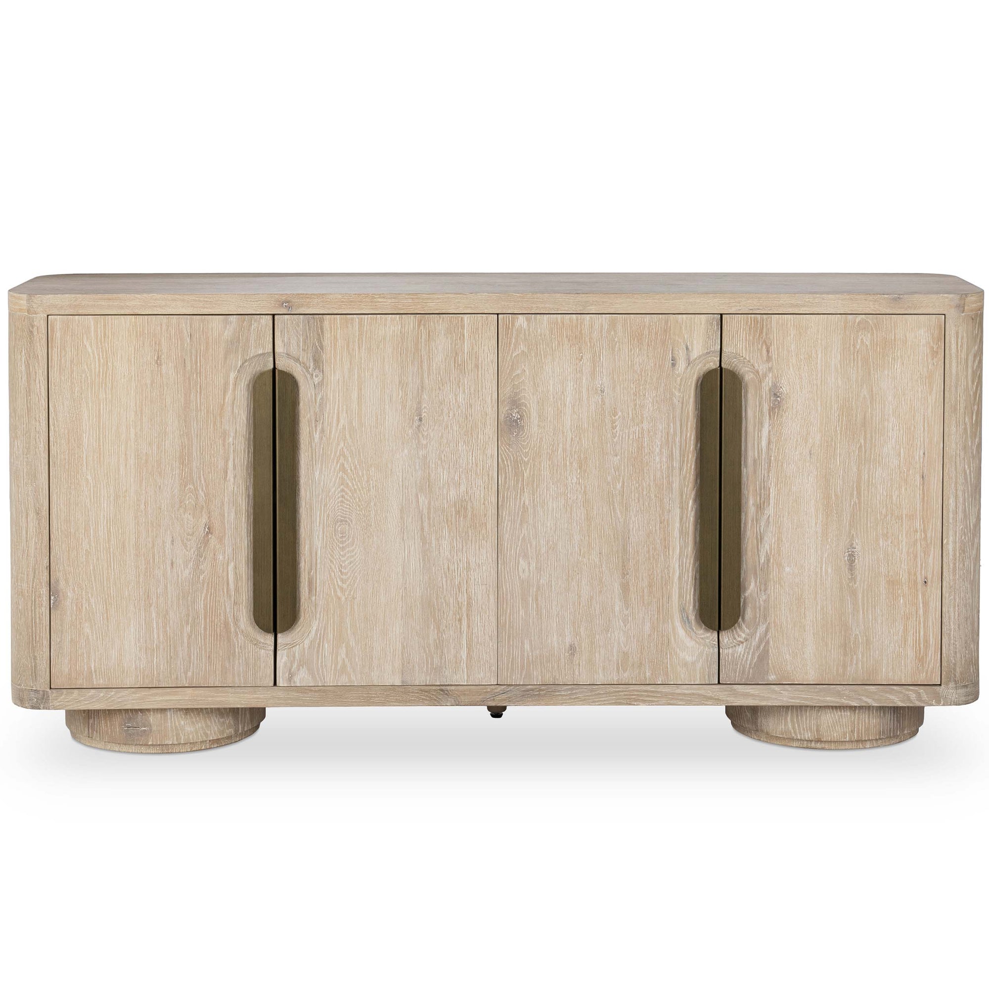 The Tiber Buffet is crafted from FSC® Certified oak veneer with a cream washed finish, featuring gently rounded curves that soften its modern silhouette. With four doors and spacious shelving, this buffet combines functional storage with refined style, adding an elegant touch to any dining or living space.