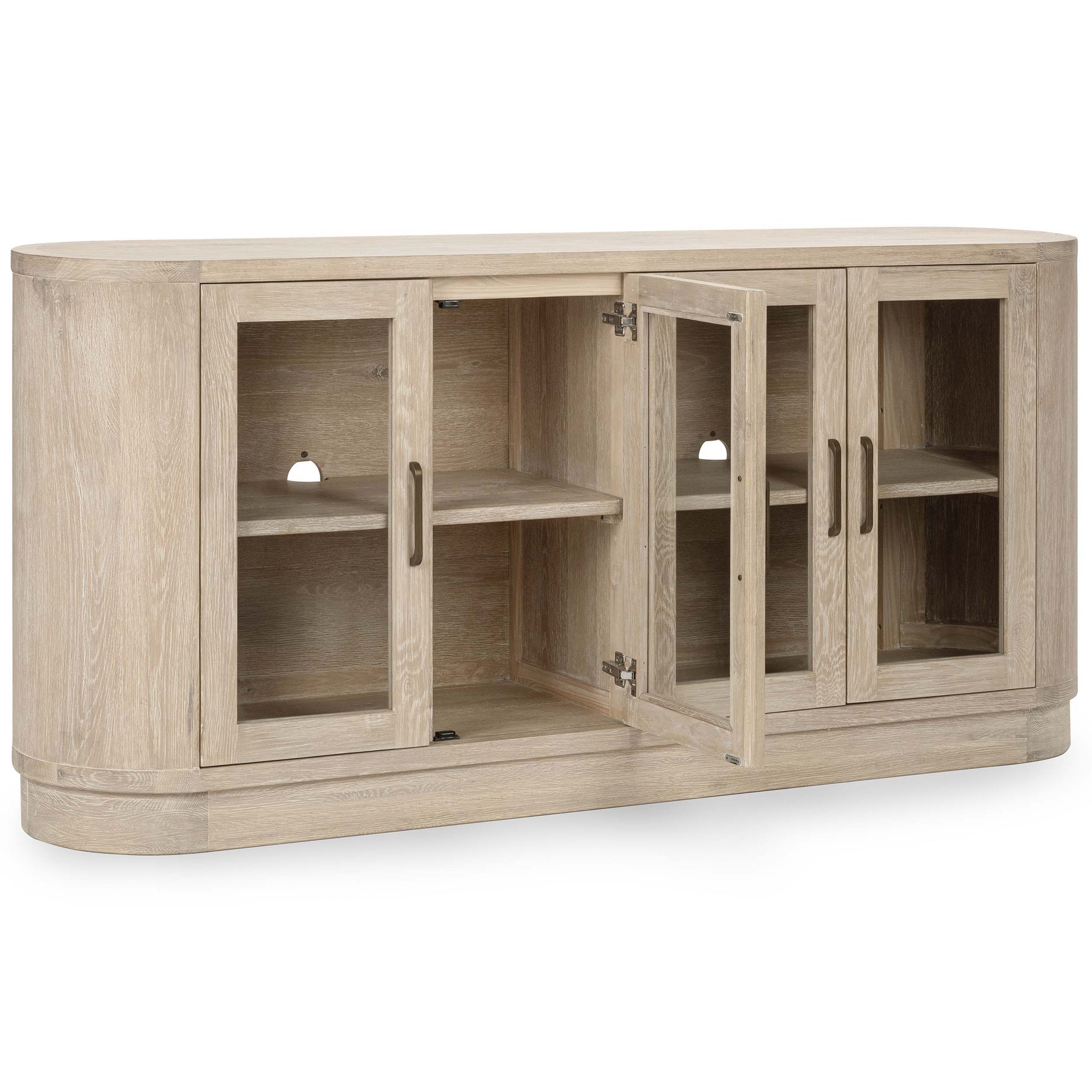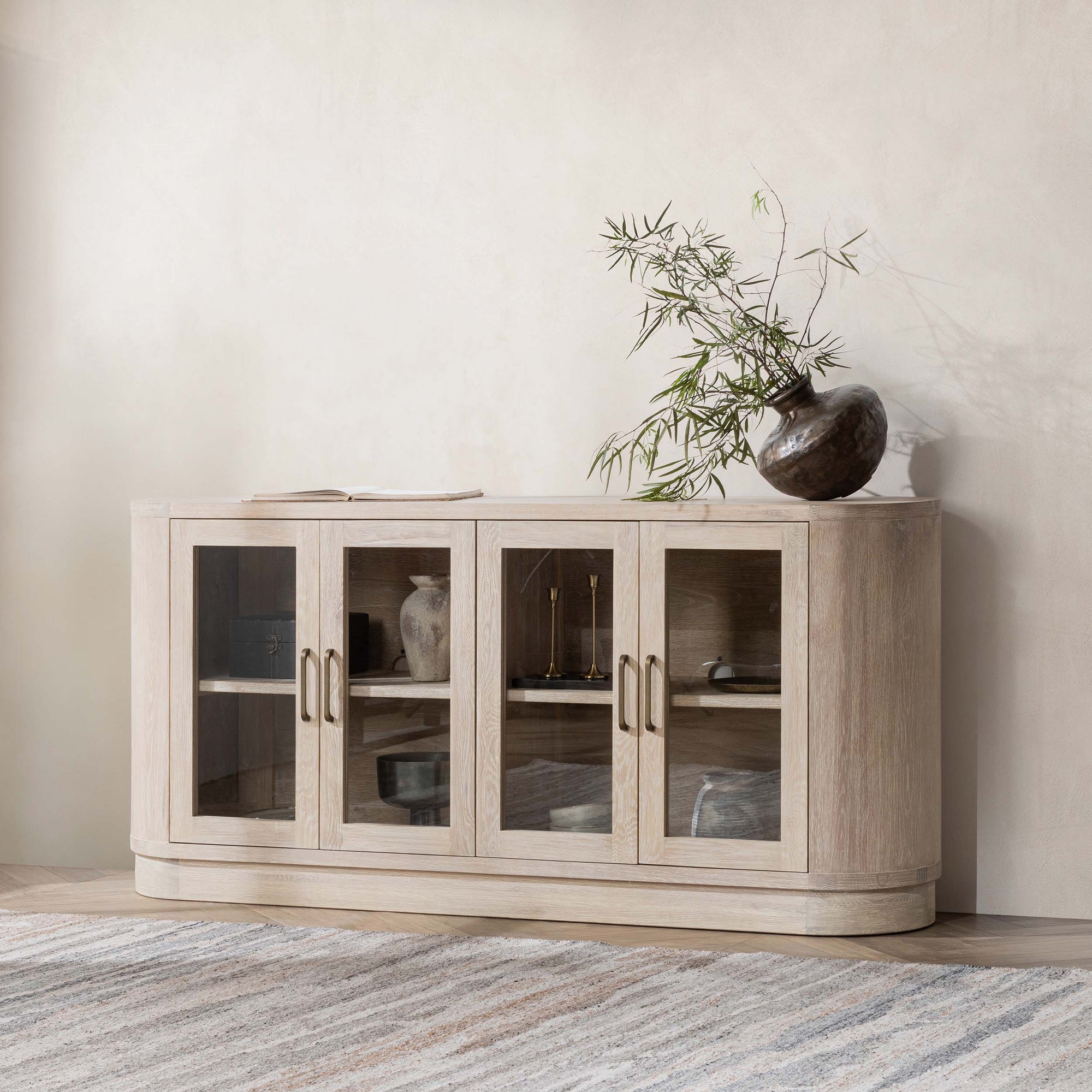 The Vander Buffet showcases FSC® Certified Oak Veneer craftsmanship with a cream washed finish, blending timeless elegance with functional design. Its four doors, including glass-front panels, beautifully display dinnerware while offering ample storage. Perfect for modern dining spaces seeking both style and sustainability.