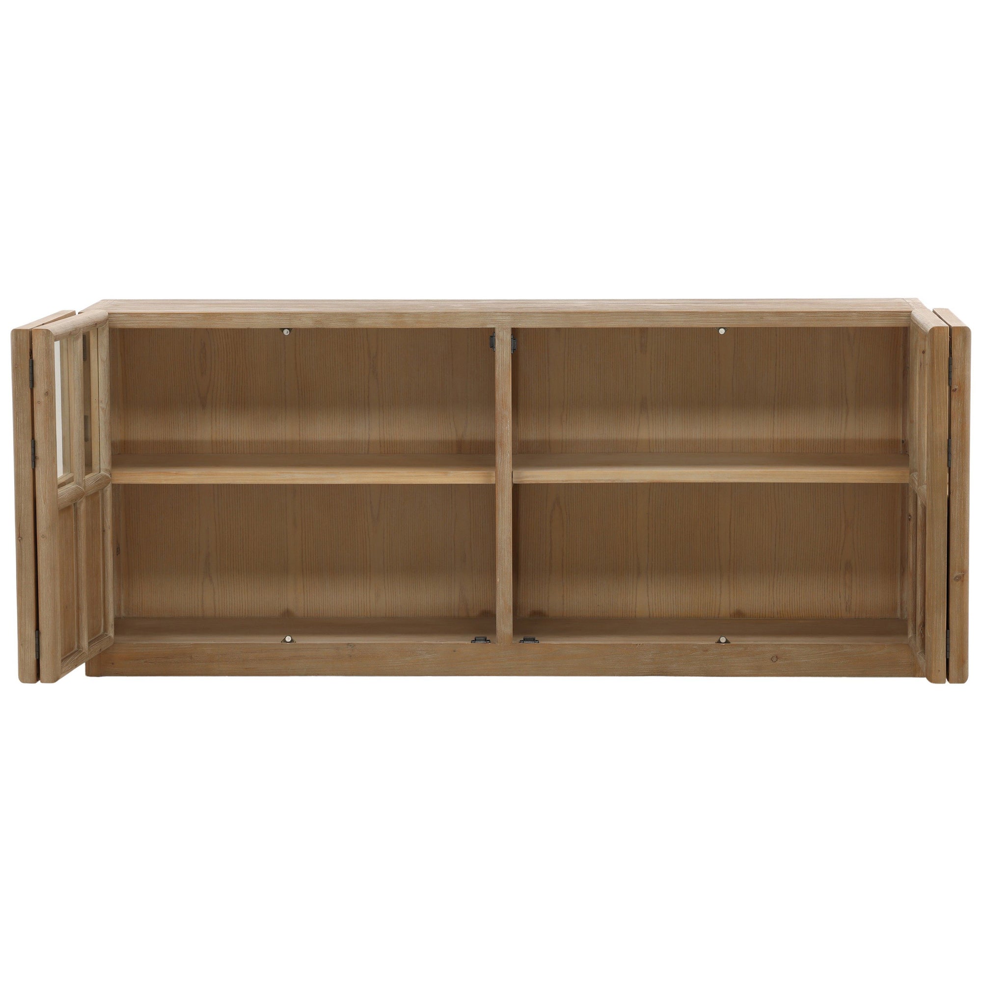 The Viviette Sideboard blends natural warmth with subtle sophistication. Crafted from reclaimed pine wood and glass, this sideboard features spacious cabinet storage behind elegant glass doors—perfect for showcasing dinnerware, decor, or everyday essentials. The handcrafted finish highlights the organic texture and grain variations of the wood, adding timeless appeal to any dining or living space.