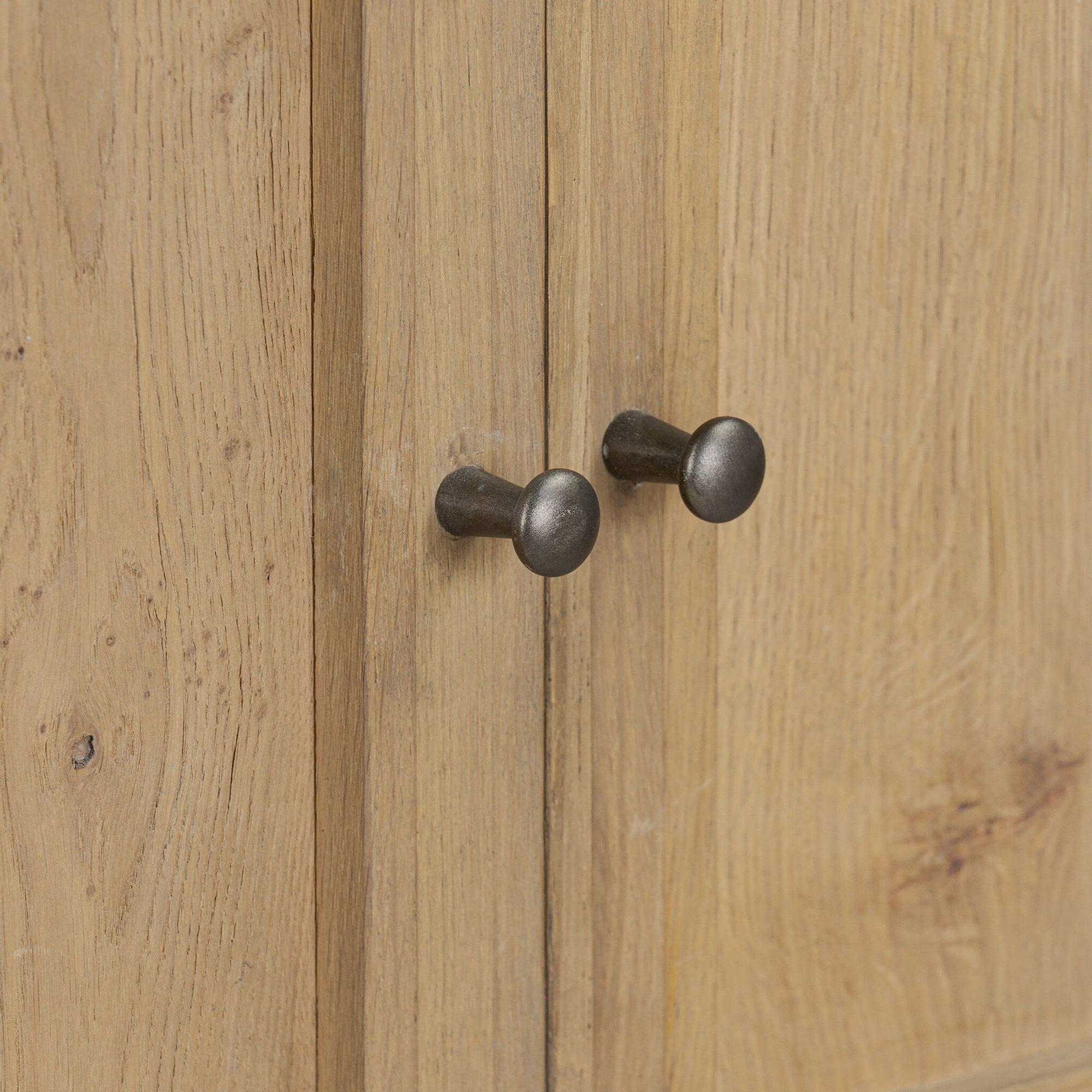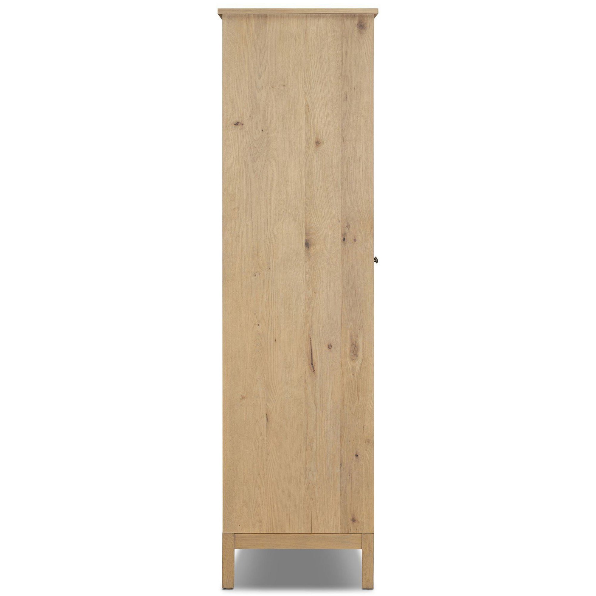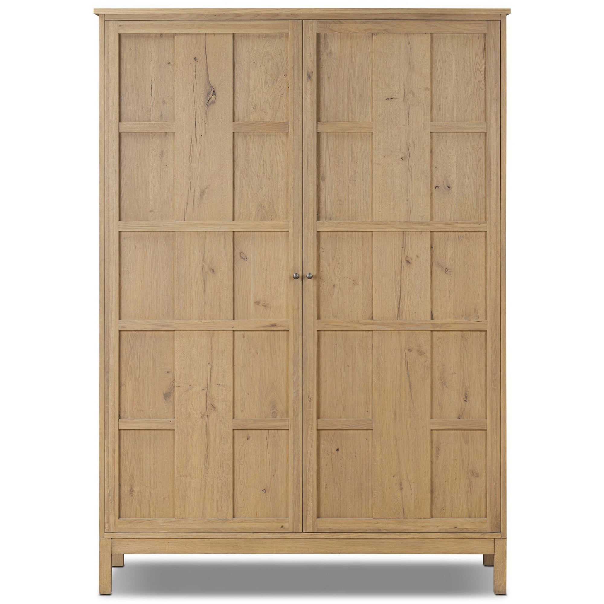The Alessio Cabinet is a spacious storage solution that integrates into any collection with ease. This solid oak cabinet features a light finish that beautifully highlights the natural wood cracks and graining inherent to rich character woods. Grid-like patterned doors bring dimension to the clean, simple shaping, while interior shelving keeps items organized and protected. Pieces vary; knots and cracks are common and reflect the beautifully natural character of the oak.