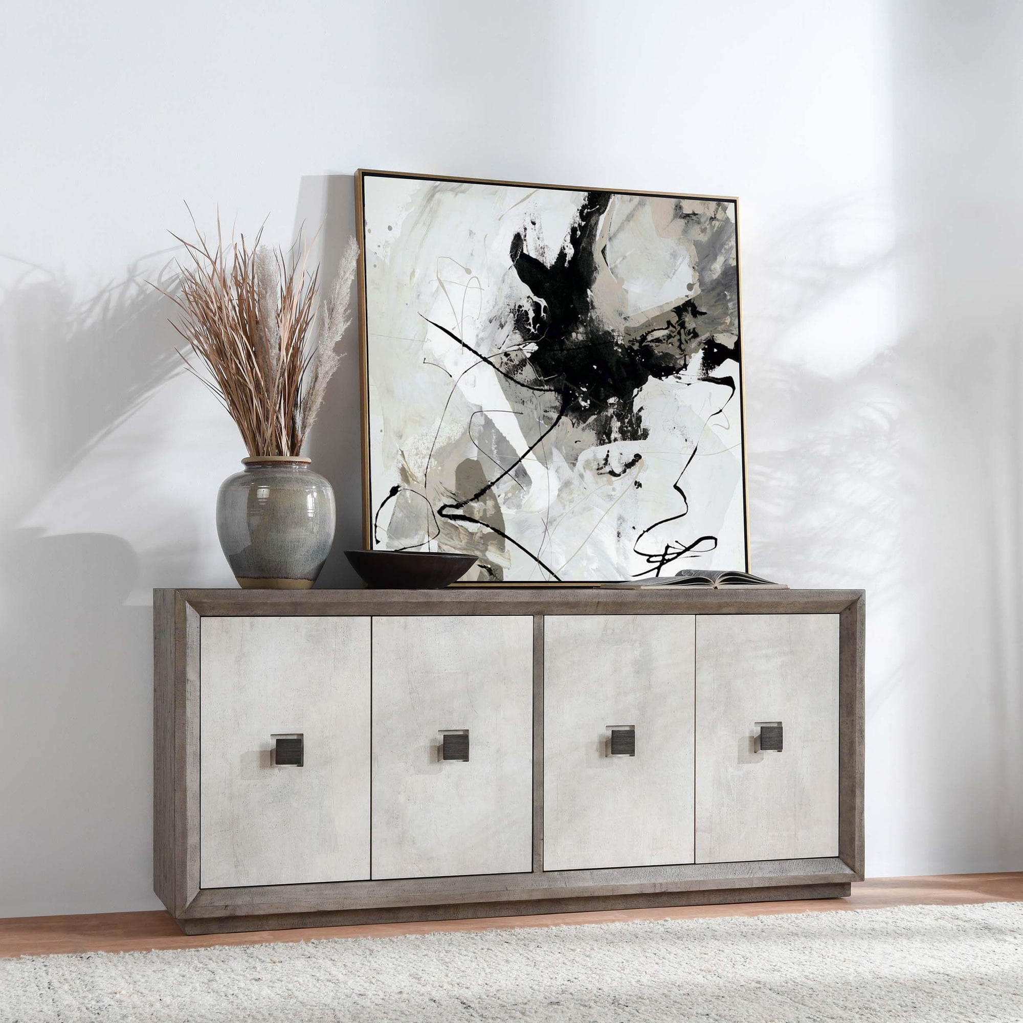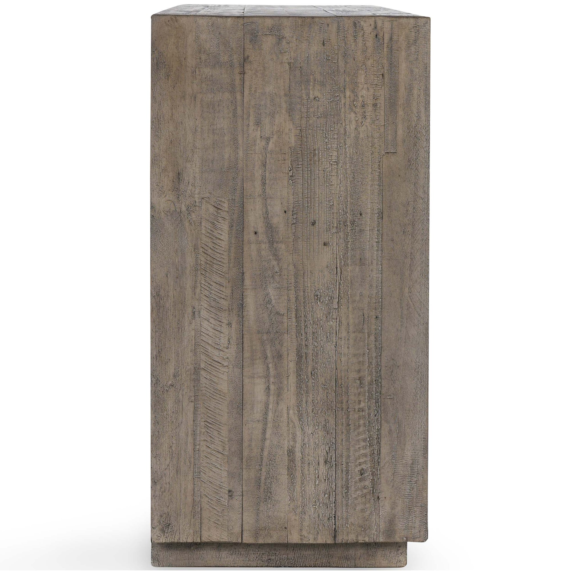 The Denver Cabinet is crafted from reclaimed pine with a laminate finish, featuring a distressed gray and antique white palette that highlights the wood’s natural grain. Its four doors provide ample storage, while the clean geometric lines and hand-applied finishes add a touch of modern sophistication. Perfect for sustainable and stylish living spaces.