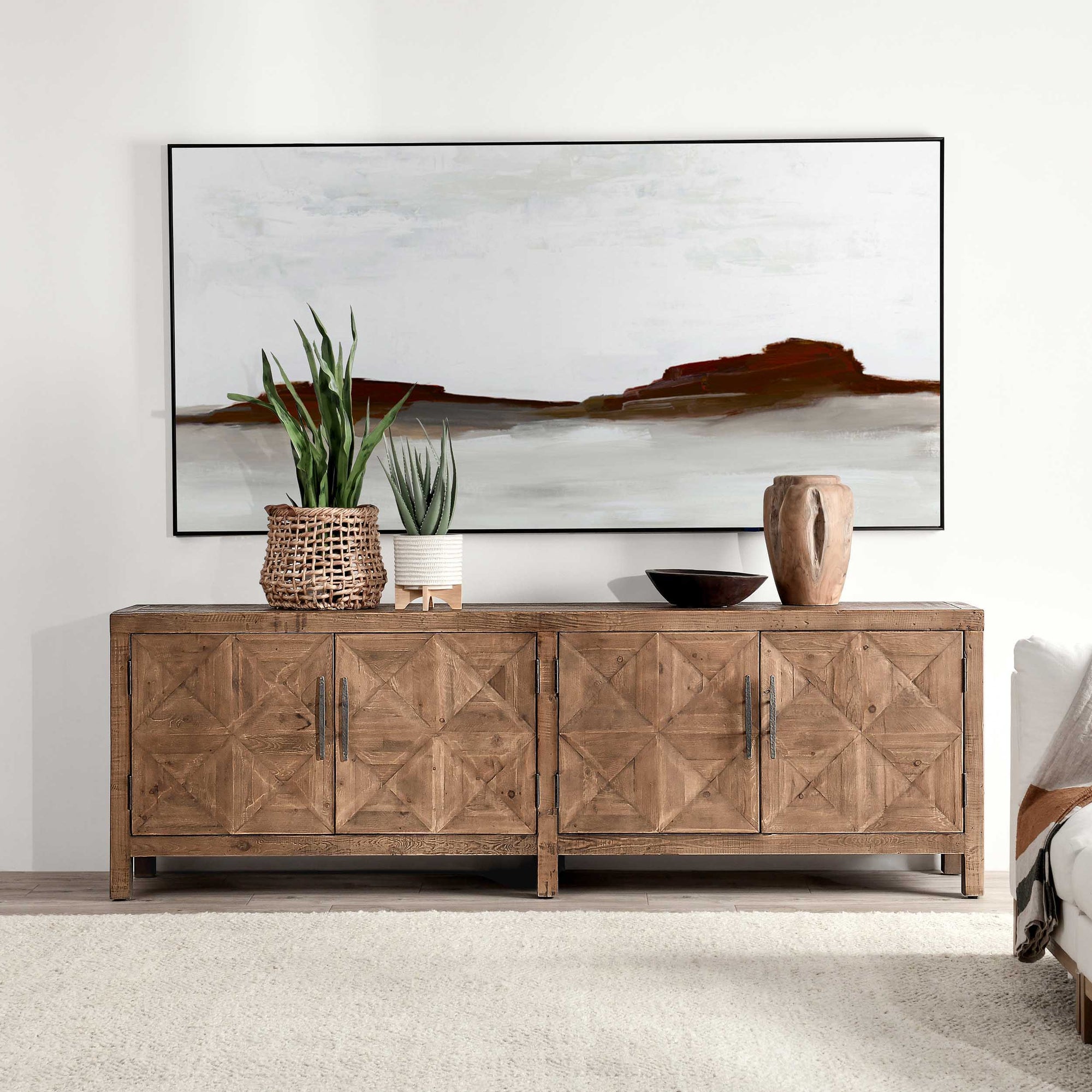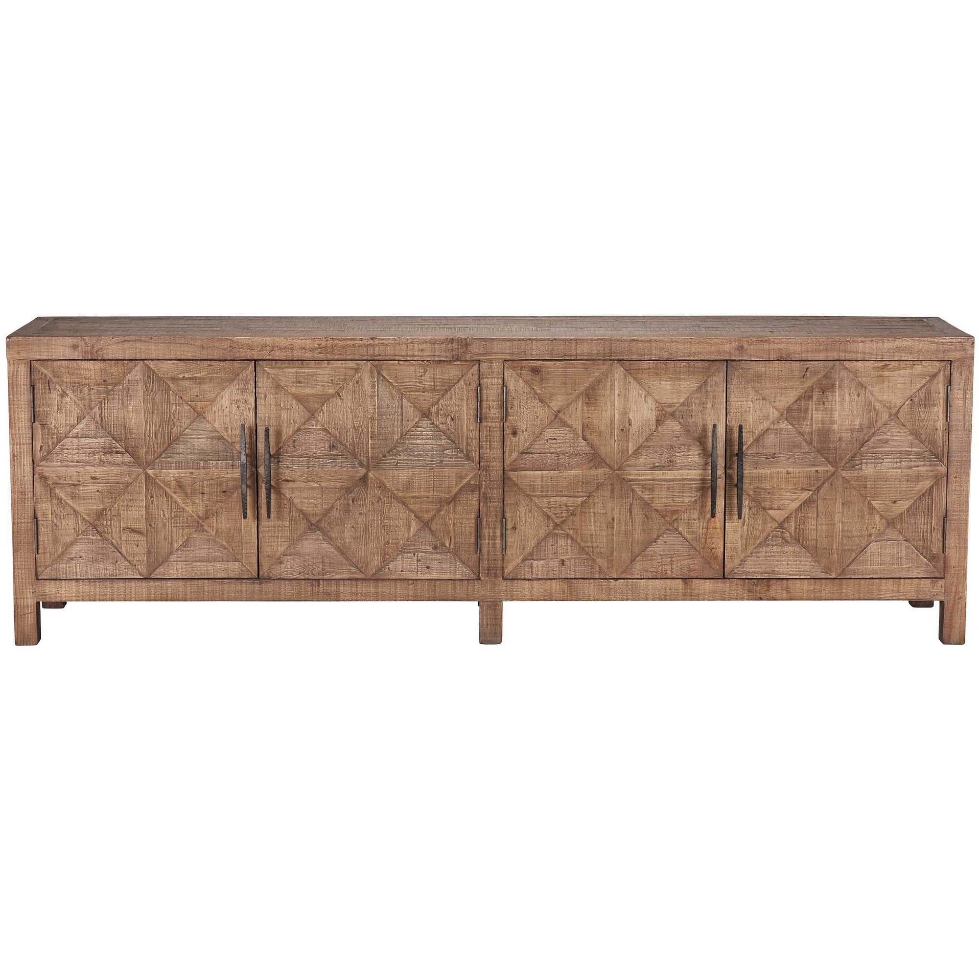 The Elani 4 Door Cabinet showcases rustic charm and artisanal craftsmanship with its reclaimed pine construction and intricate geometric door detailing. Combining functionality with style, this sideboard offers ample storage while enhancing any living or dining space.