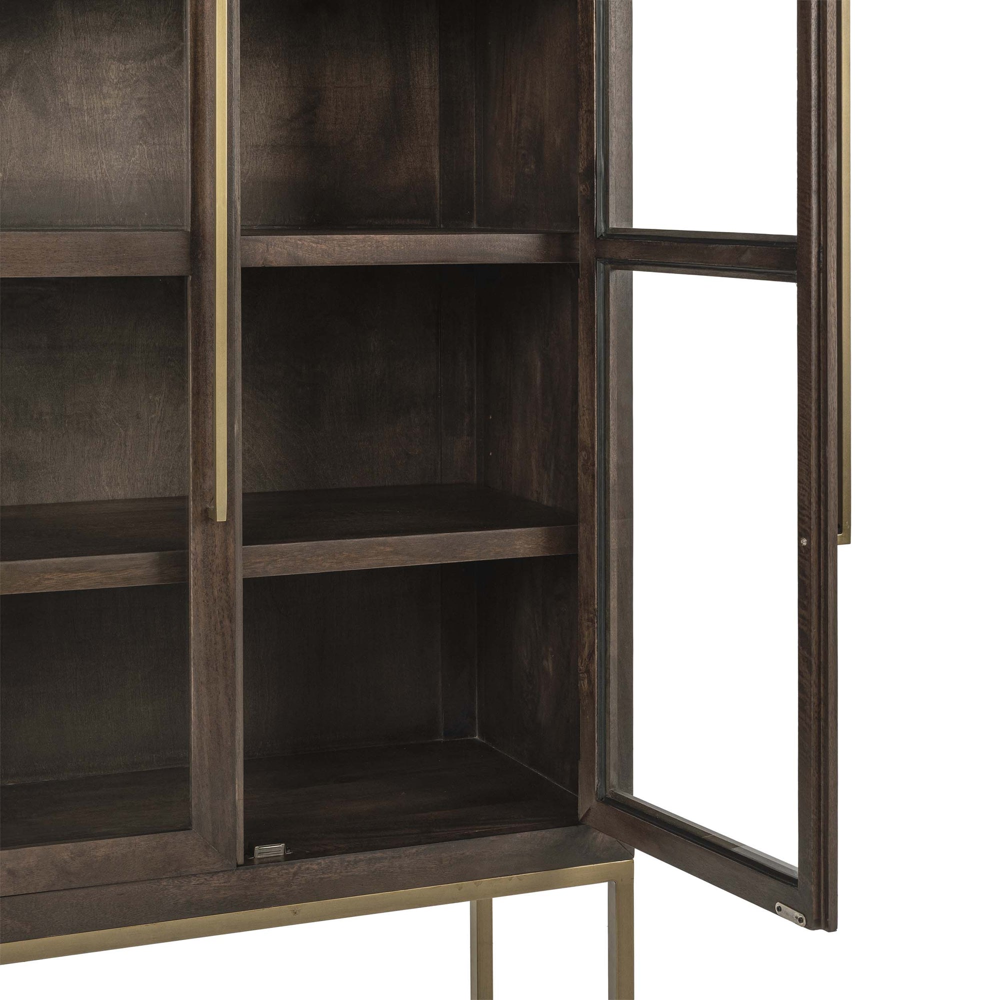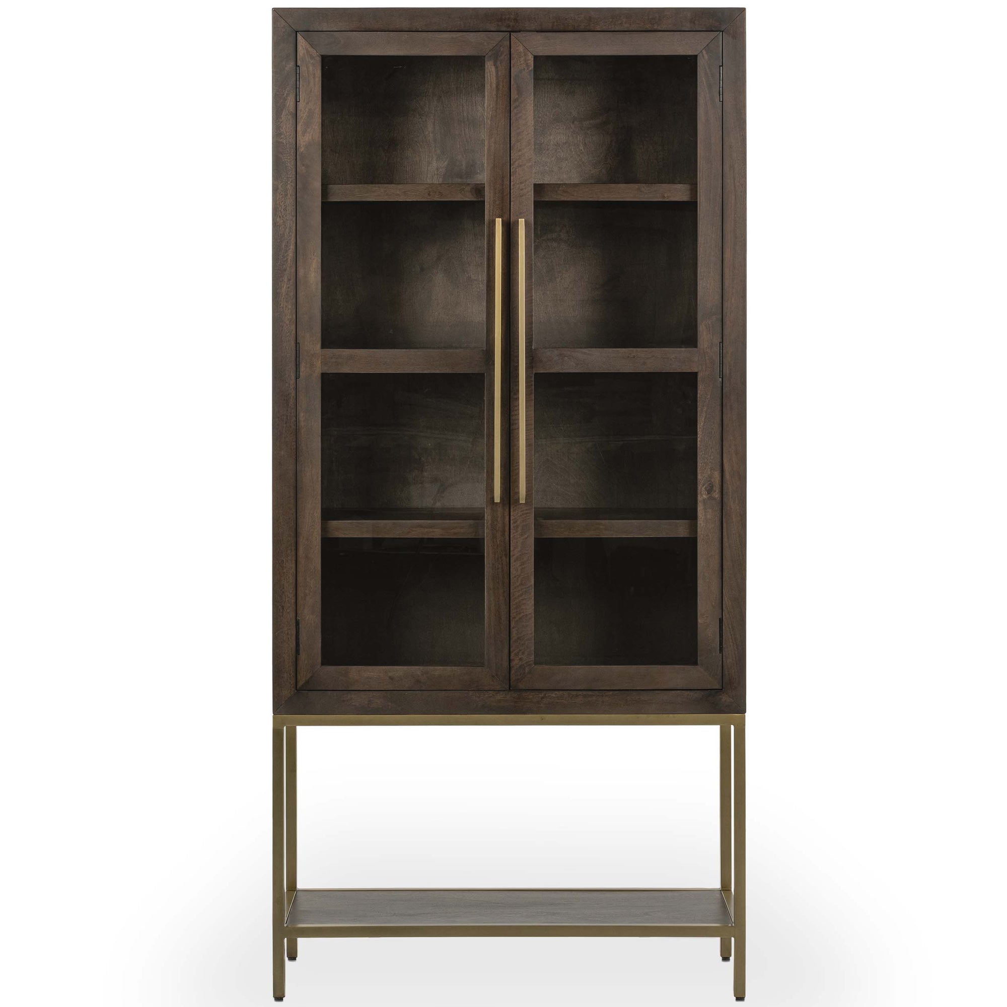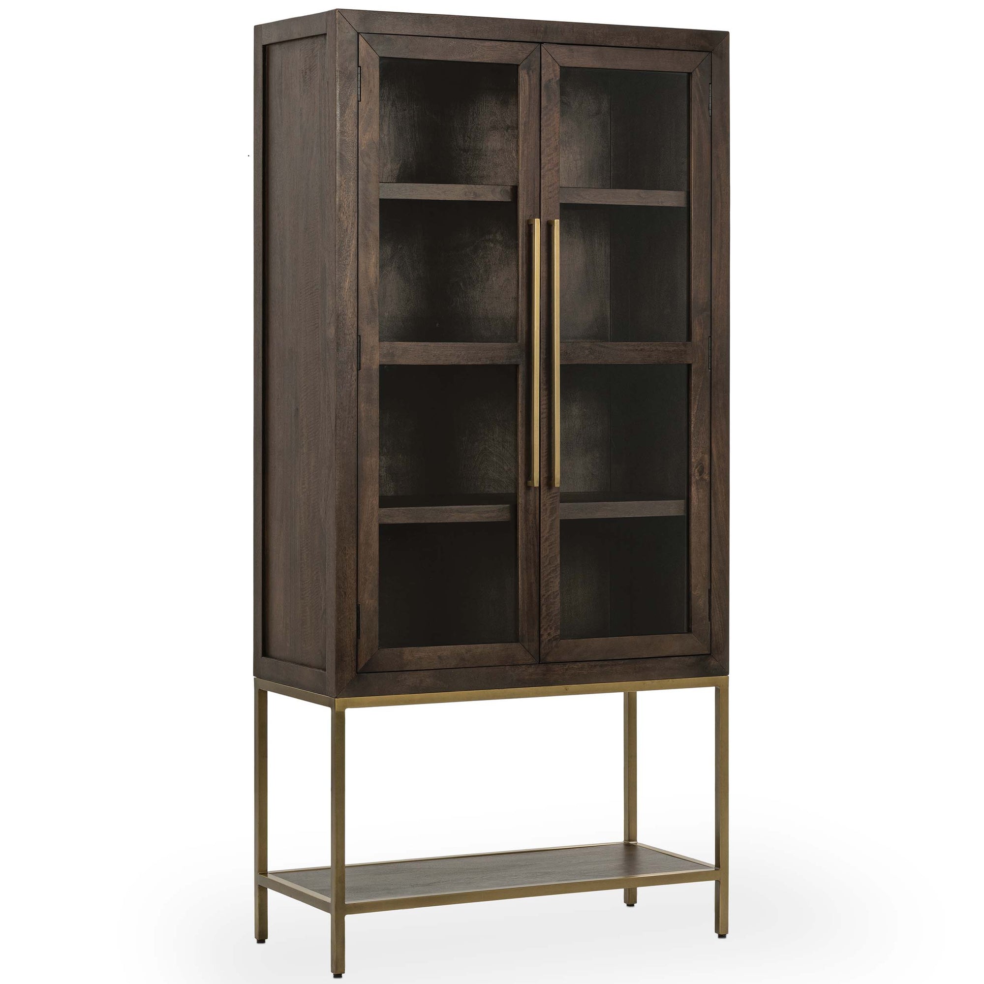 The Freemont Tall Cabinet features a mango wood frame with tempered glass doors and elongated metal pulls. Designed with a combination of fixed and adjustable shelves, it provides versatile storage while maintaining a sleek, airy aesthetic. Elevated on a minimalist metal base, this cabinet blends bold structure with refined sophistication.