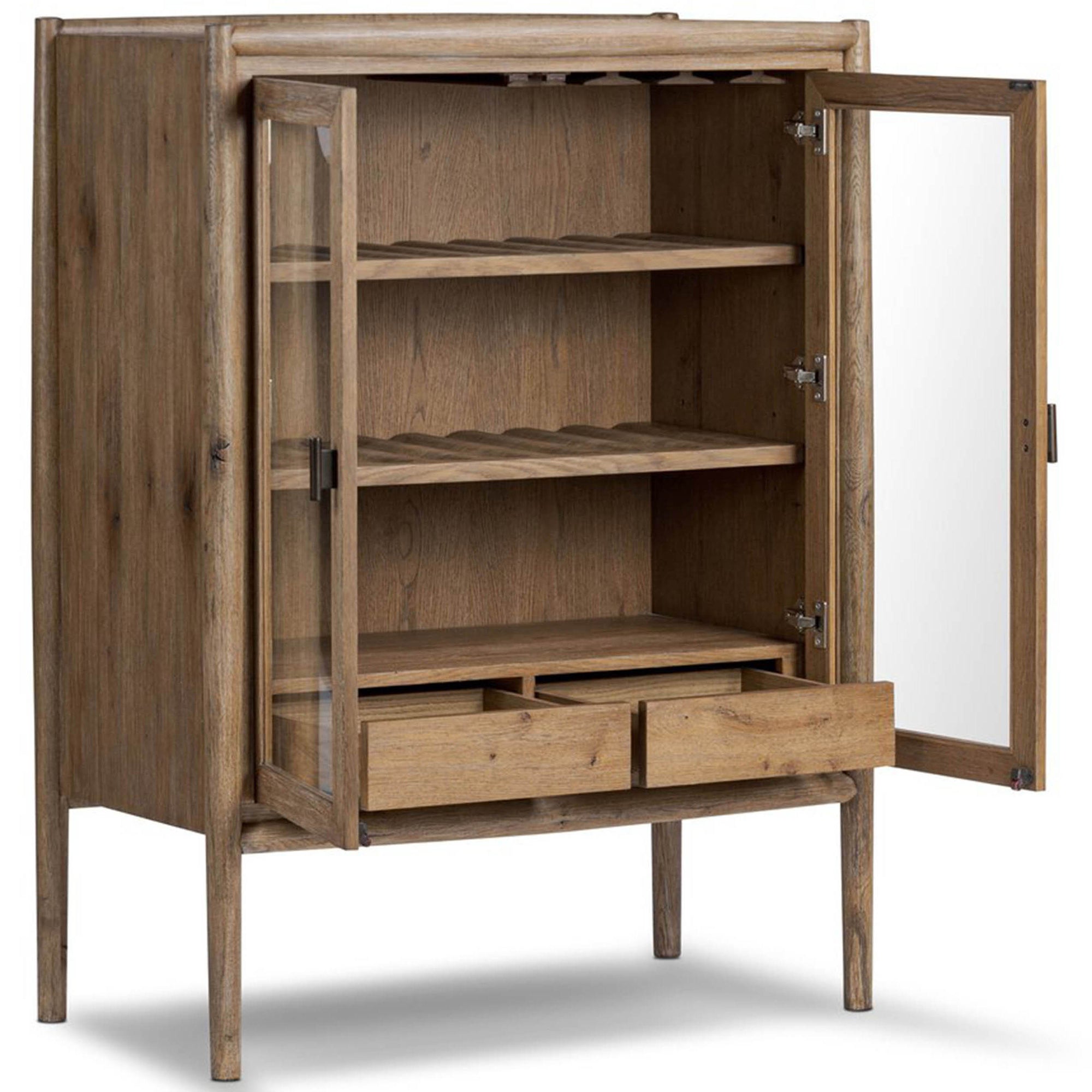 The Glenview Bar Cabinet features rustic oak with subtly rounded corners and minimalist lines. Functional drawers, interior shelving, stemware racks, and a bottle rack offer ideal bar storage, while glass front doors and aged bronze hardware add refined charm.