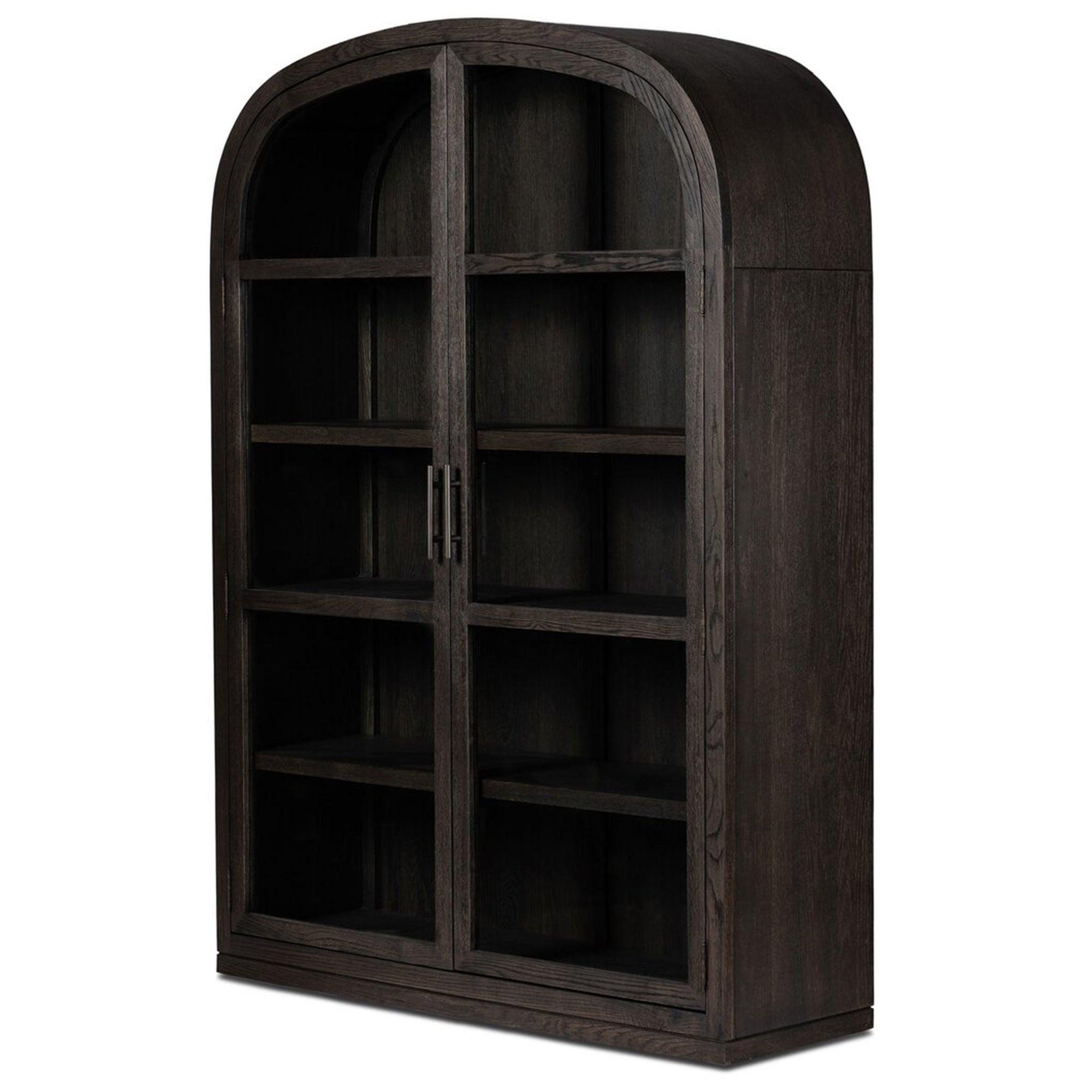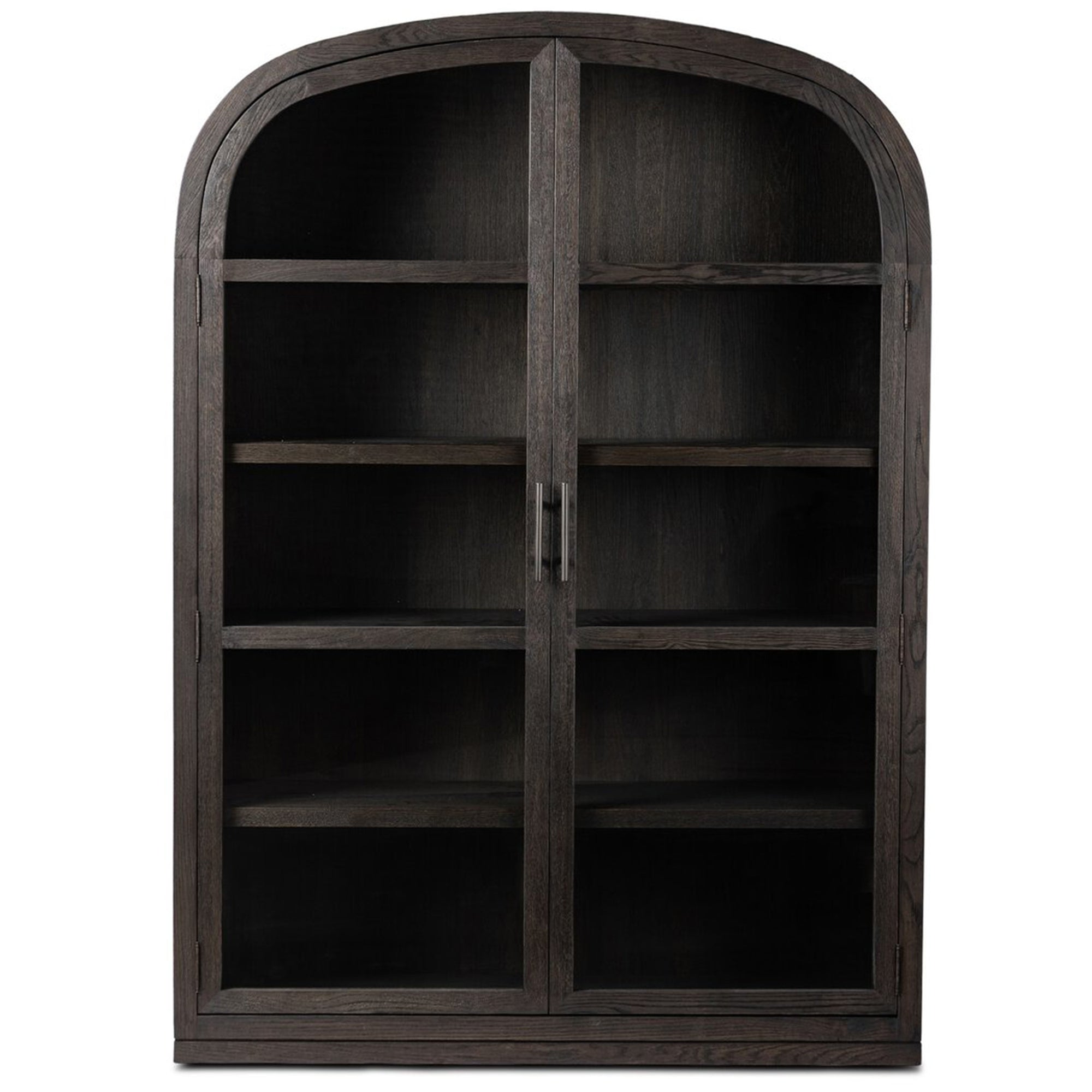 The Hepburn Wide Cabinet features rounded sides and a dark anthracite oak finish that adds depth and sophistication to any interior. Clear tempered glass doors reveal spacious shelving inside, perfect for displaying books, décor, or keepsakes. Combining functionality with refined style, this cabinet serves as both a storage solution and a statement piece in your home.