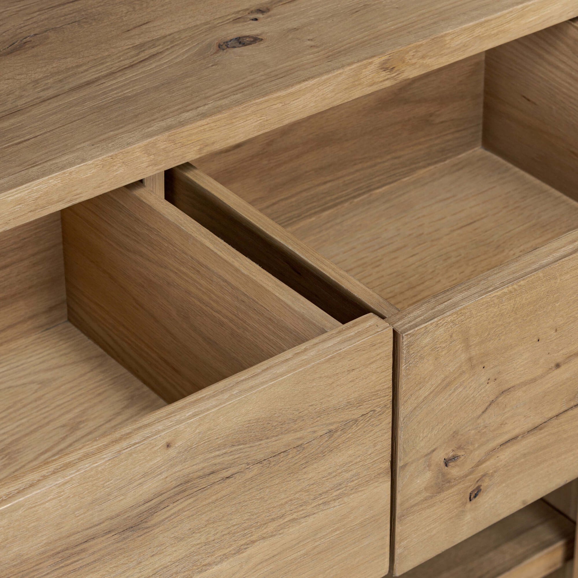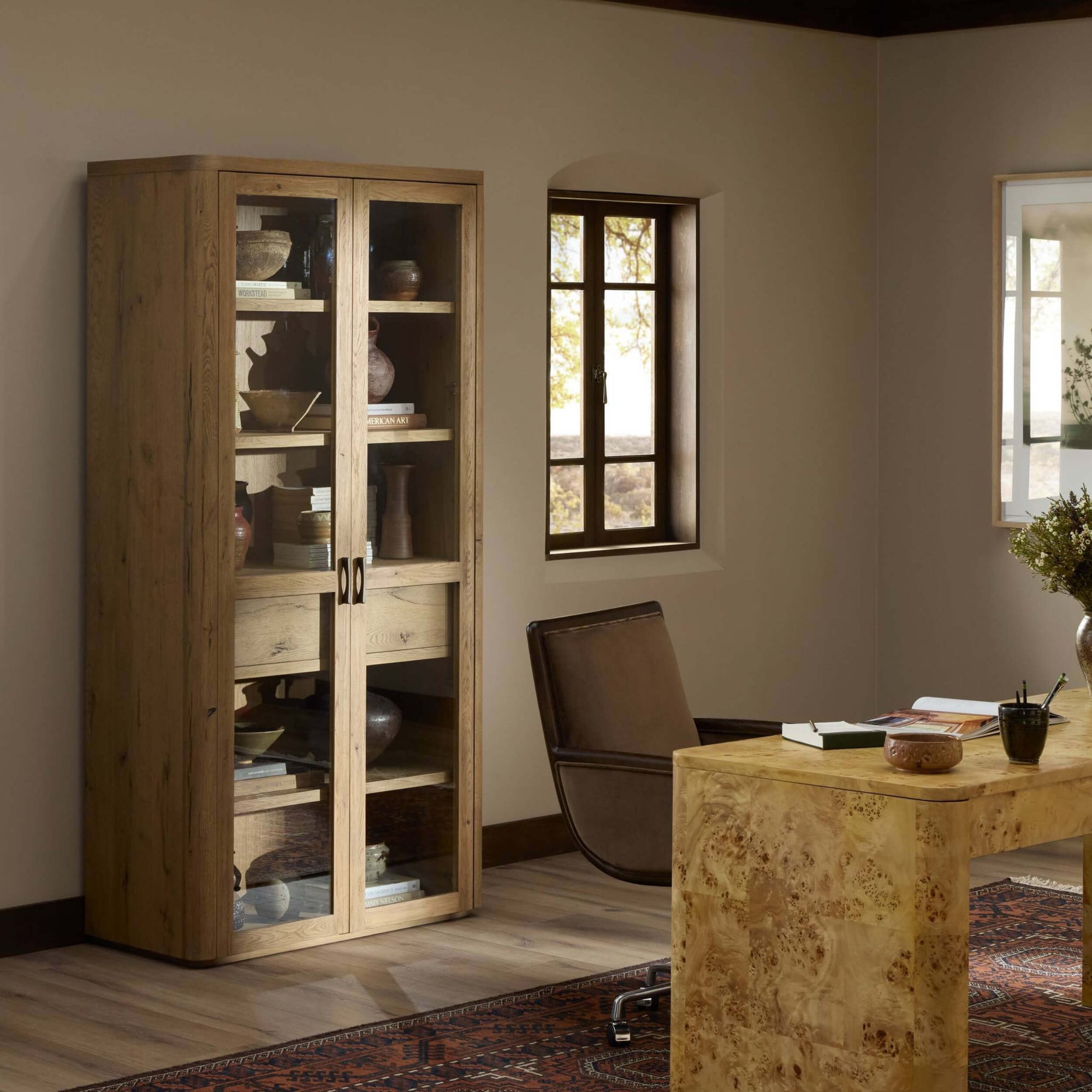 Crafted from smoked oak, the Stanton Cabinet blends classic style with everyday function. Two drawers and multiple shelves offer a balanced mix of open and closed storage, ideal for organizing everything from books to serveware. Whether styled solo or placed in multiples for a built-in look, this versatile piece brings warmth and structure to any space. Clean lines and a timeless finish make it a natural fit for both modern and traditional interiors.