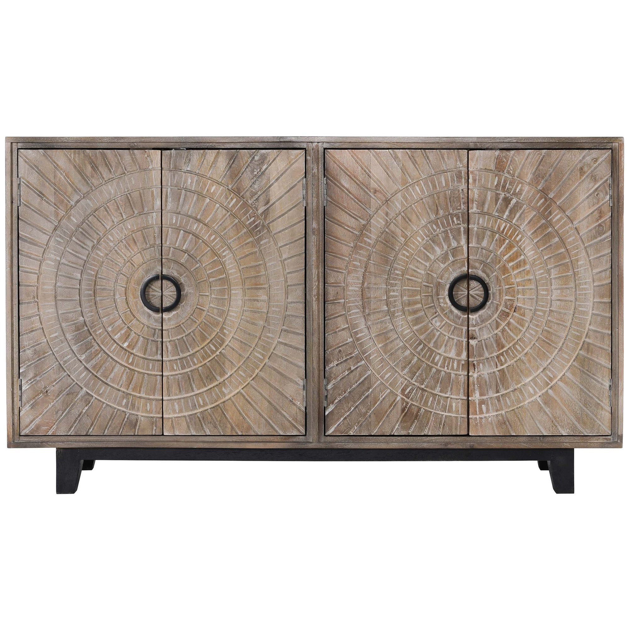 The Vivienne 4 Door Cabinet showcases hand-carved details on rich mango wood with a distressed bark brown finish. Metal hardware accents provide durability and a touch of elegance, while its spacious interior offers functional storage for a stylish and organized home.