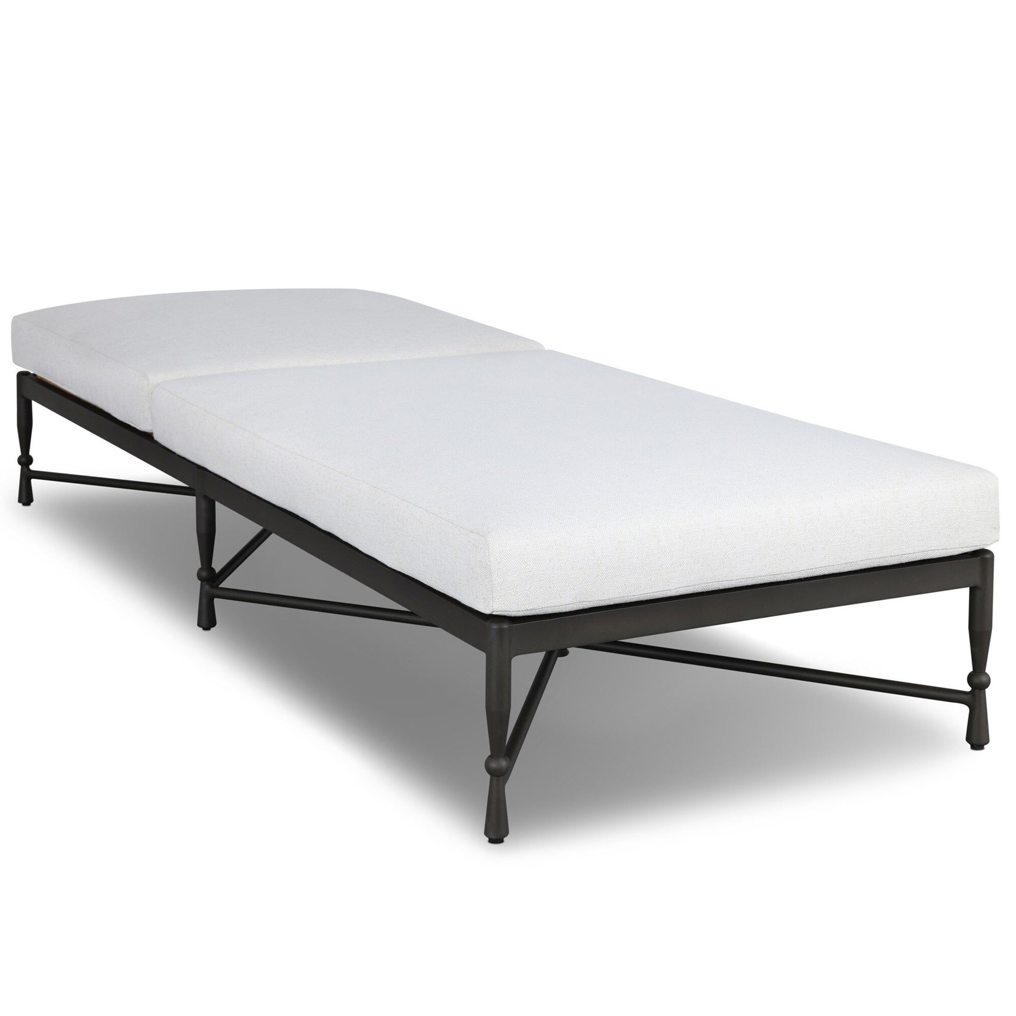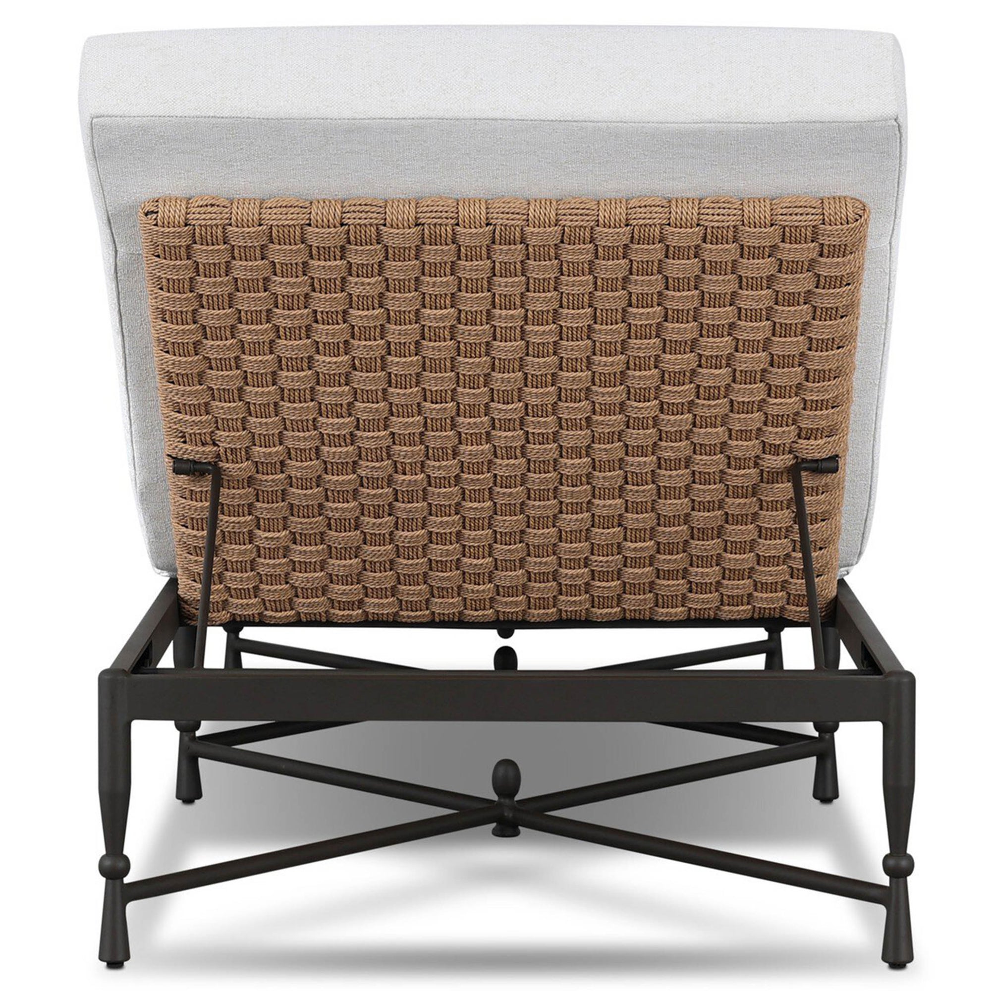 The Brenton Outdoor Chaise introduces a mix of traditional shaping and textural elements for enhanced character. Cast aluminum frames a basket-woven seatback and an upholstered seat, finished with classic turned detailing. This chaise is part of a design collaboration by Amber Lewis and Four Hands and features cushions with performance-grade, removable casings.