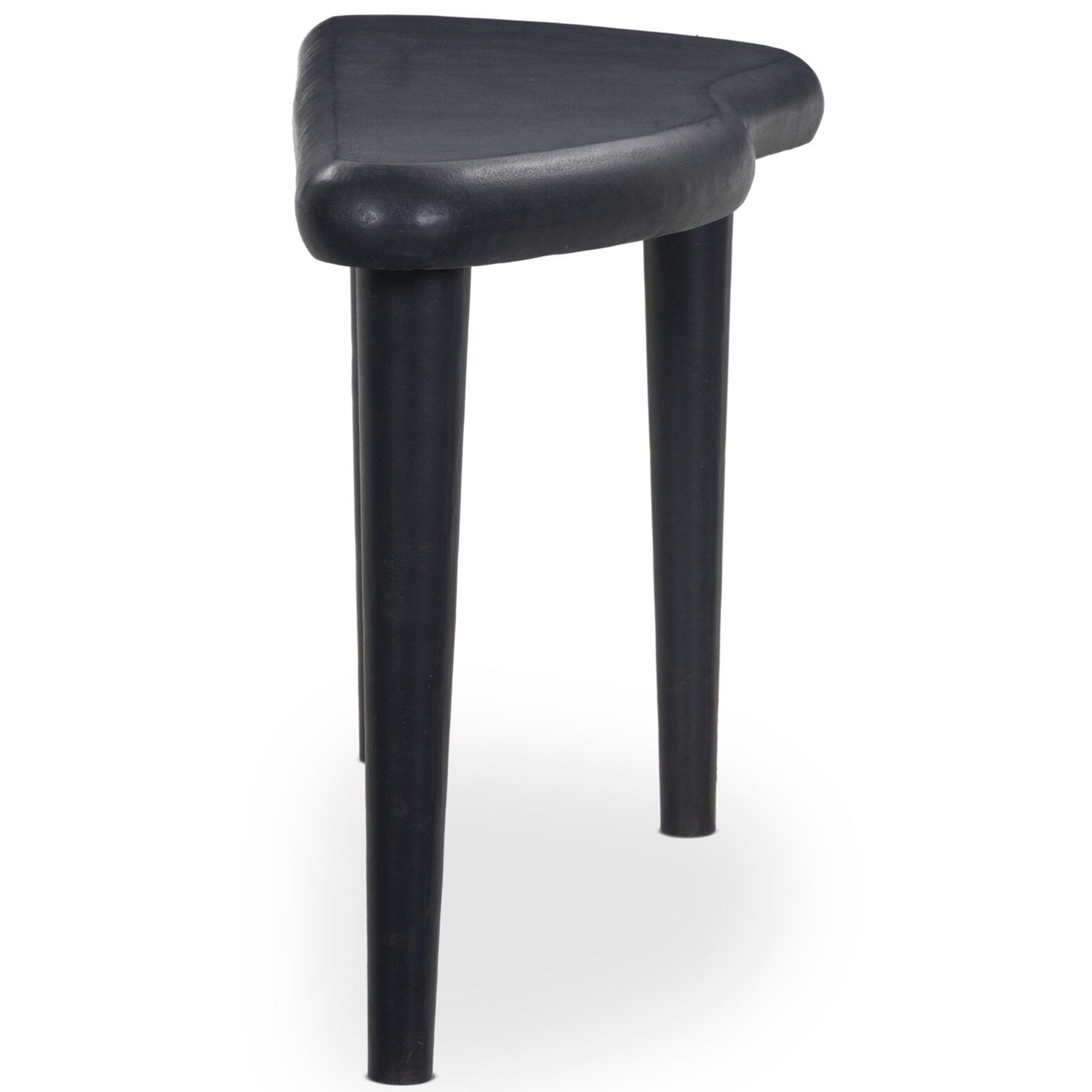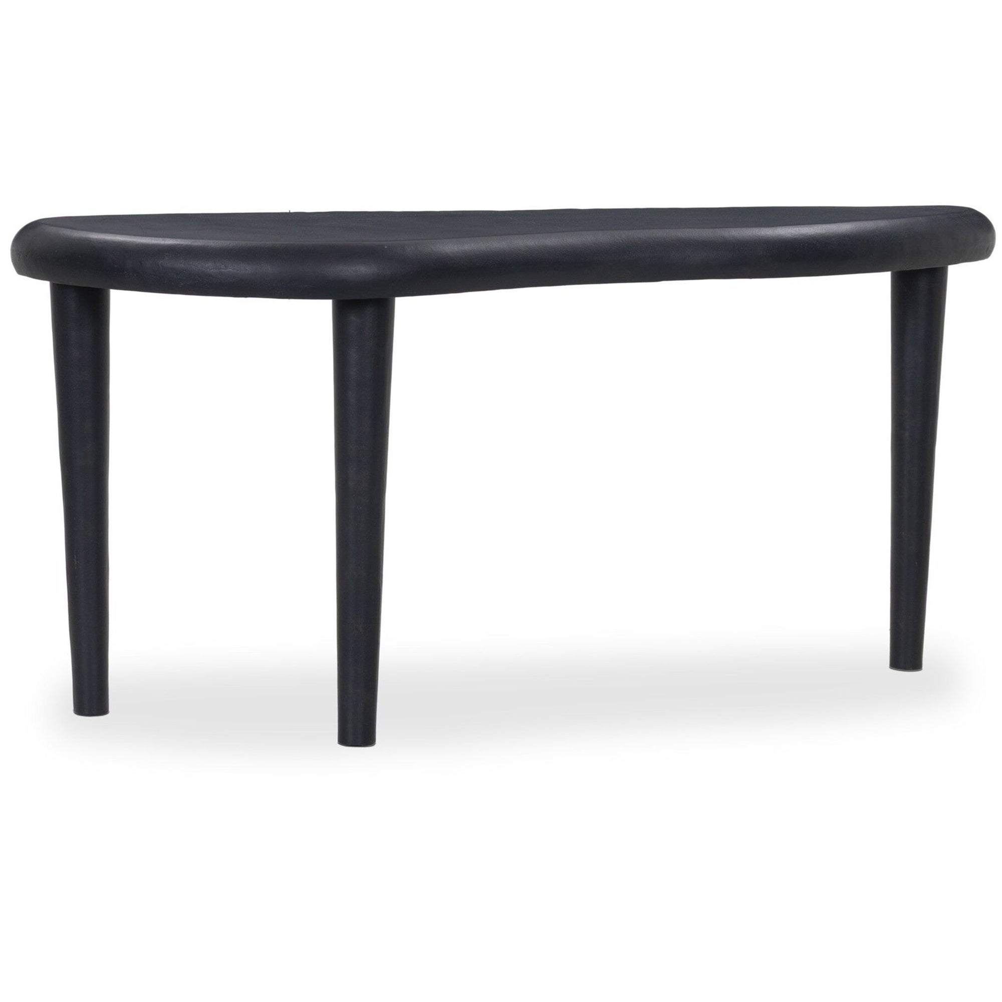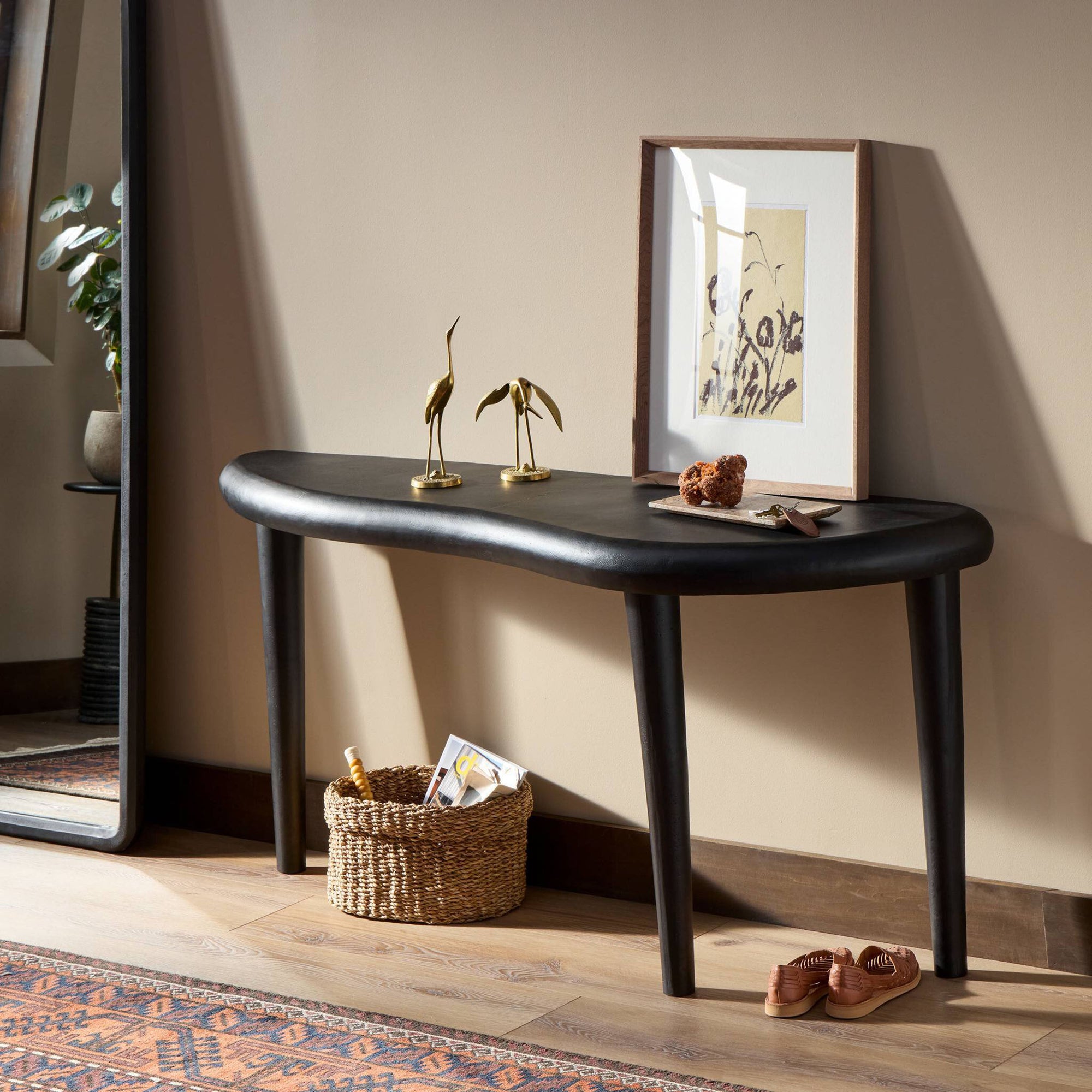The Axel Console Table is an organically shaped console table crafted from antiqued black aluminum. A distinctive wave-shaped top seamlessly pairs with timeless tapered legs. This piece offers a generous surface area, ideal for storing and styling media needs or showcasing cherished decor in an entry hall or living area.