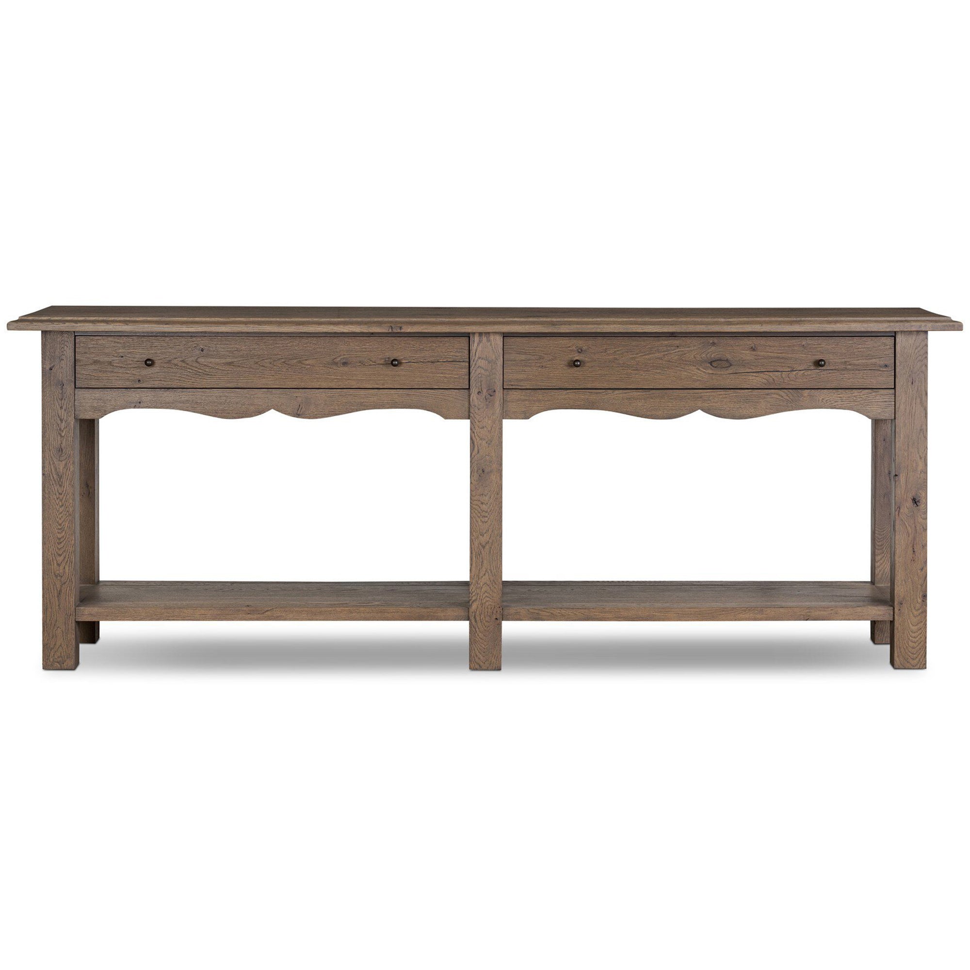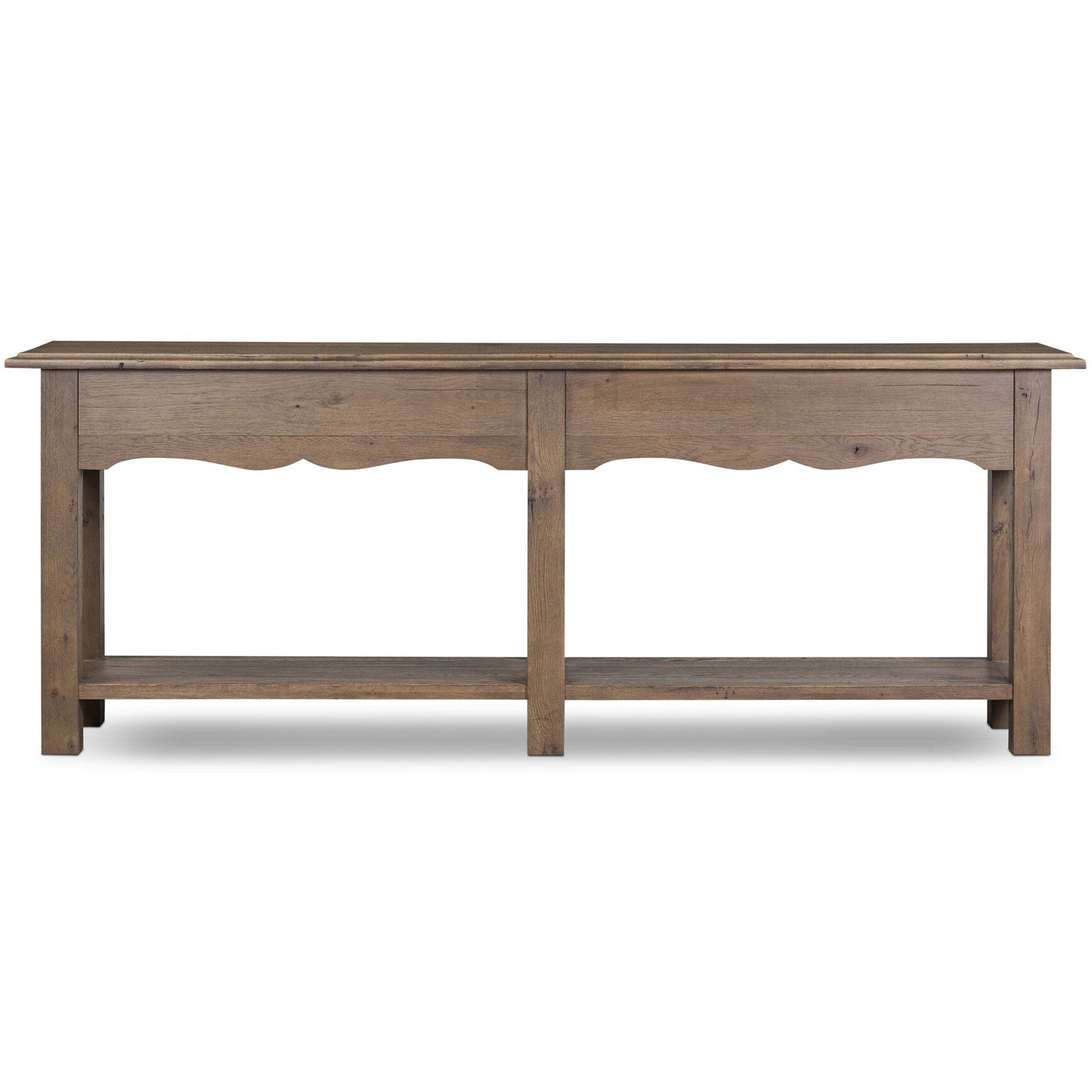 The Bayla Console Table brings timeless craftsmanship and functionality to any living or media space. Made from weathered oak with a brown oak veneer, this console showcases traditional shaping with an overhang top, decorative apron, and six-leg base for added balance. Two drawers and a lower shelf provide versatile storage and display options, making it both beautiful and practical.