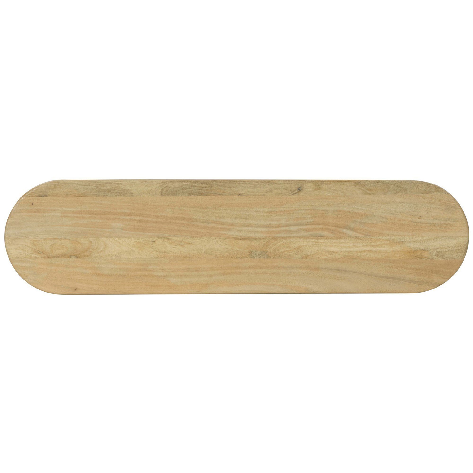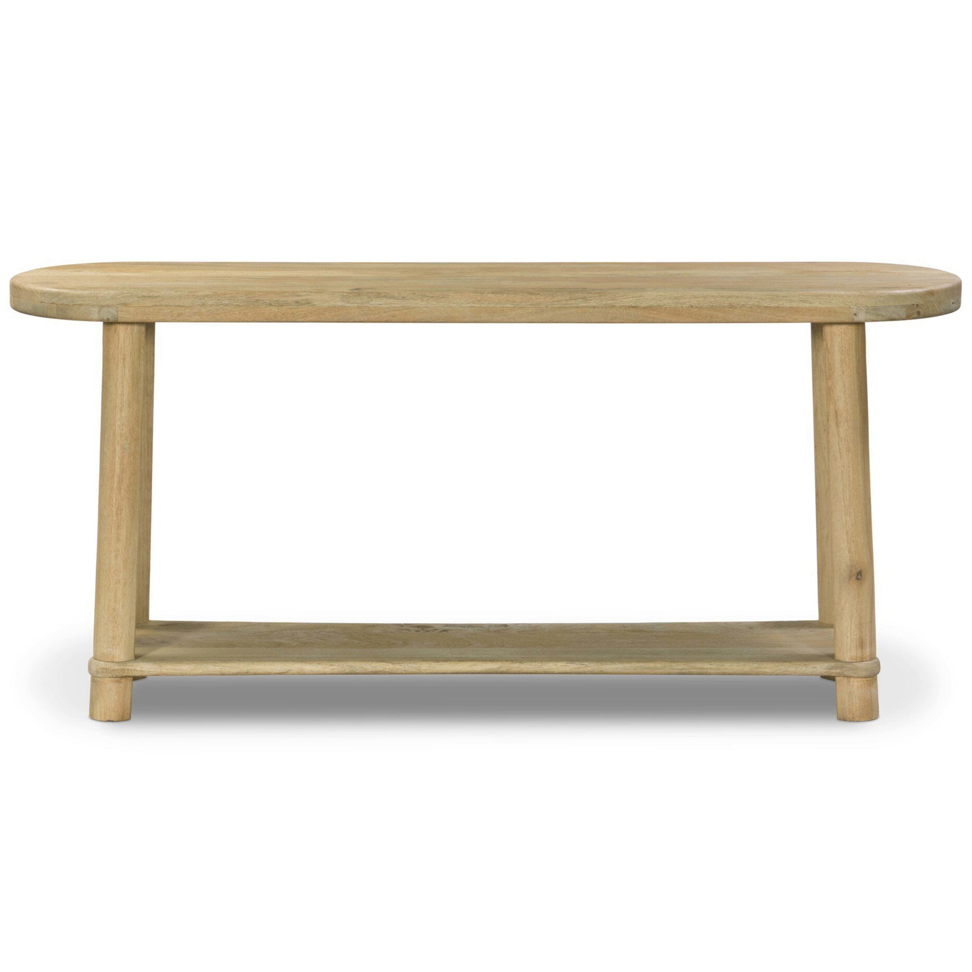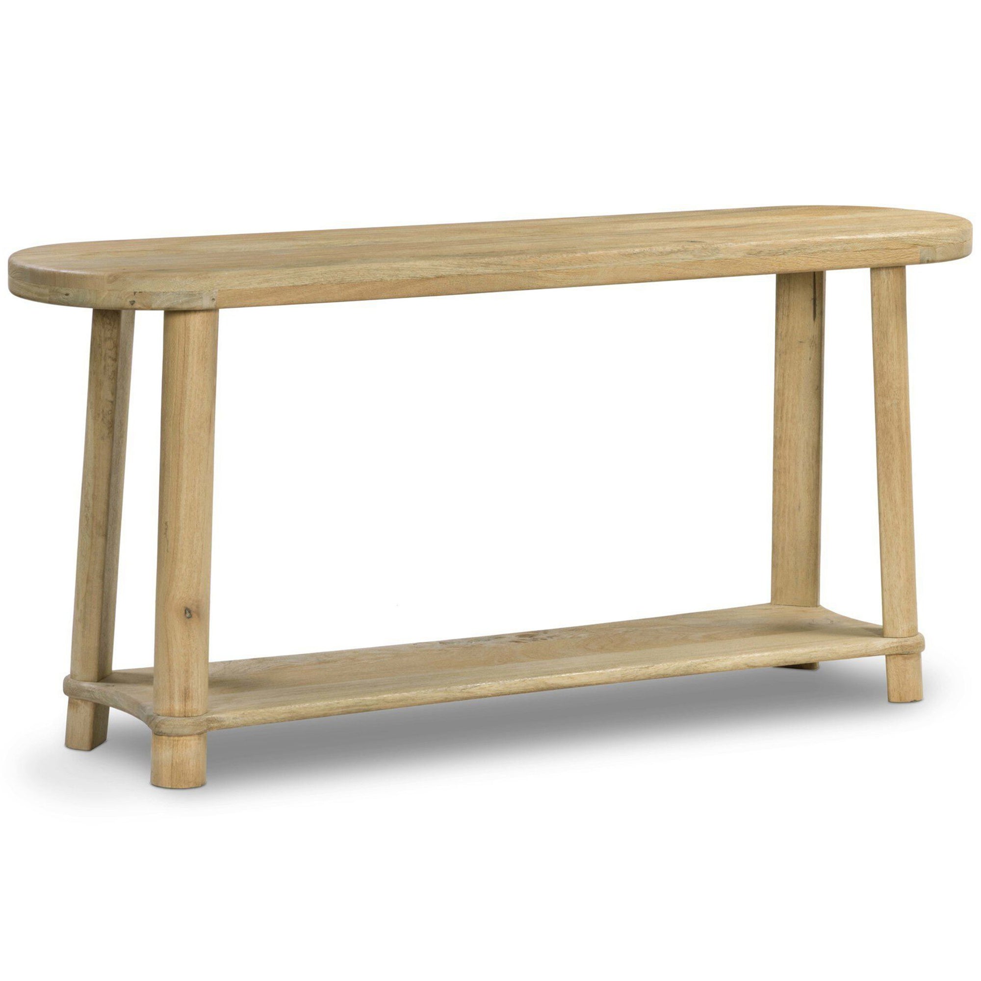 The Daley Console Table is crafted from solid mango wood with a beautiful light, natural finish. This pill-shaped console table features splayed legs and convenient lower shelving, bringing practical storage and display options to your media room, entryway, or living space. Its clean design and warm tones enhance a variety of décor styles.