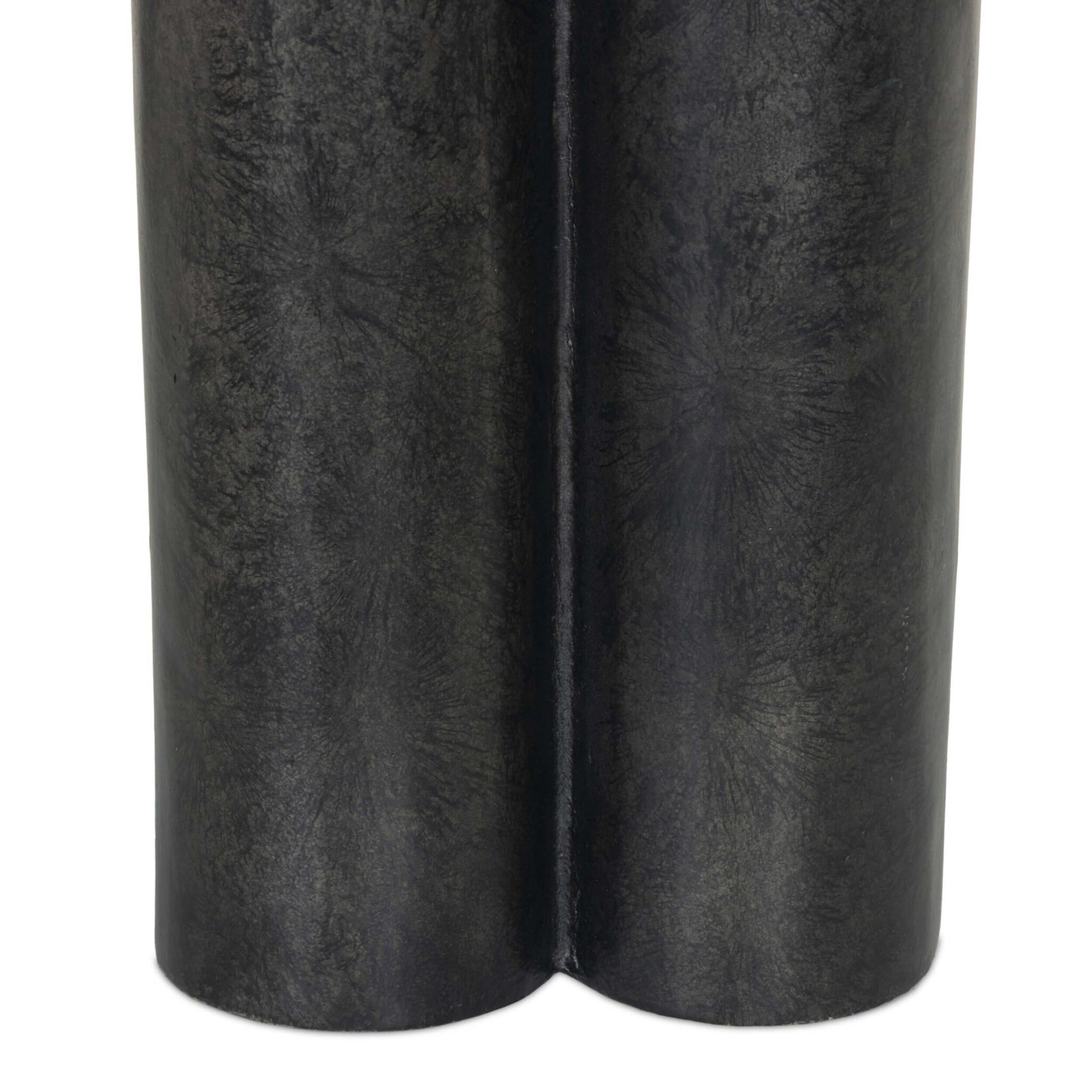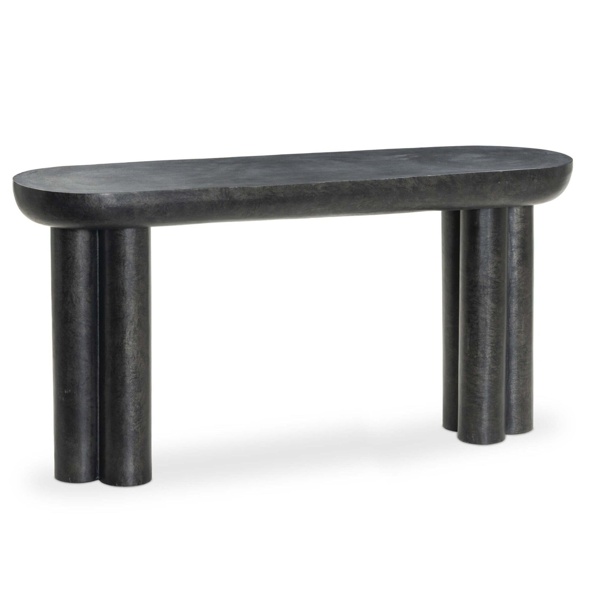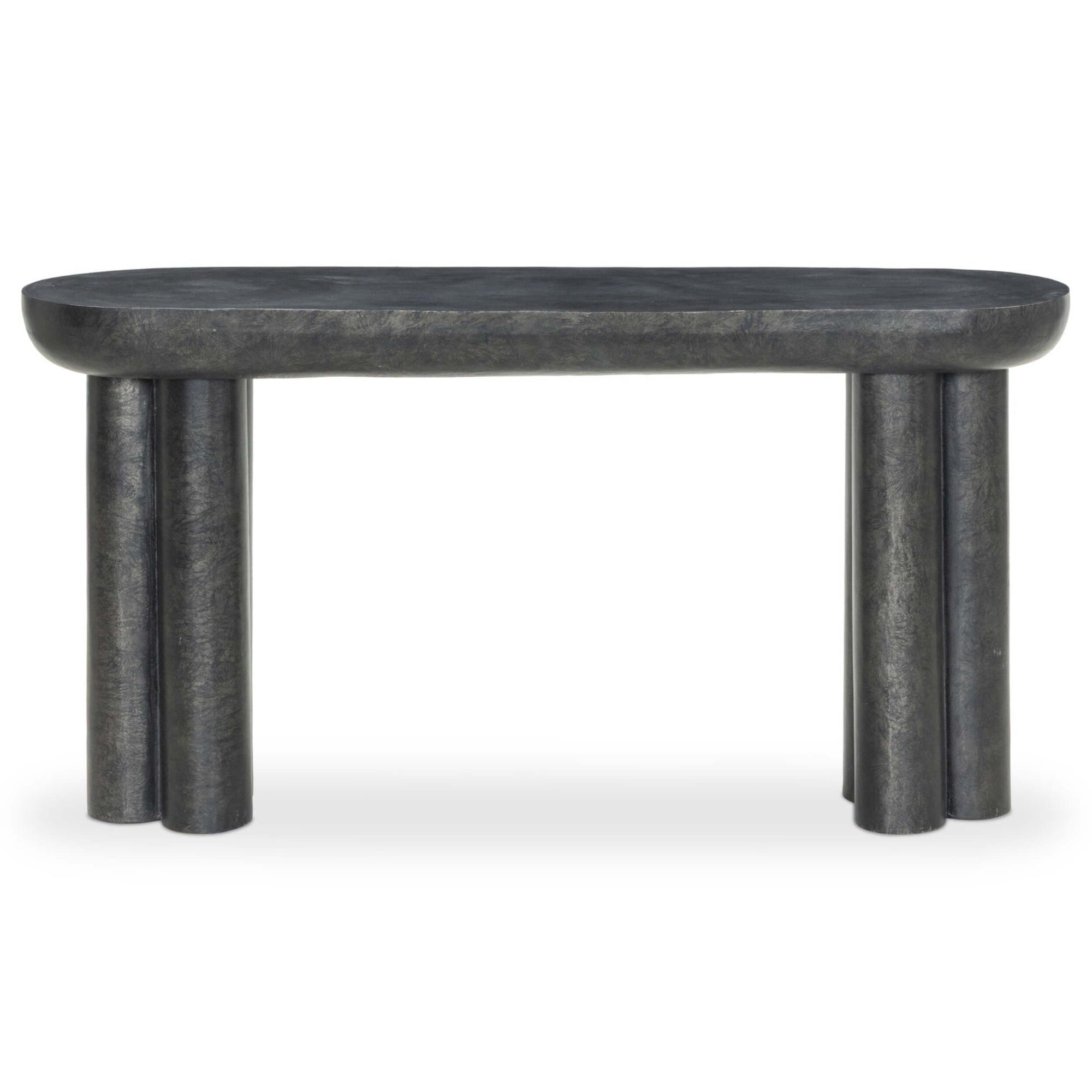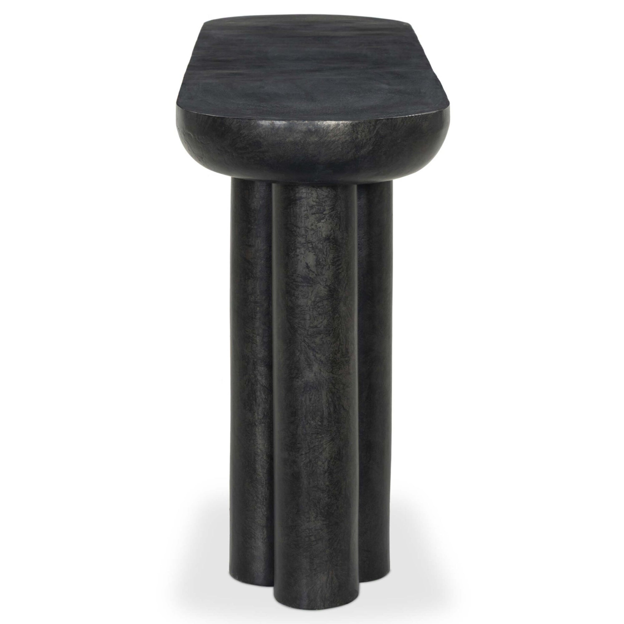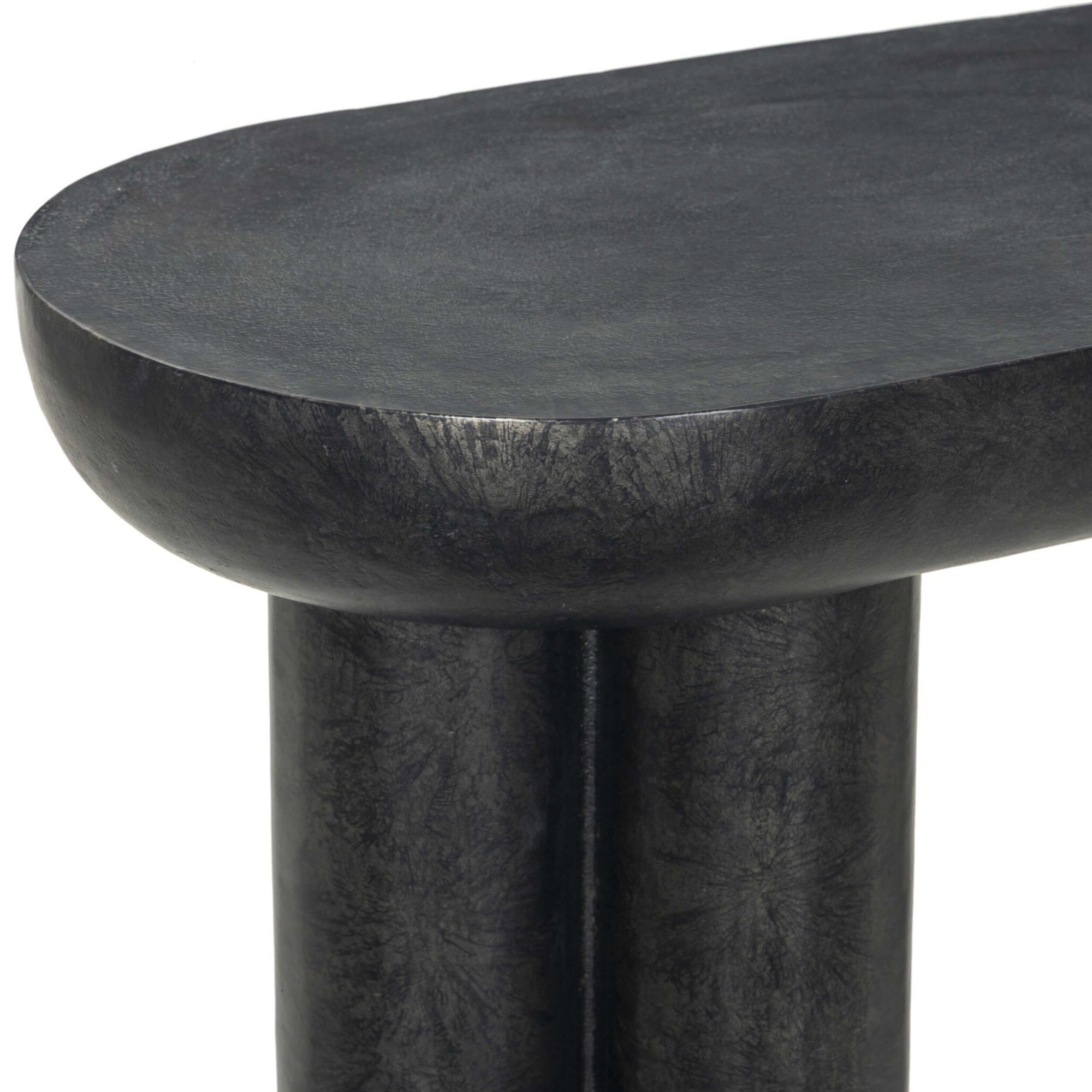 The Sante Console Table makes a bold statement with its thick cast aluminum construction and distinctive double pedestal design. Clover-shaped legs add a touch of playful elegance, while the exaggerated bullnose top offers smooth, rounded edges that soften the overall silhouette. Finished in raw black aluminum, the table’s surface features rich texture and dynamic visual movement, enhancing its modern industrial appeal. Perfect for entryways or living spaces, this console combines strong materials with artistic design for a striking and functional centerpiece.
