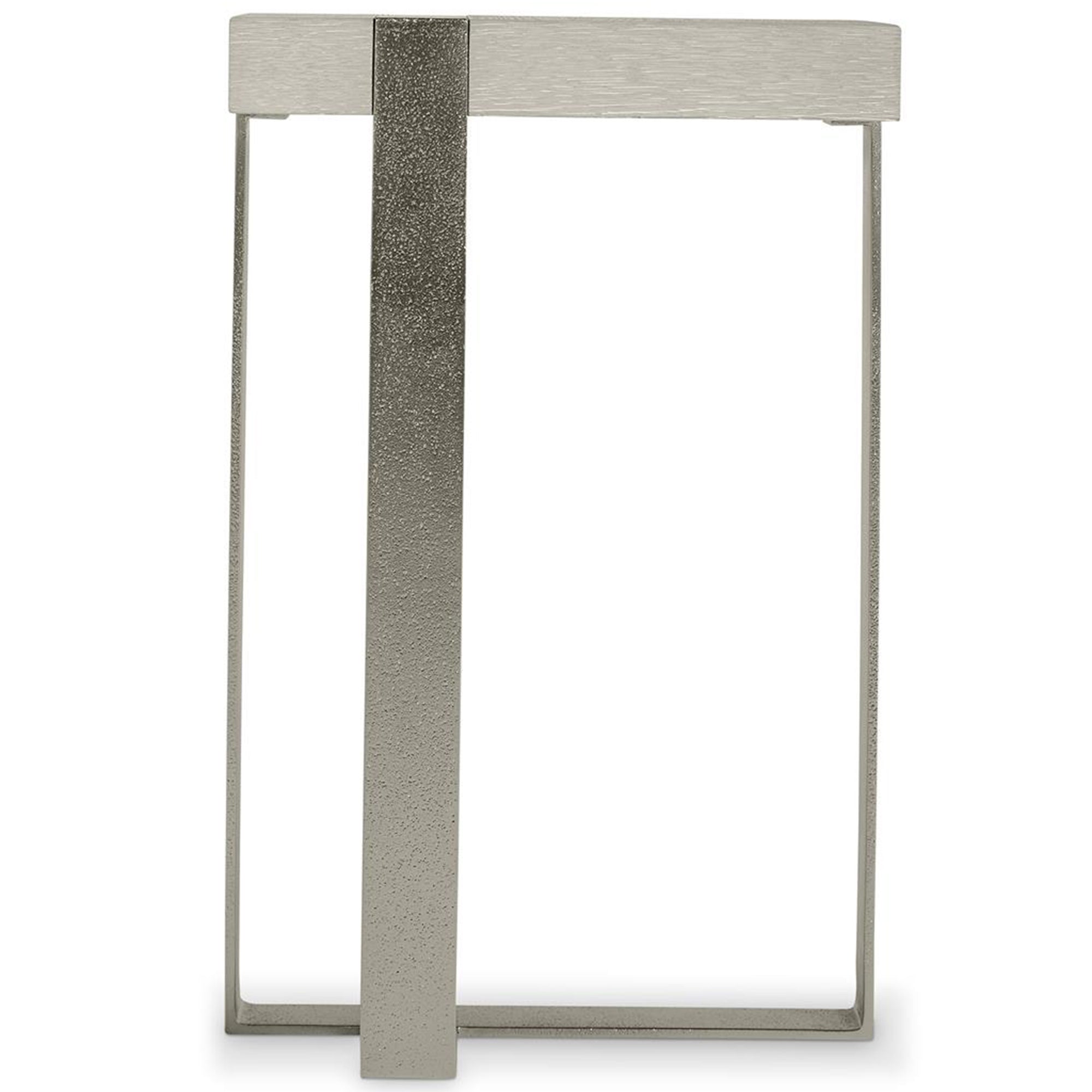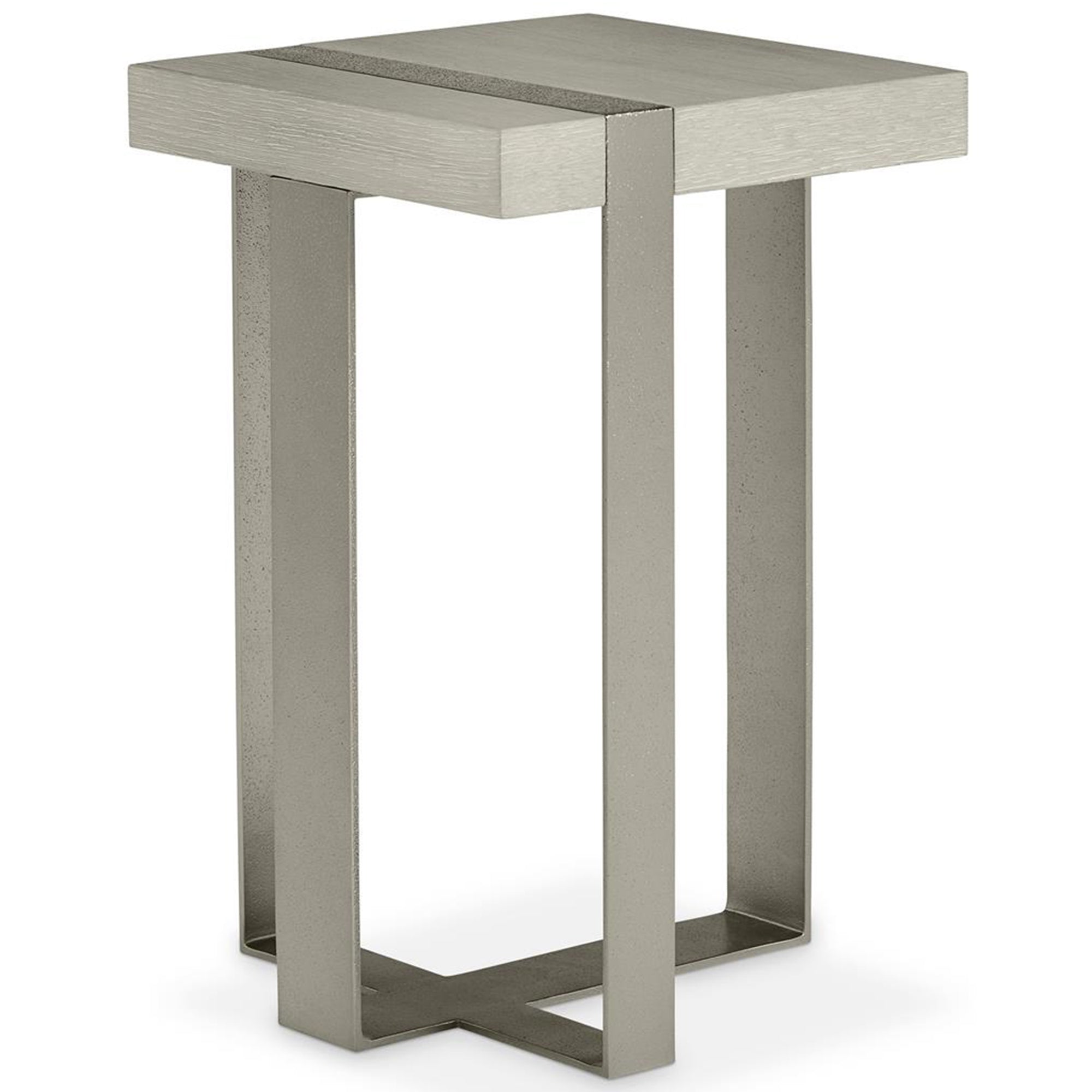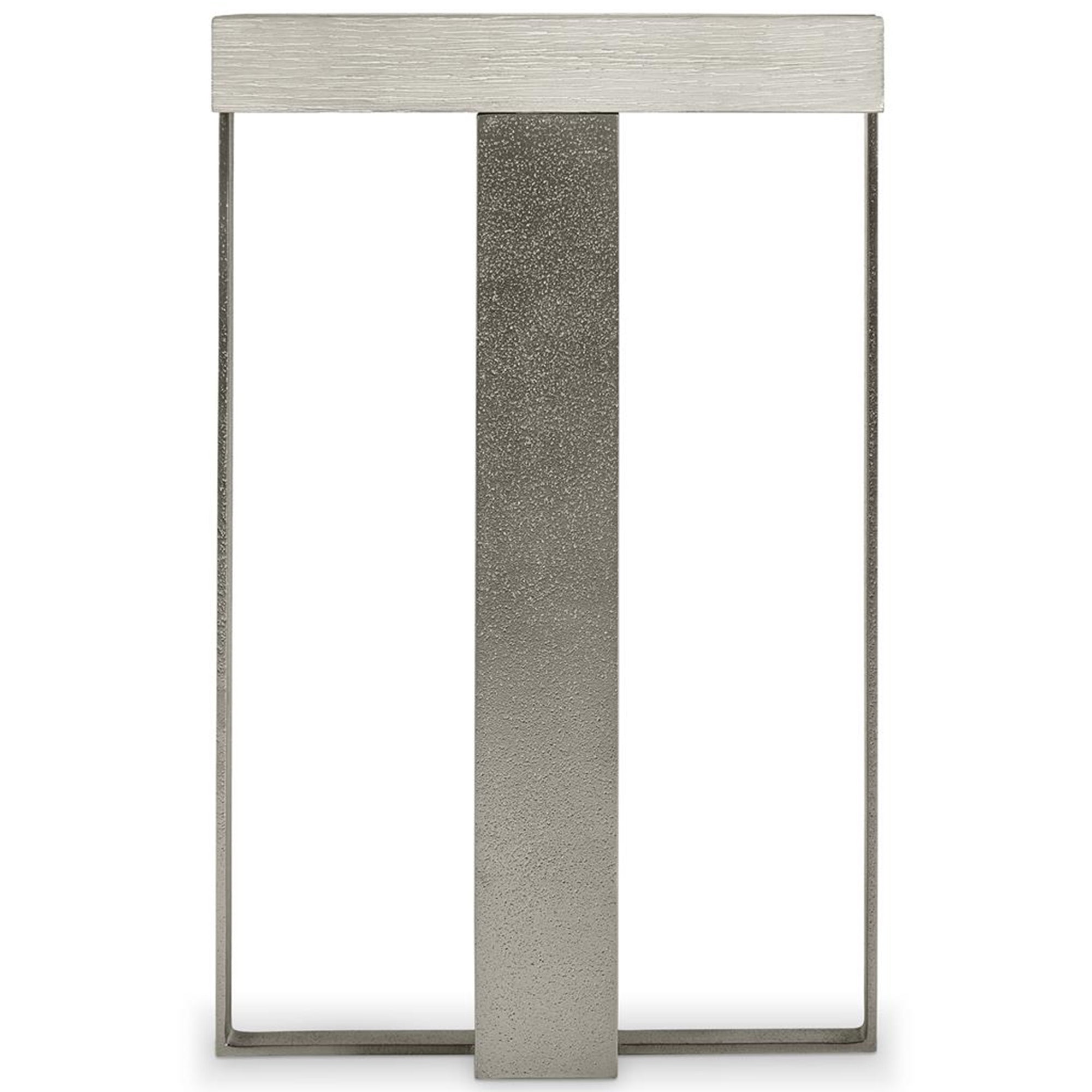 The Tempo Accent Table showcases a sculptural silhouette formed by intersecting bands of sandblasted aluminum. A single metal band wraps through the wirebrushed oak top, creating an architectural balance between wood and metal. The result is a refined, modern table with visual rhythm.