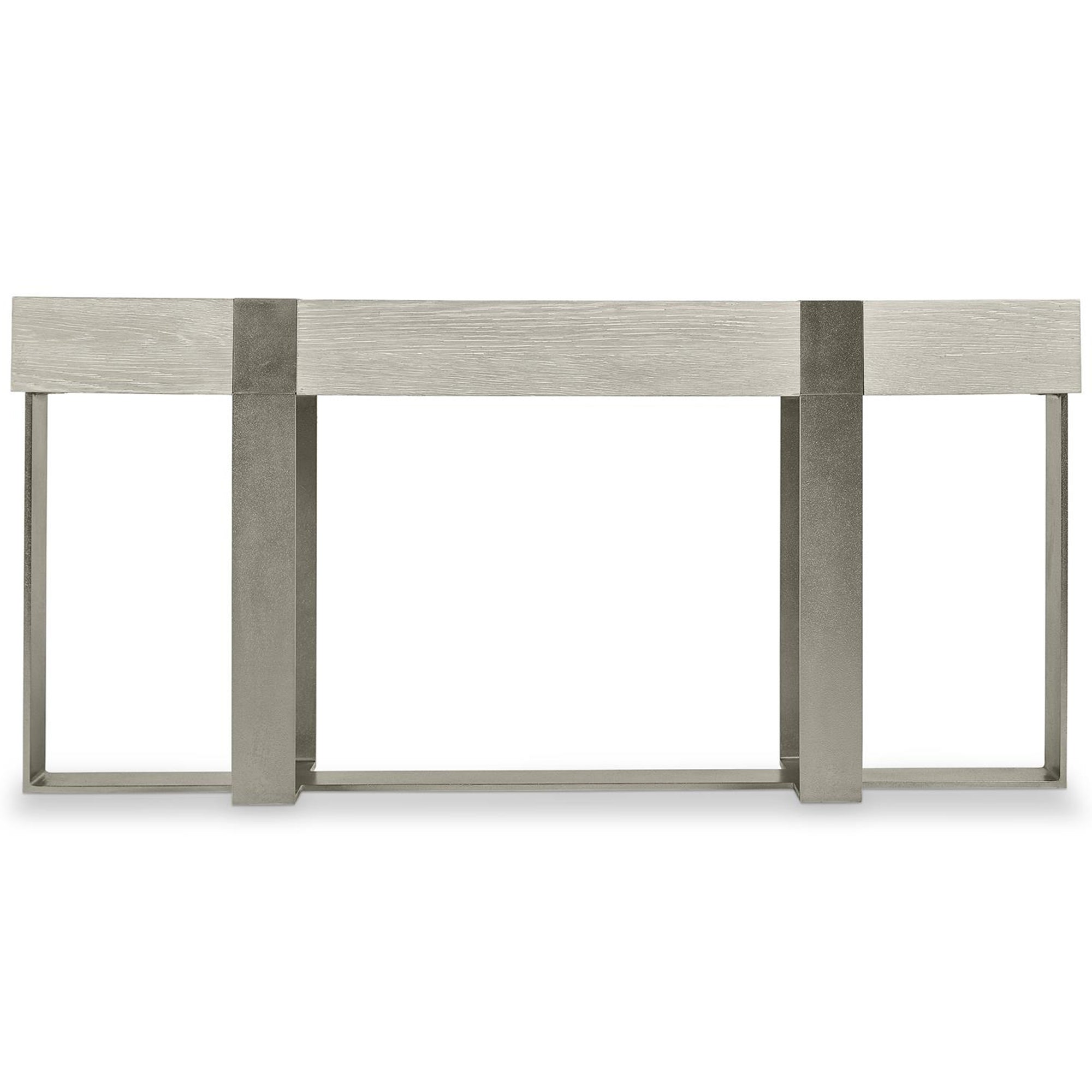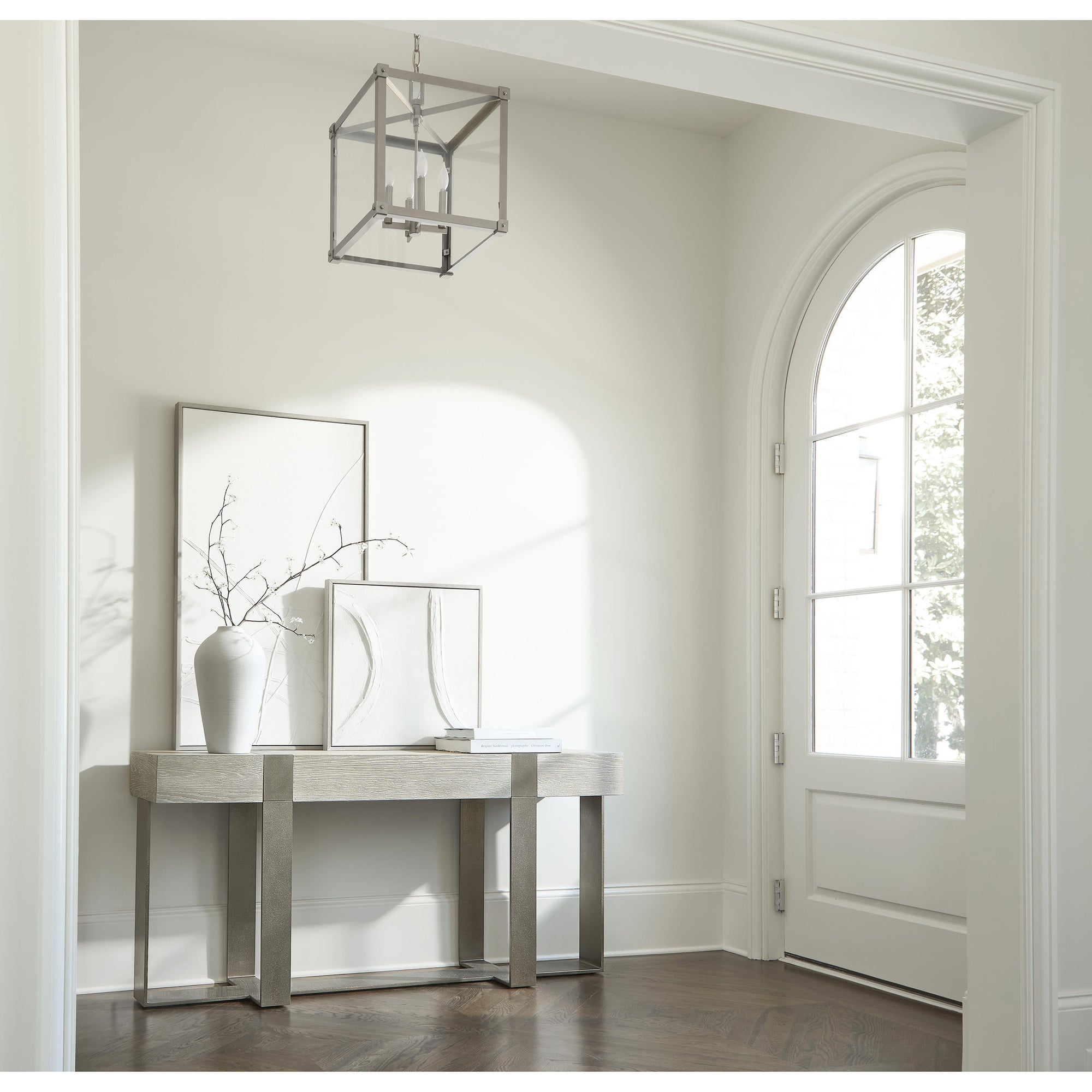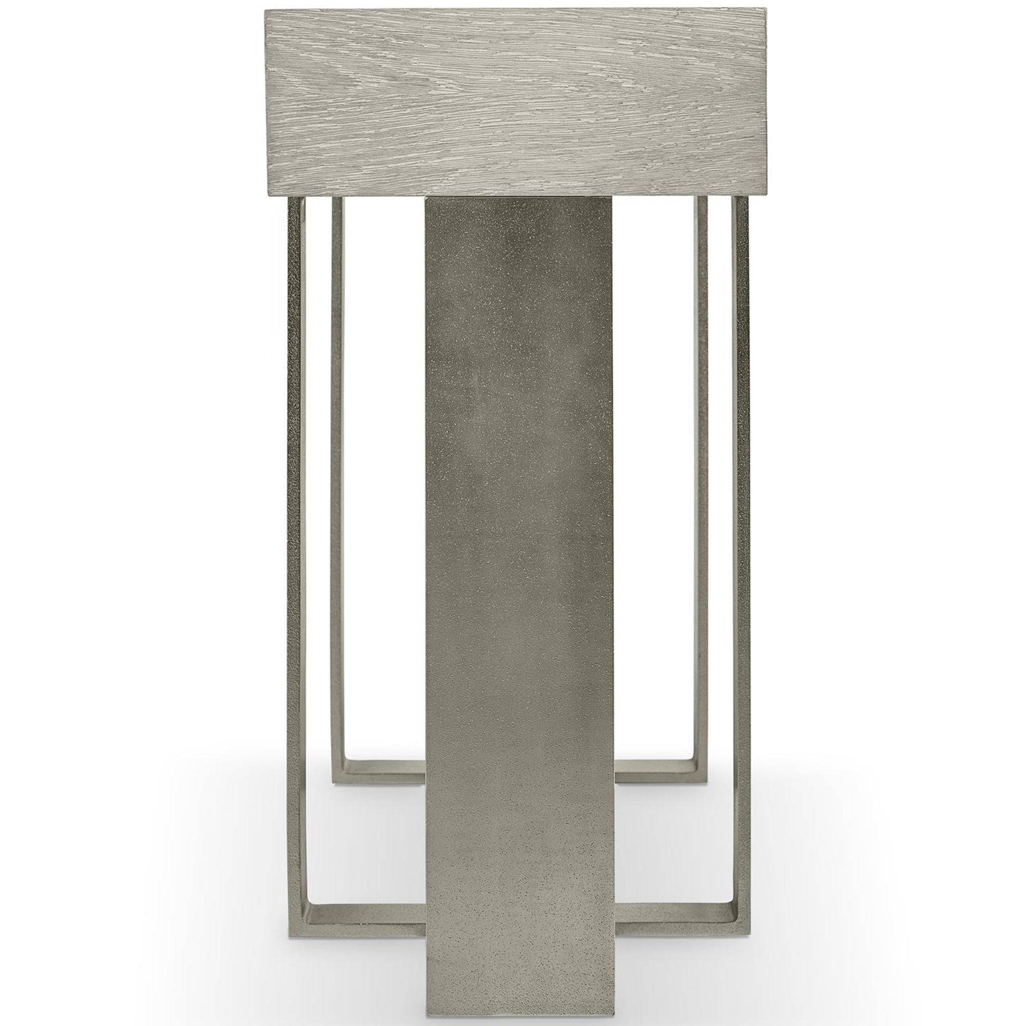The Tempo Console Table delivers a bold architectural style through intersecting bands of sandblasted aluminum in Satin Nickel finish. These sculptural metal forms wrap through and support a wirebrushed oak top in a soft Larza finish, blending natural warmth with modern structure. It’s a striking mix of texture and shape.