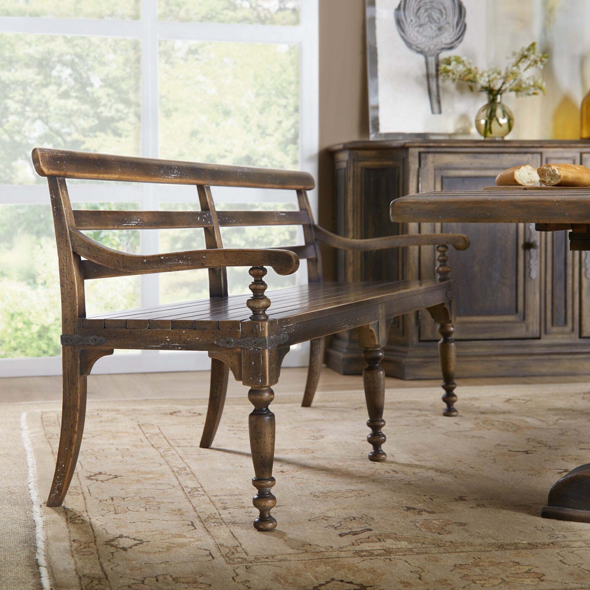 The Hill Country Helotes Dining Bench sets a genteel and gracious tone with its softly-shaped silhouette and authentic American character. Featuring a timeworn saddle brown finish, this piece comfortably seats three people, making it perfect for dining or entertaining. Crafted with a slat back and elegant turned legs, the Hill Country Helotes Dining Bench brings a traditional and formal aesthetic to any home.