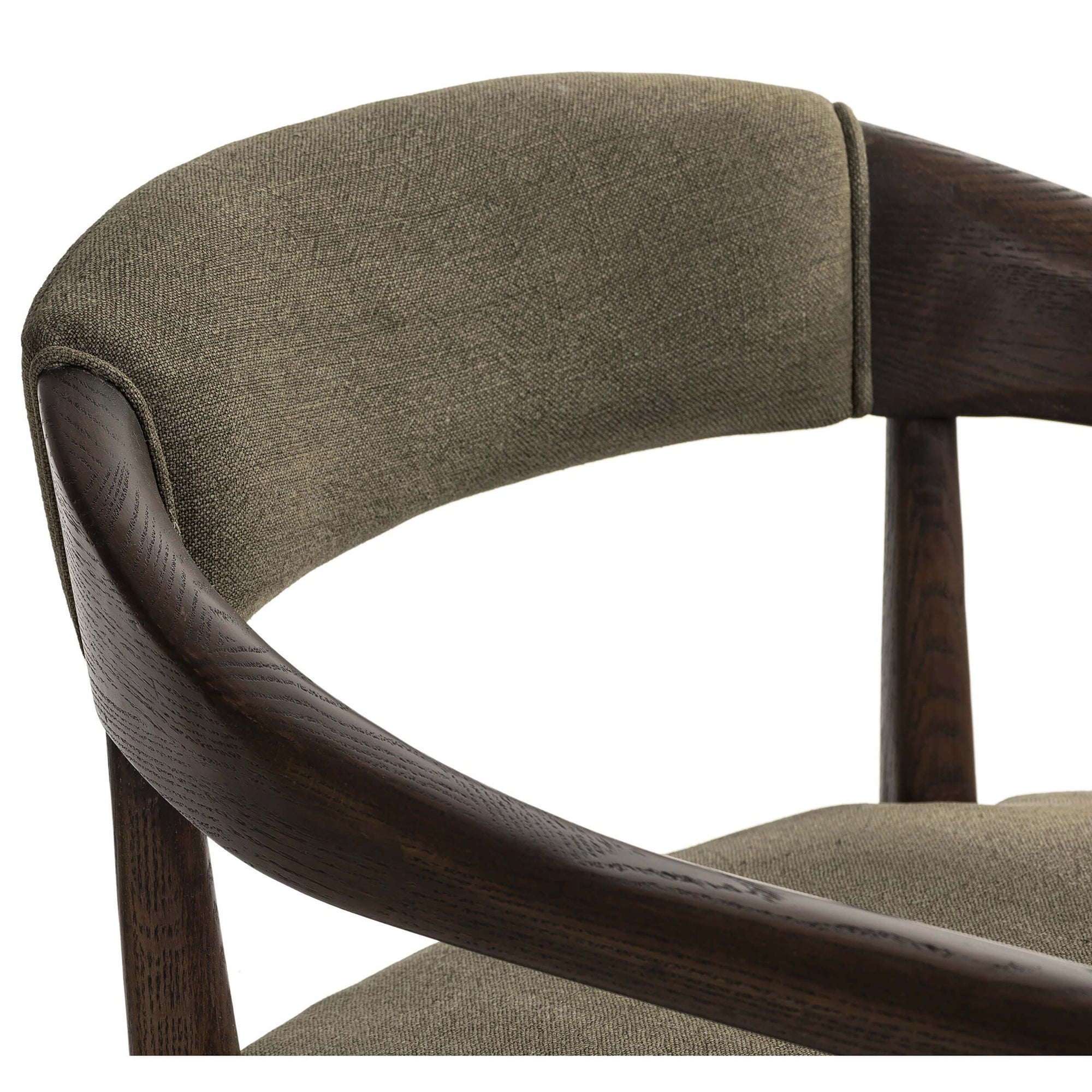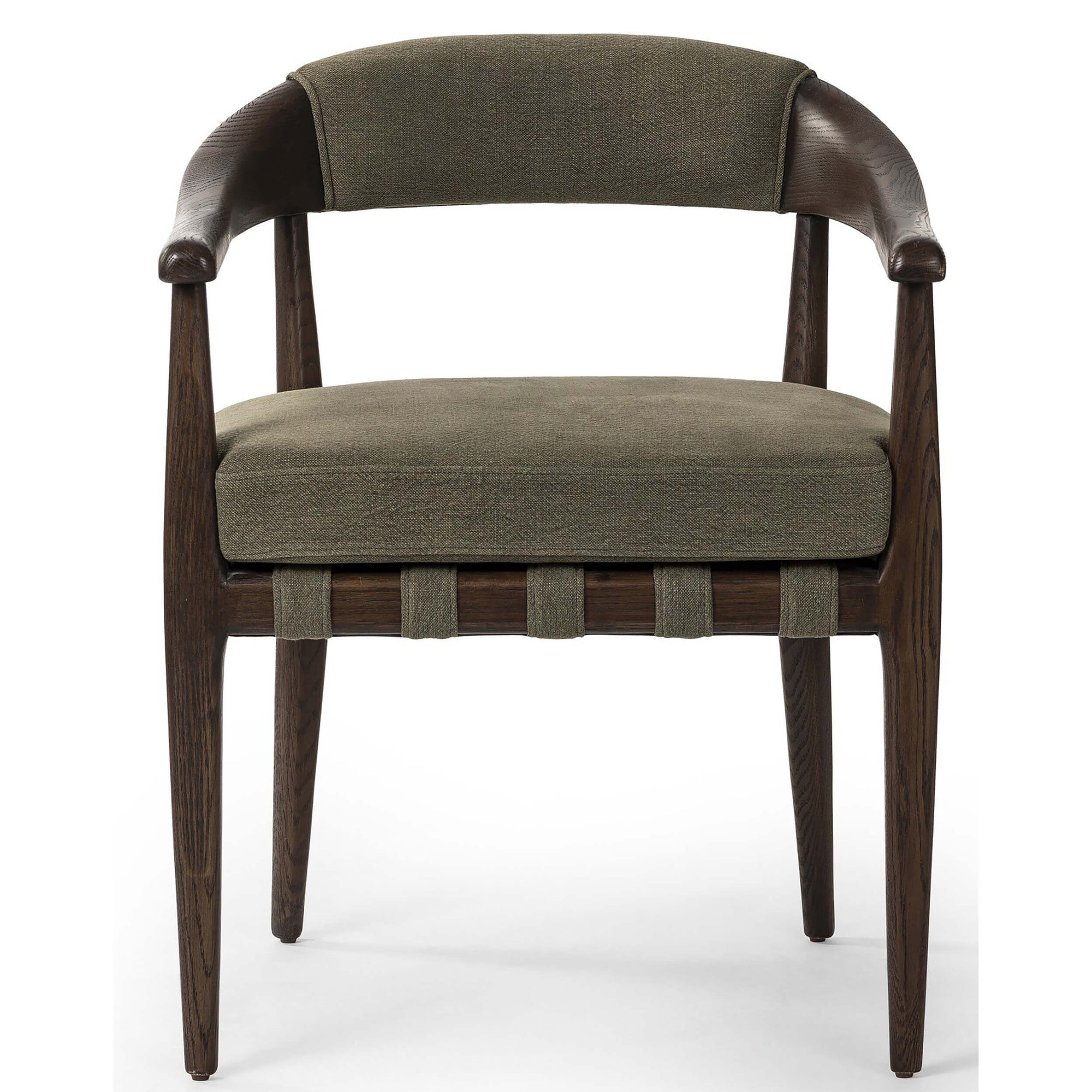 The Dane Dining Chair blends traditional safari styling with modern comfort. A solid wood frame supports a webbed seating structure, offering a sink-in feel for ultimate relaxation. The upholstered back and loose cushion are finished in an olive flax/linen-blend fabric, while strap details add a unique touch. Perfect for combining classic design with contemporary ease.