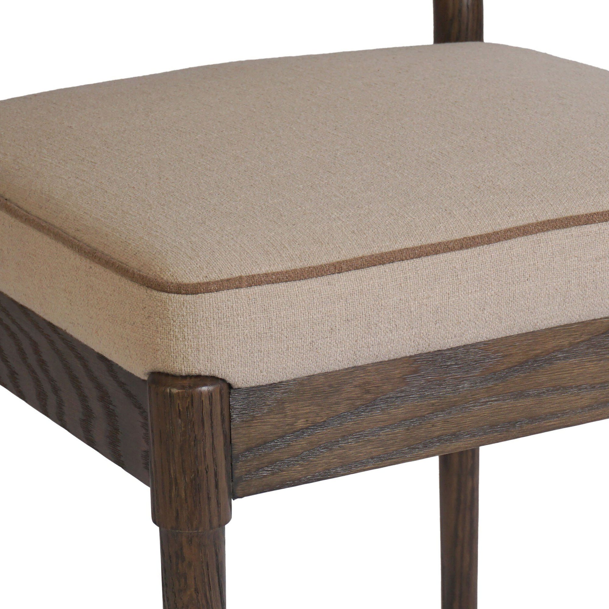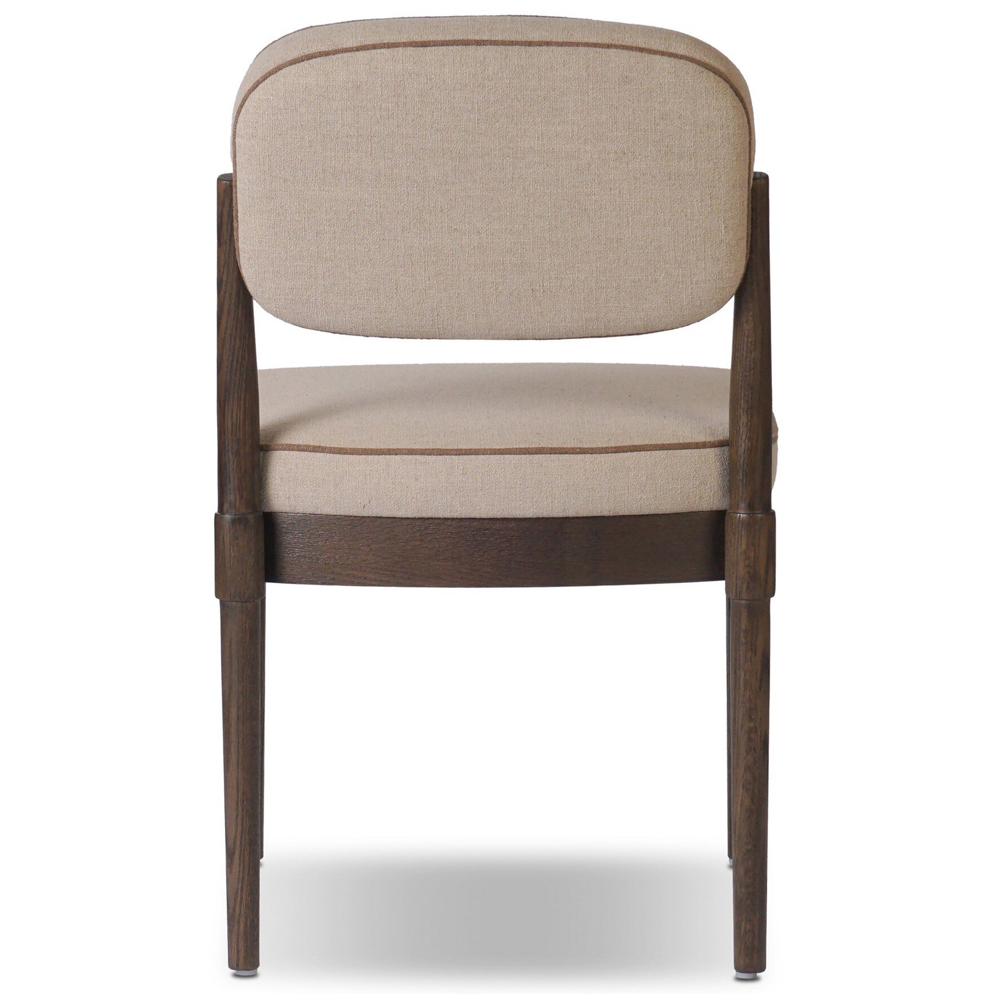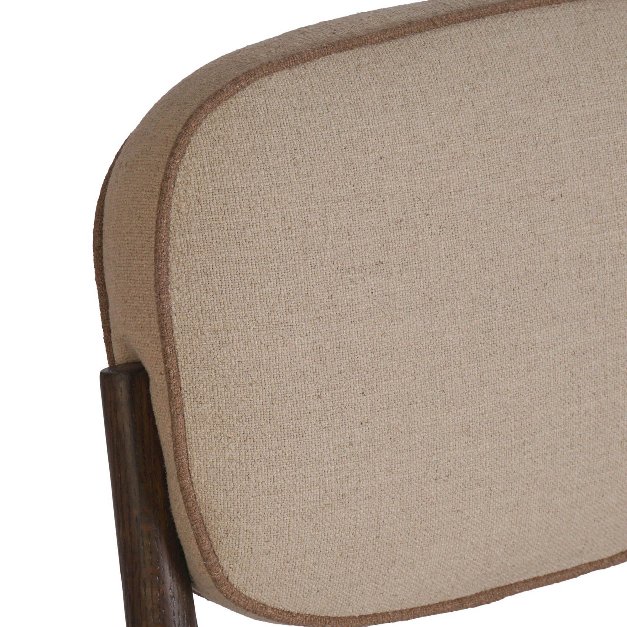 The Esther Dining Chair blends classic craftsmanship with comfortable seating. Constructed from solid oak and a performance fabric blend, it features a fixed back cushion and webbed seat construction for support. Corner-block, mortise and tenon, and pocket joint with screws ensure durability, making this chair ideal for daily dining use.