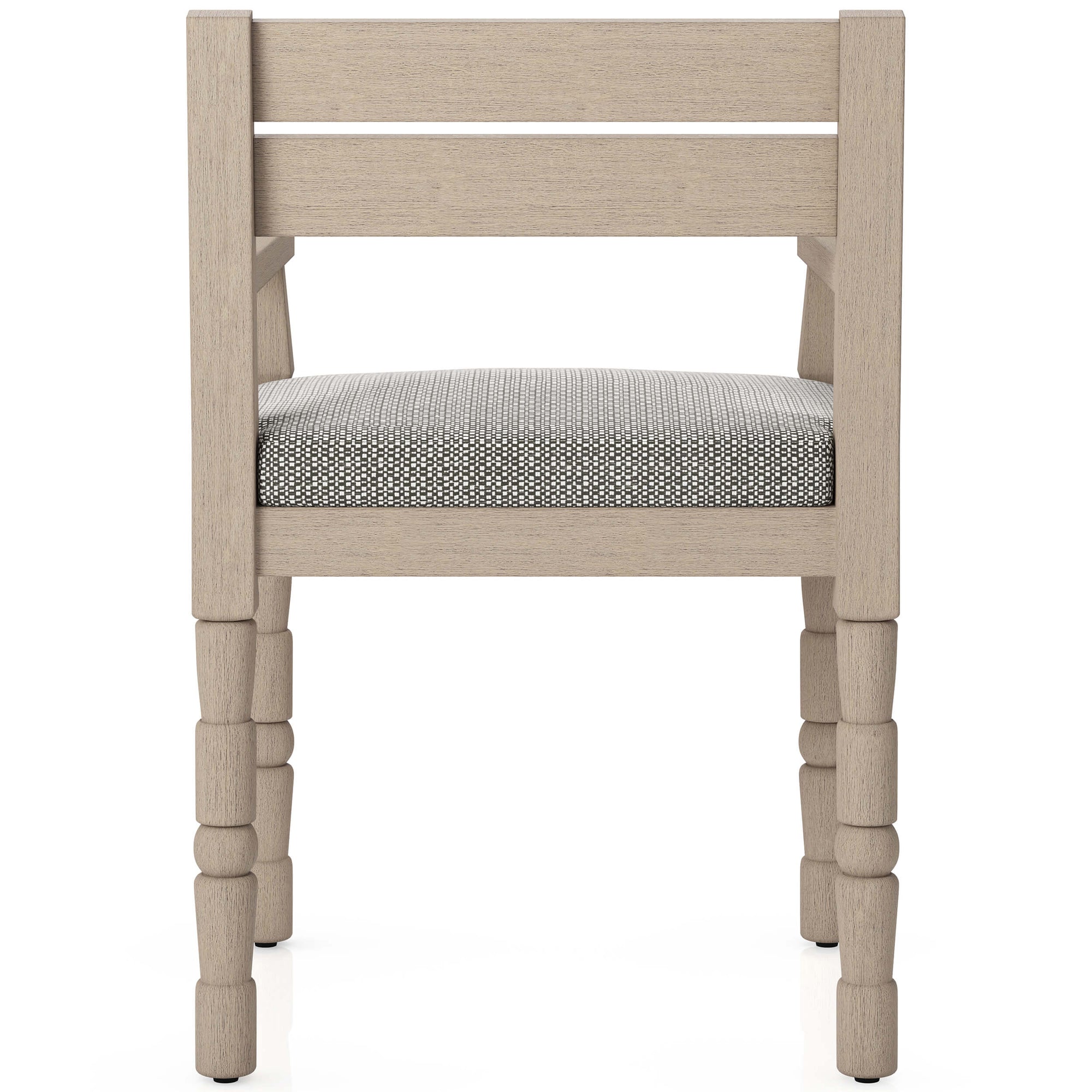 Traditional turned-leg furniture gets a modern refresh for the outdoors. Sculpted legs are gently sanded and smoothed for subtle contrast, giving this outdoor dining chair a totem-inspired look. Crafted of FSC-certified teak. Box seat cushion with Velcro attachment is covered in 100% Olefin, known for its UV-resistant, water-repellent, quick-drying abilities. Cover or store indoors during inclement weather and when not in use.