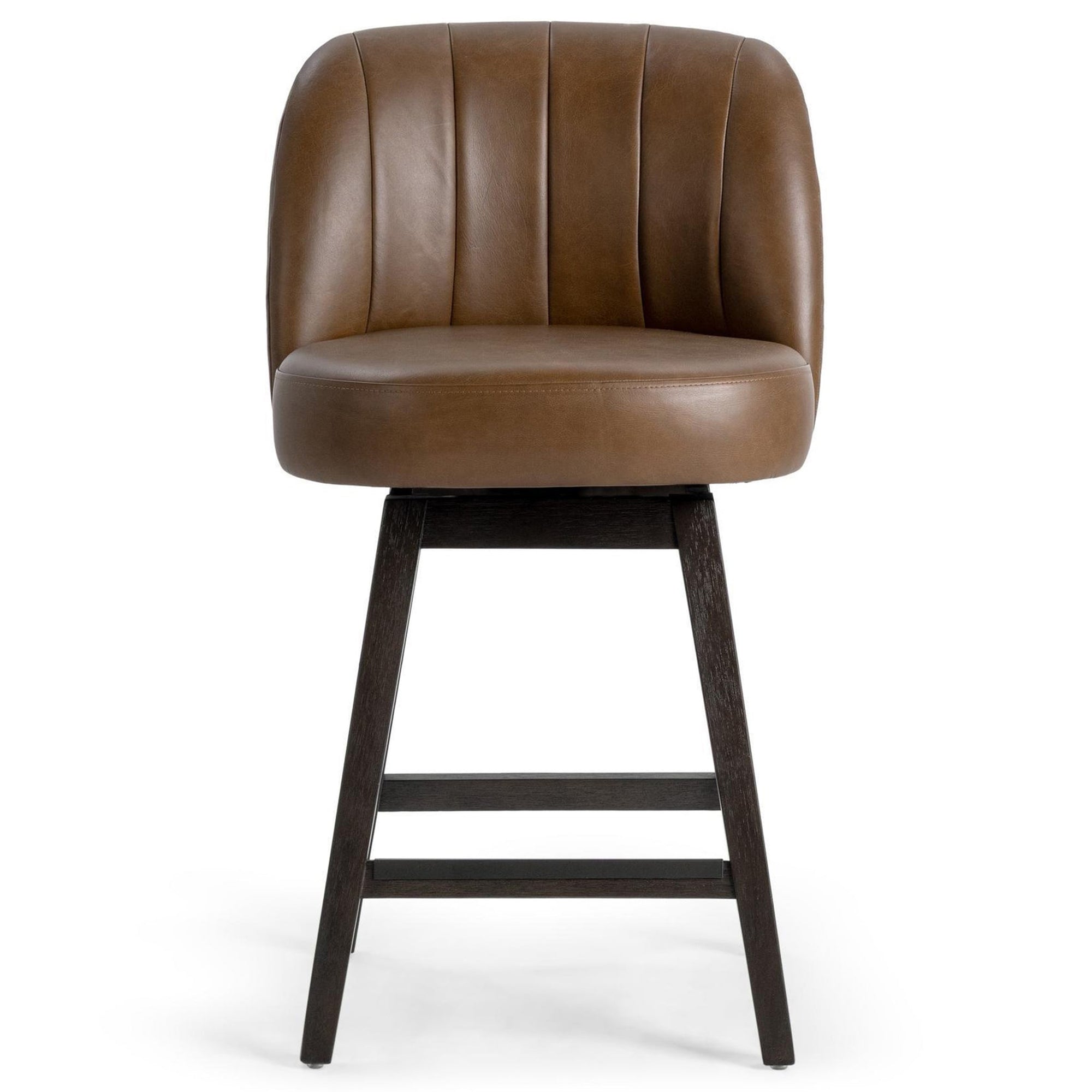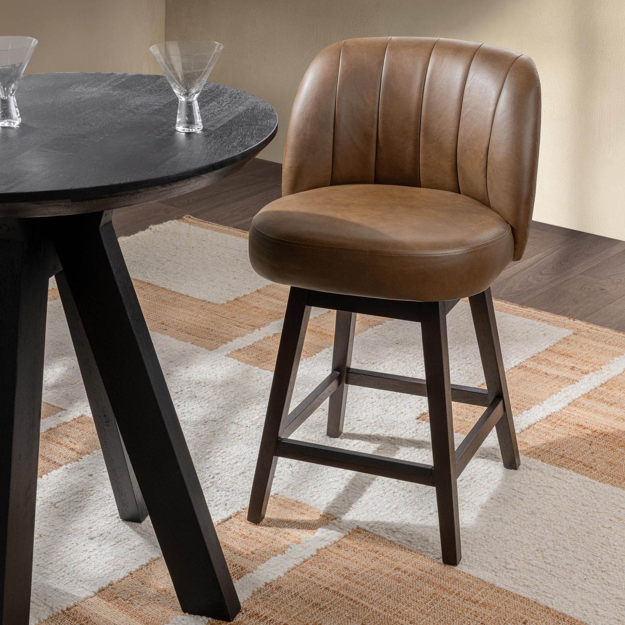 The Della Swivel Counter Stool brings style and comfort to your kitchen or bar area. Crafted from solid wood and upholstered in durable top grain leather, it combines natural warmth with modern ease. The channeled seat offers all-day comfort, while the smooth swivel motion enhances functionality. Perfect for casual dining or entertaining, this stool elevates your space with timeless design.