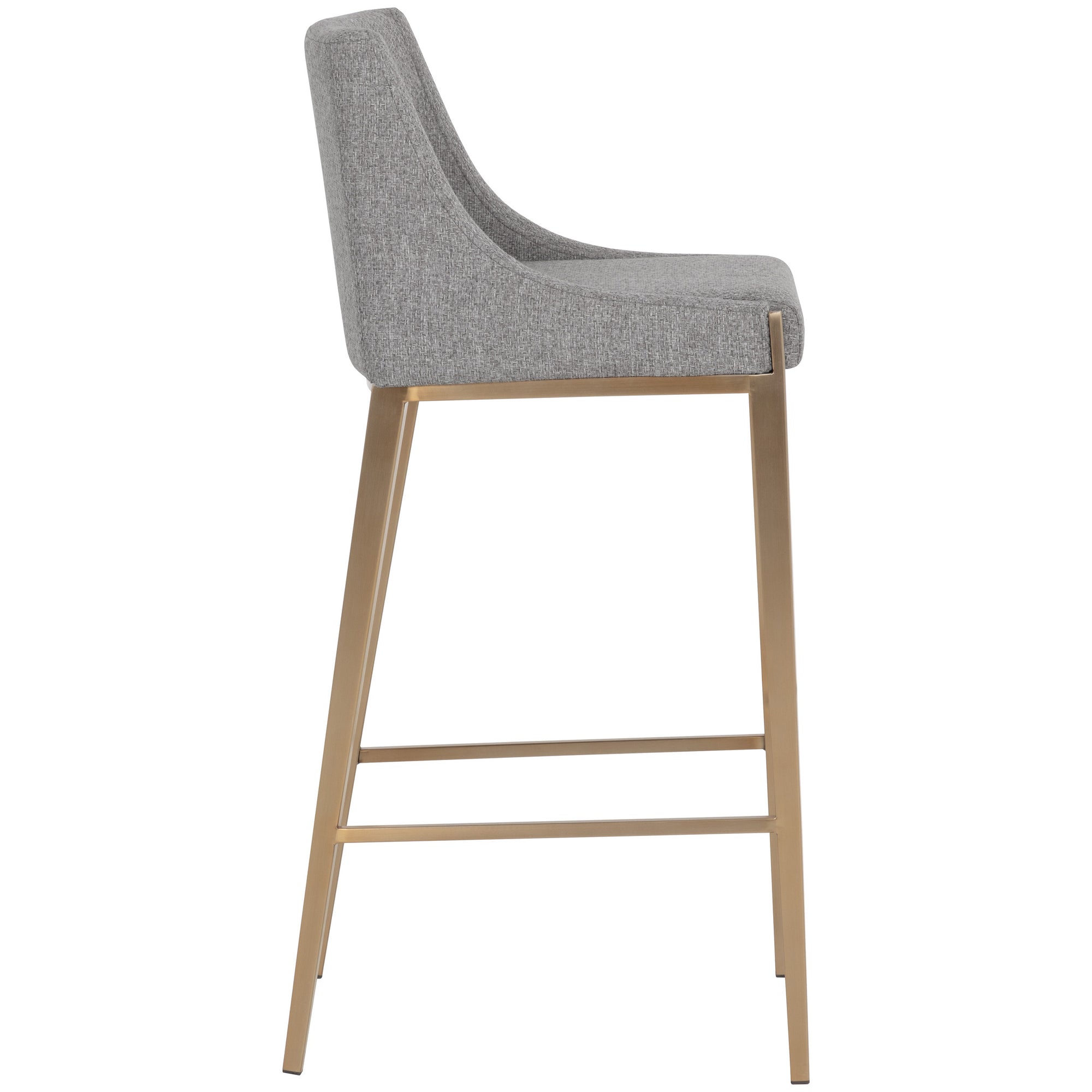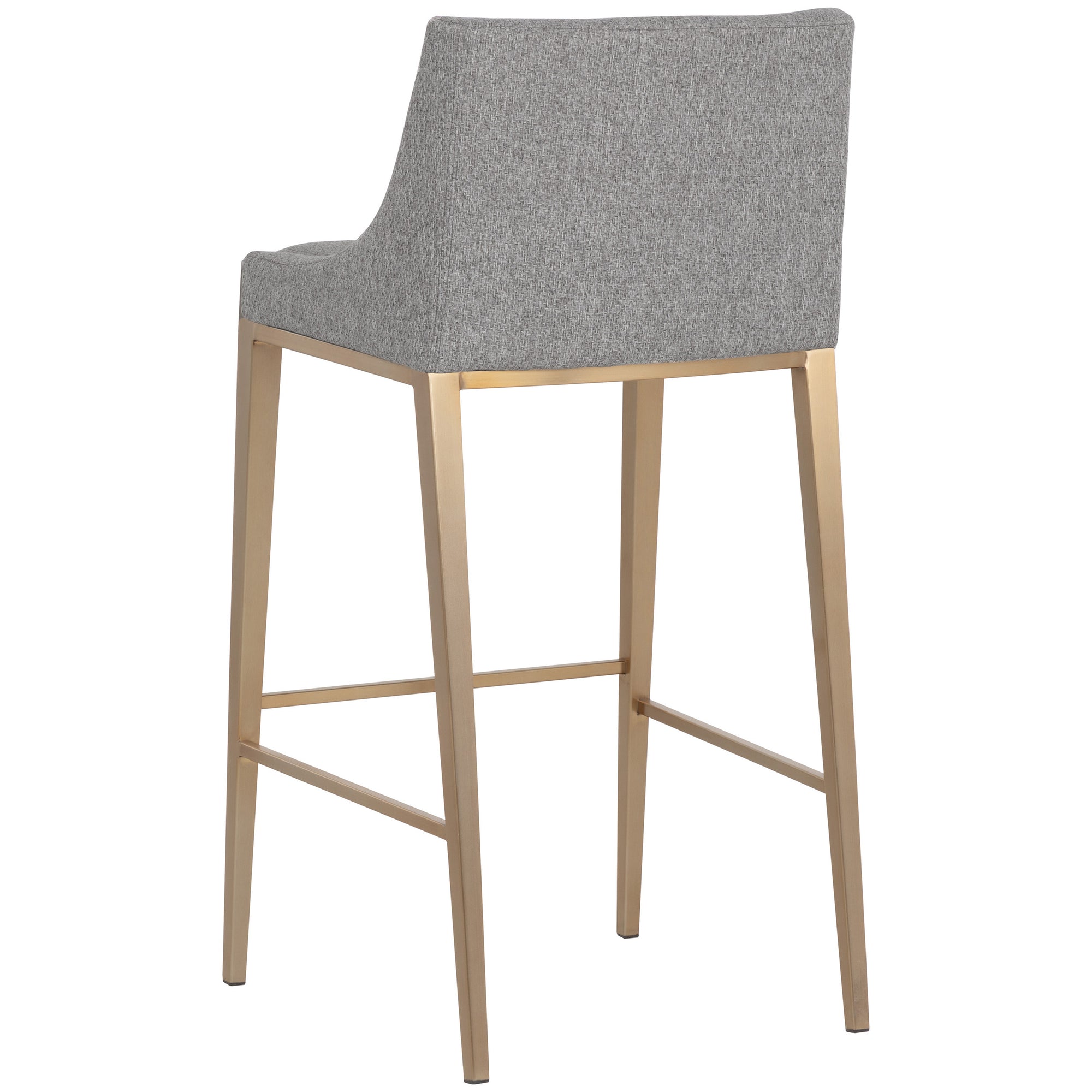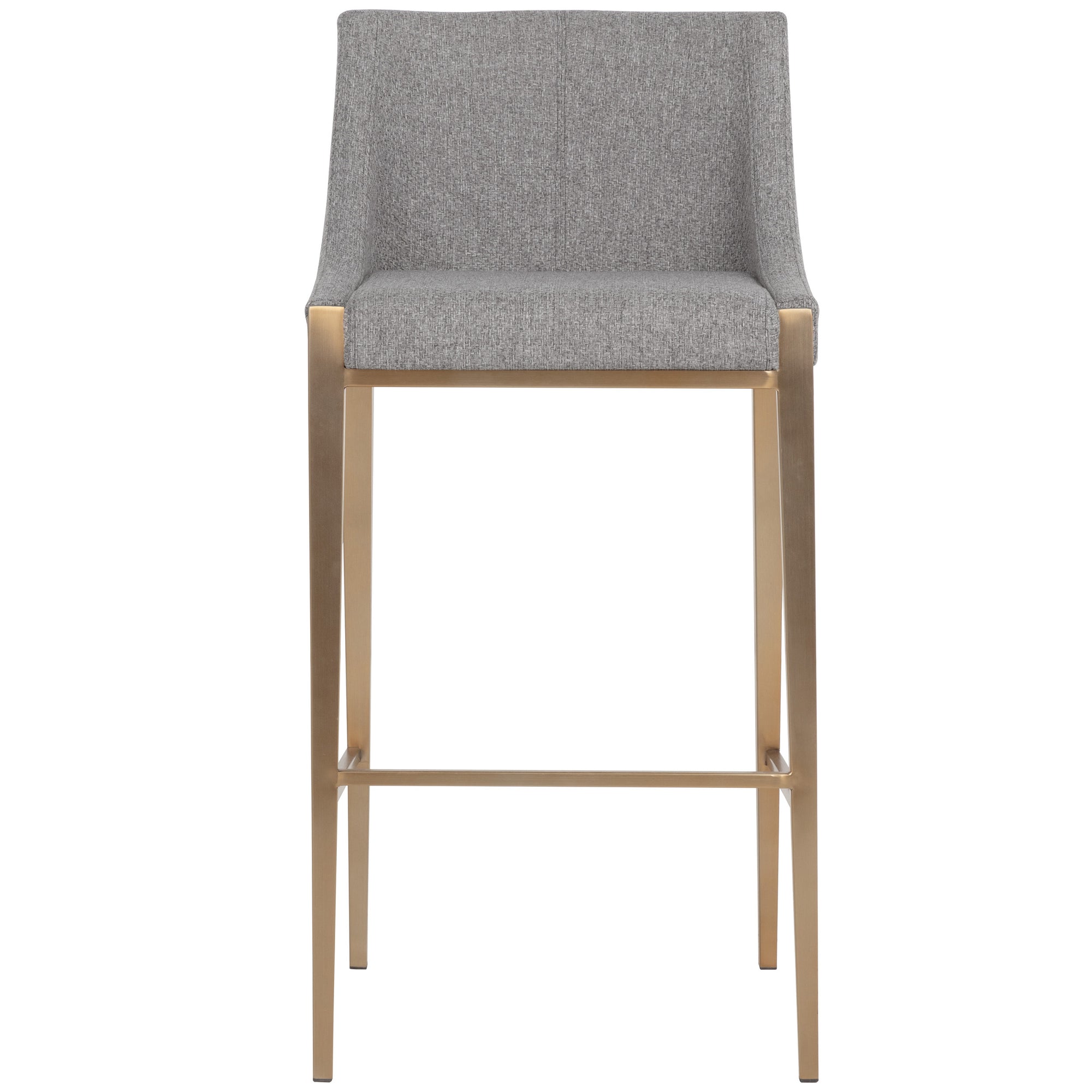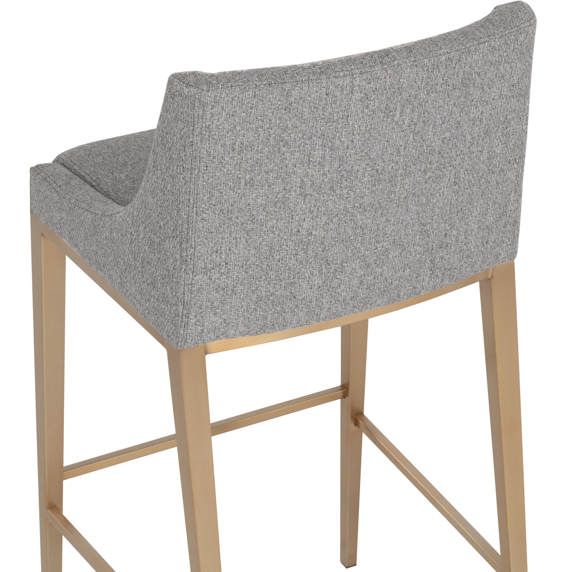 The Dionne Barstool brings a clean, modern aesthetic to dining spaces. Upholstered in performance-rated fabric, its tailored seat pairs with a powder-coated stainless steel frame in antique brass for a refined contrast of texture and tone. A versatile piece that balances comfort with style, ideal for both residential and contract settings.