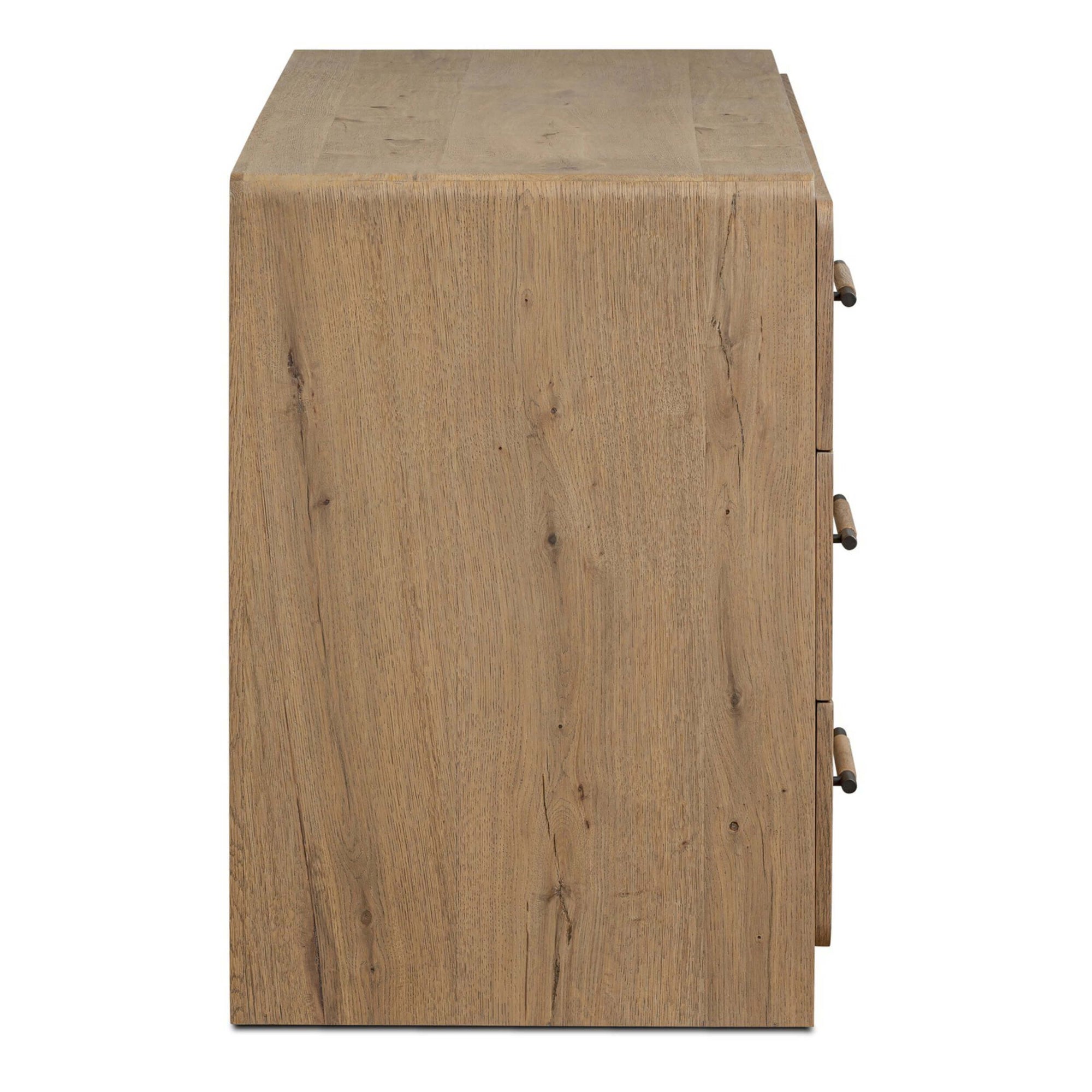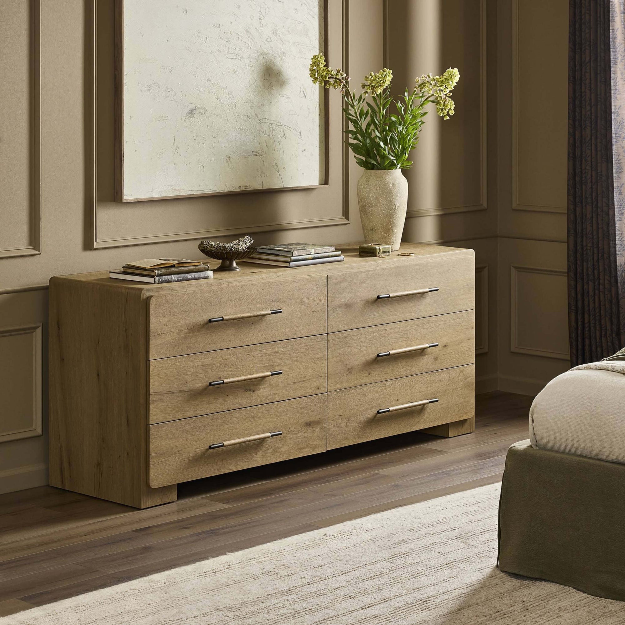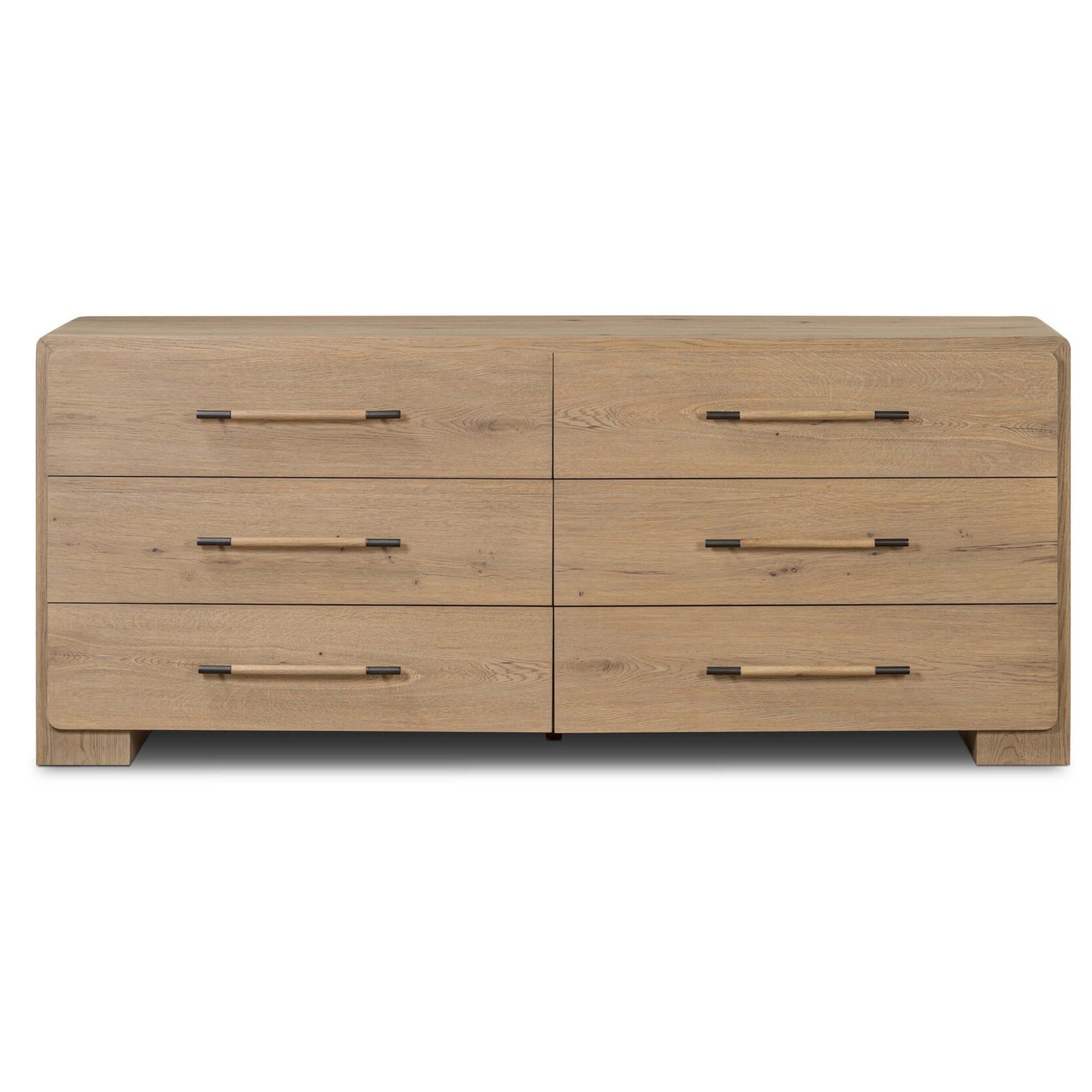 The Eden 6 Drawer Dresser blends clean lines with functional elegance. Crafted from oak, its simple yet striking silhouette features waterfall shaping that flows seamlessly from top to base. Six roomy drawers offer ample storage, each accented with a mix of aged bronze and wood hardware for a refined touch. Soft-close undermount glides ensure smooth operation, making this dresser a quietly luxurious addition to any bedroom.