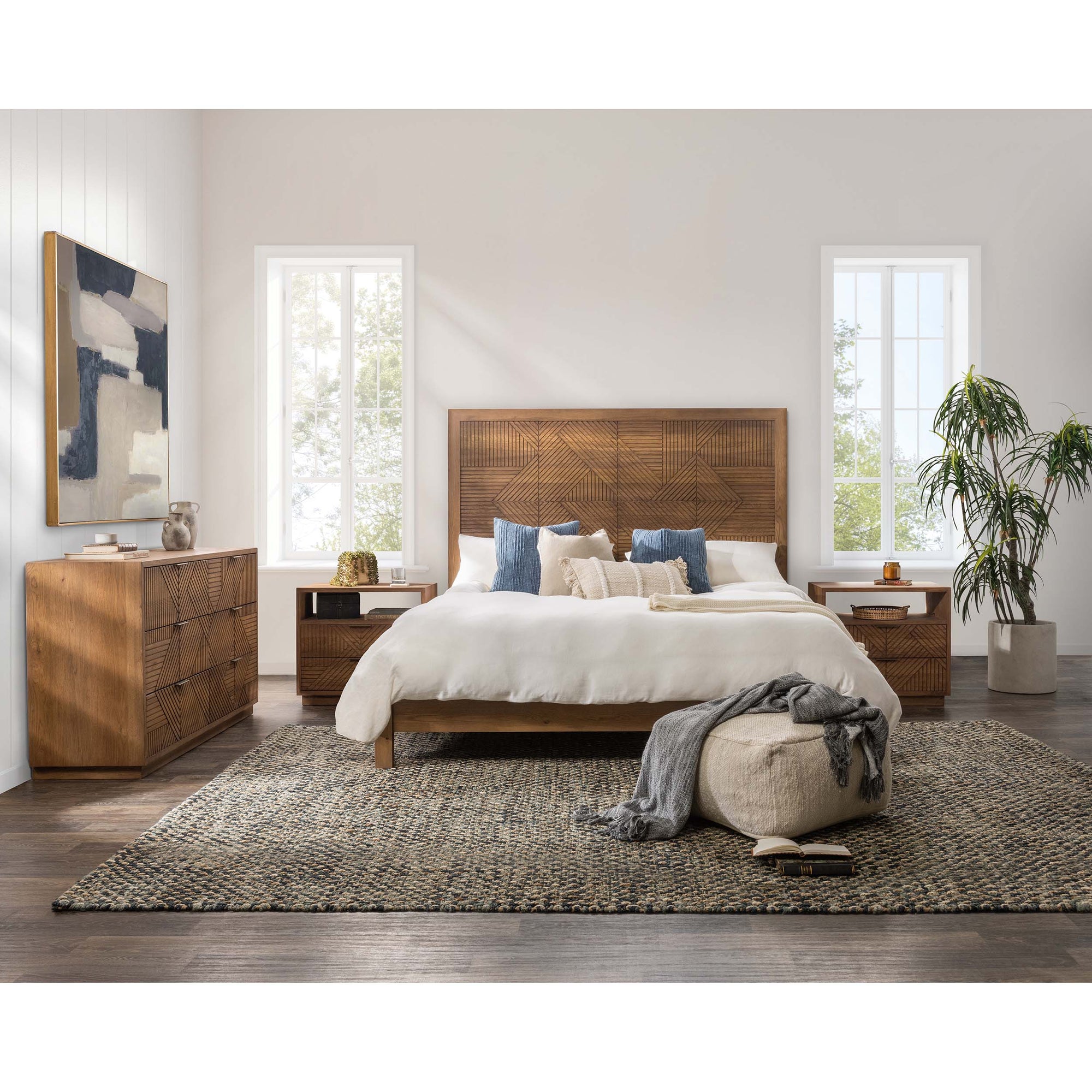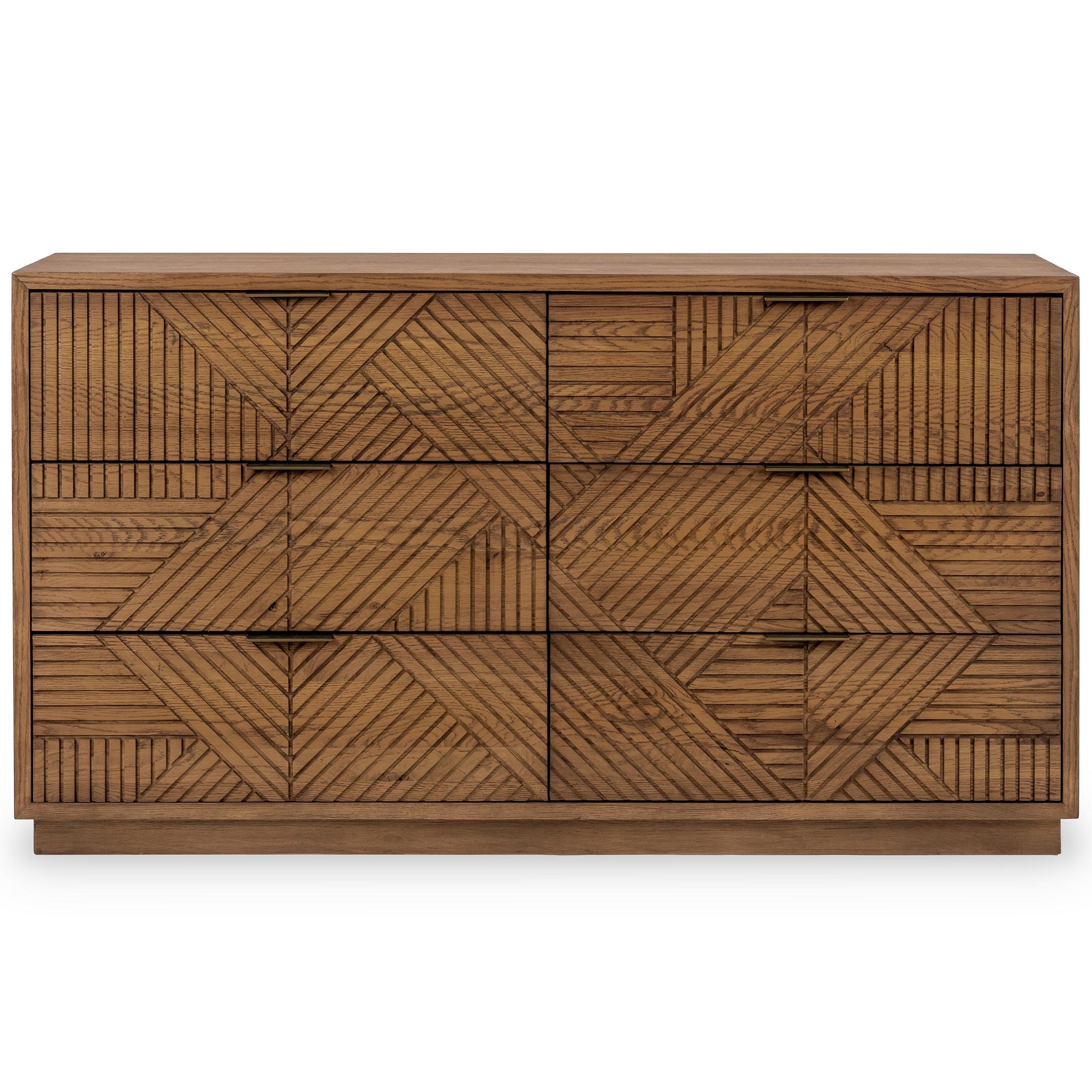 The Santa Clara Dresser features FSC® Certified oak veneer with geometric carved detailing inspired by Art Deco. Its meticulously crafted design elevates any bedroom with elegance and sophistication, creating a refined and timeless centerpiece.