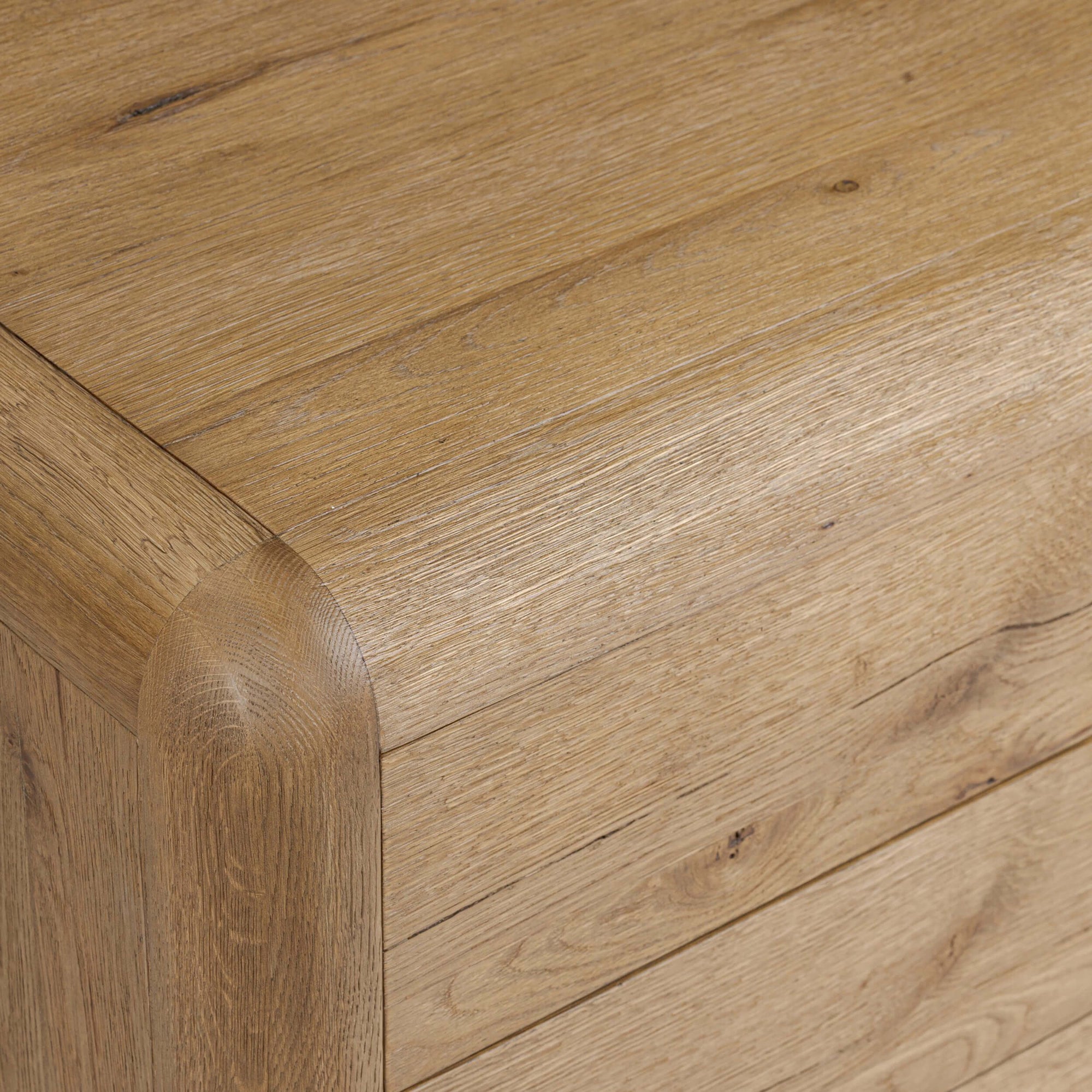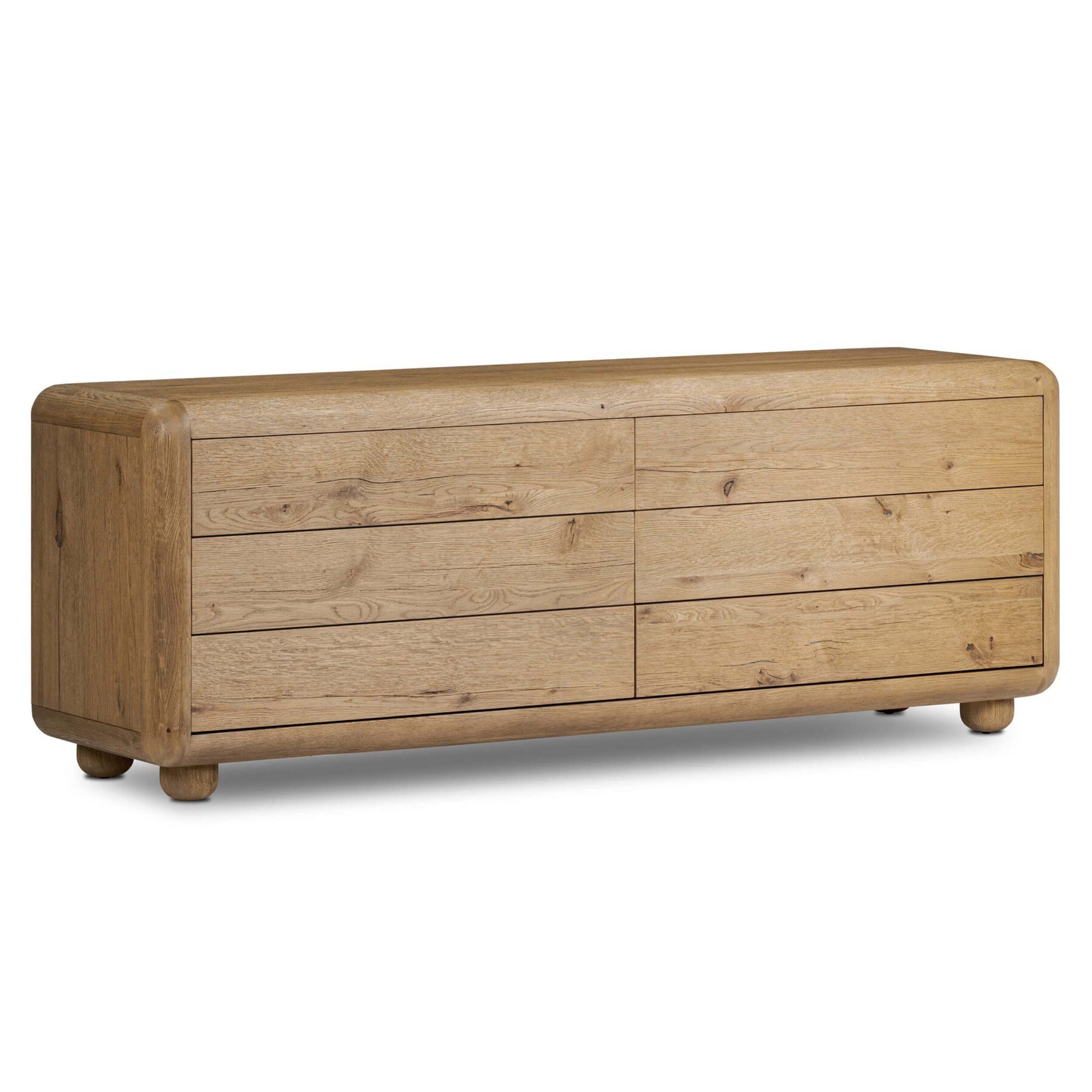 The Sheldon 6 Drawer Dresser blends modern design with classic elements for a look that’s both soft and bold. Set low on rounded feet, its prominent rounded corners highlight a smooth, refined finish. Crafted from solid warm oak and veneers, this dresser features push-latch hardware that maintains a clean, minimalist front. With six spacious drawers, it offers ample storage while making a stylish statement in any bedroom.