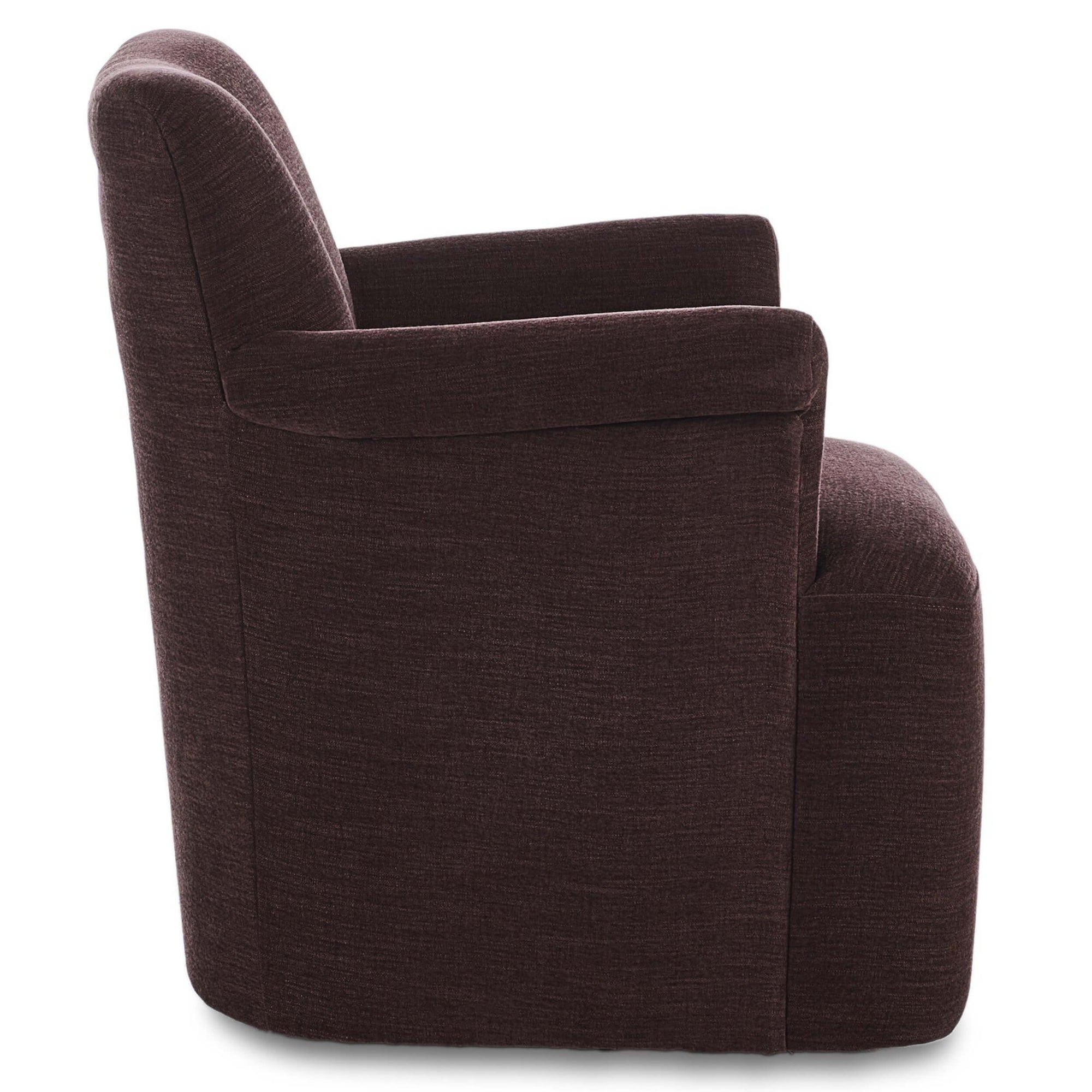 The Camellia Swivel Chair blends graceful curves with inviting comfort. Its softly rounded back and gently sloped arms create a silhouette that feels both classic and current. Wrapped in richly textured upholstery, the chair offers a warm, tailored look that elevates any room. The smooth swivel base allows for easy movement, making it perfect for conversation areas, reading corners, or bedroom retreats. Generously cushioned and thoughtfully proportioned, the Camellia delivers supportive comfort without sacrificing style. It is a refined accent piece designed to anchor your space with effortless sophistication.