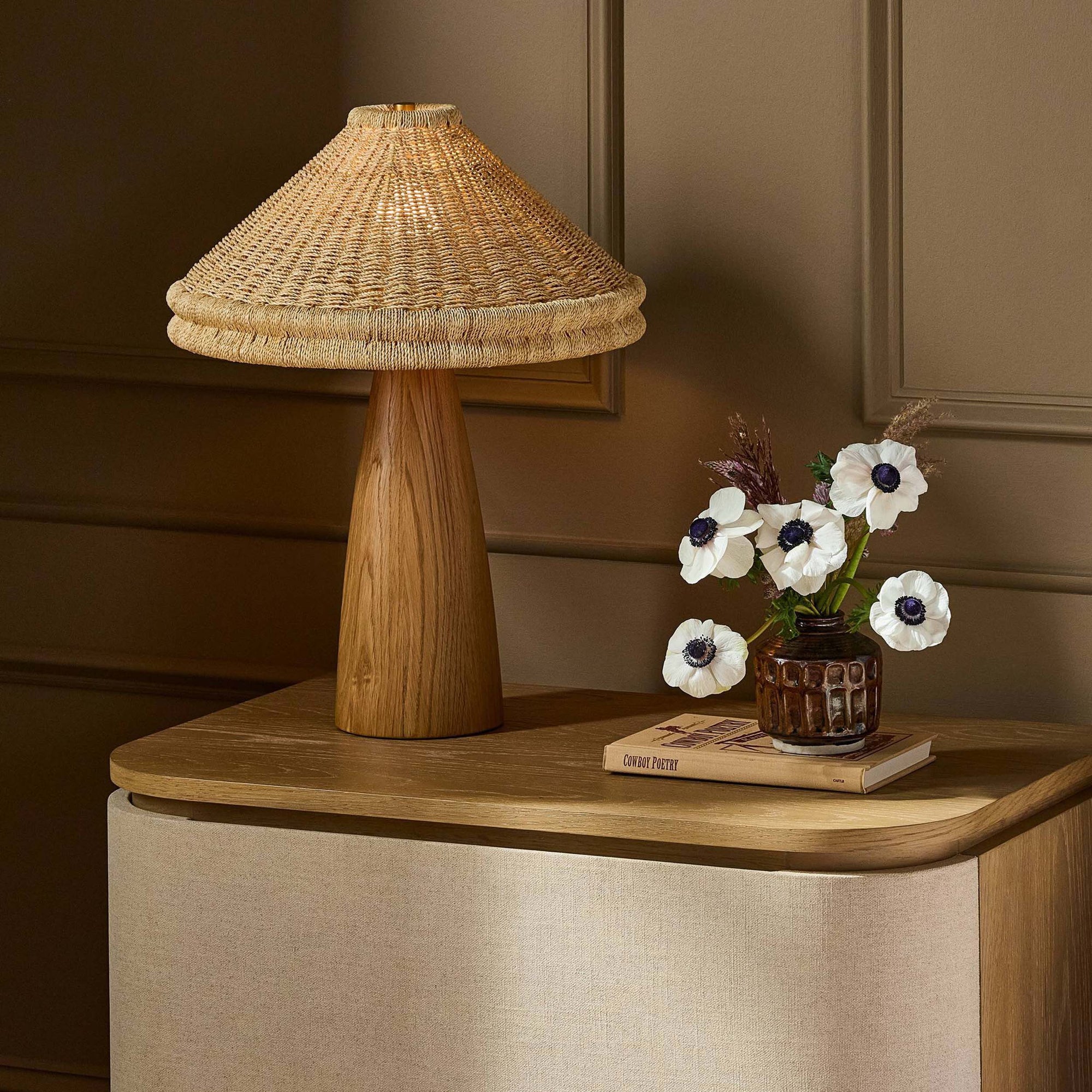 The Canela Table Lamp is designed to craft warmth on any surface. It features a solid oak balloon-shaped base that is expertly carved for a wide, sculptural presence, and is topped by a double-brimmed raffia shade. Accents of aged brass complete this inviting and artistic piece, perfect for ambient lighting.
