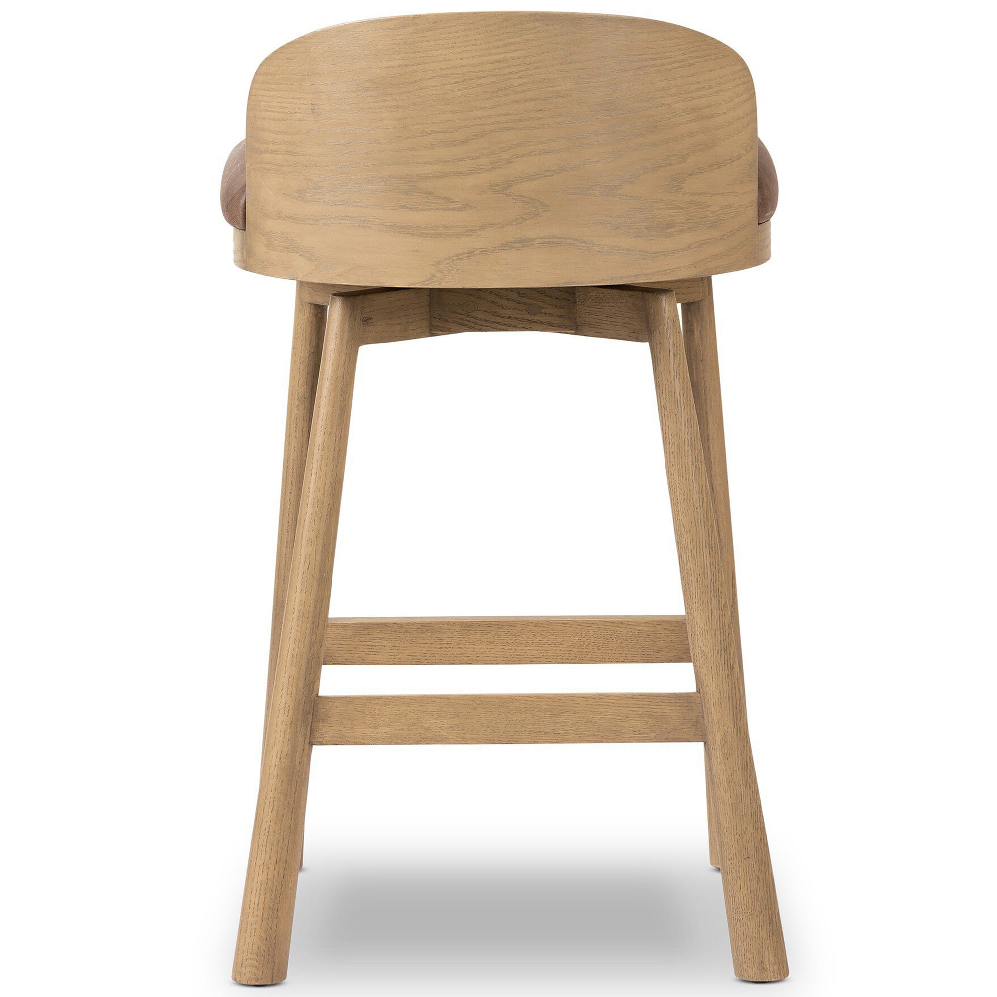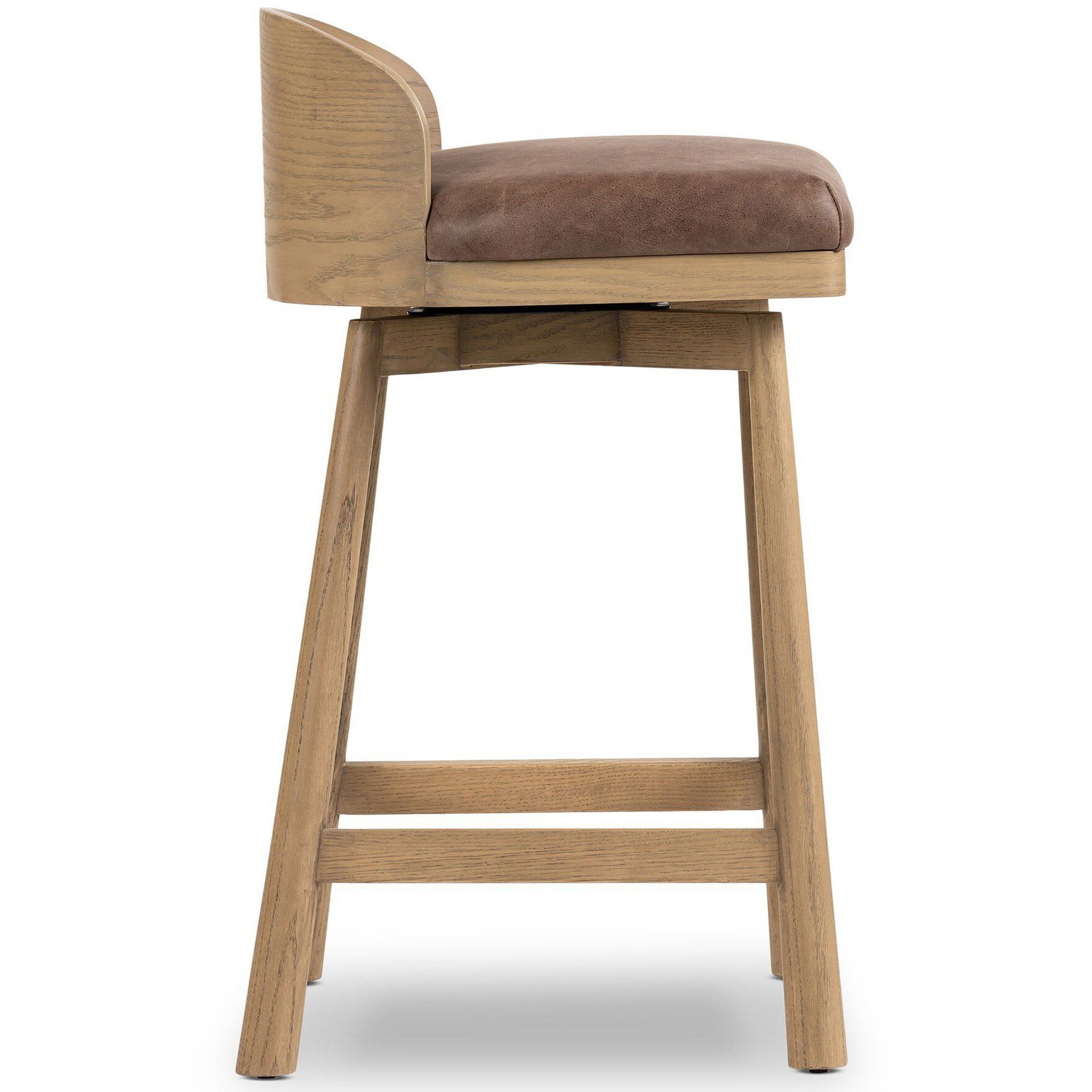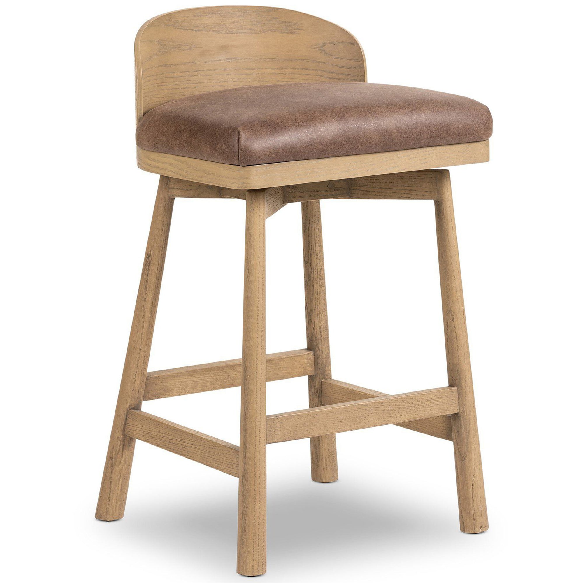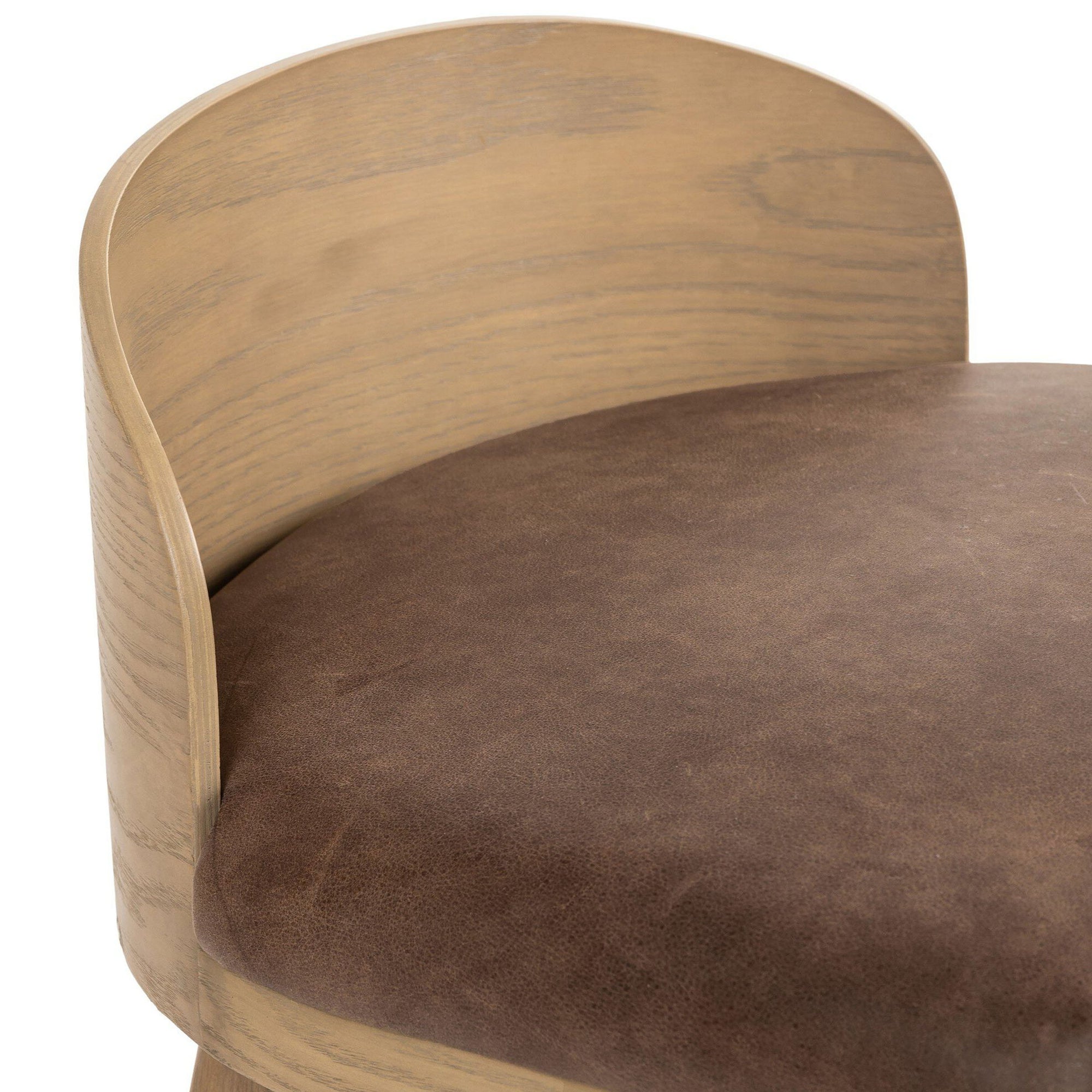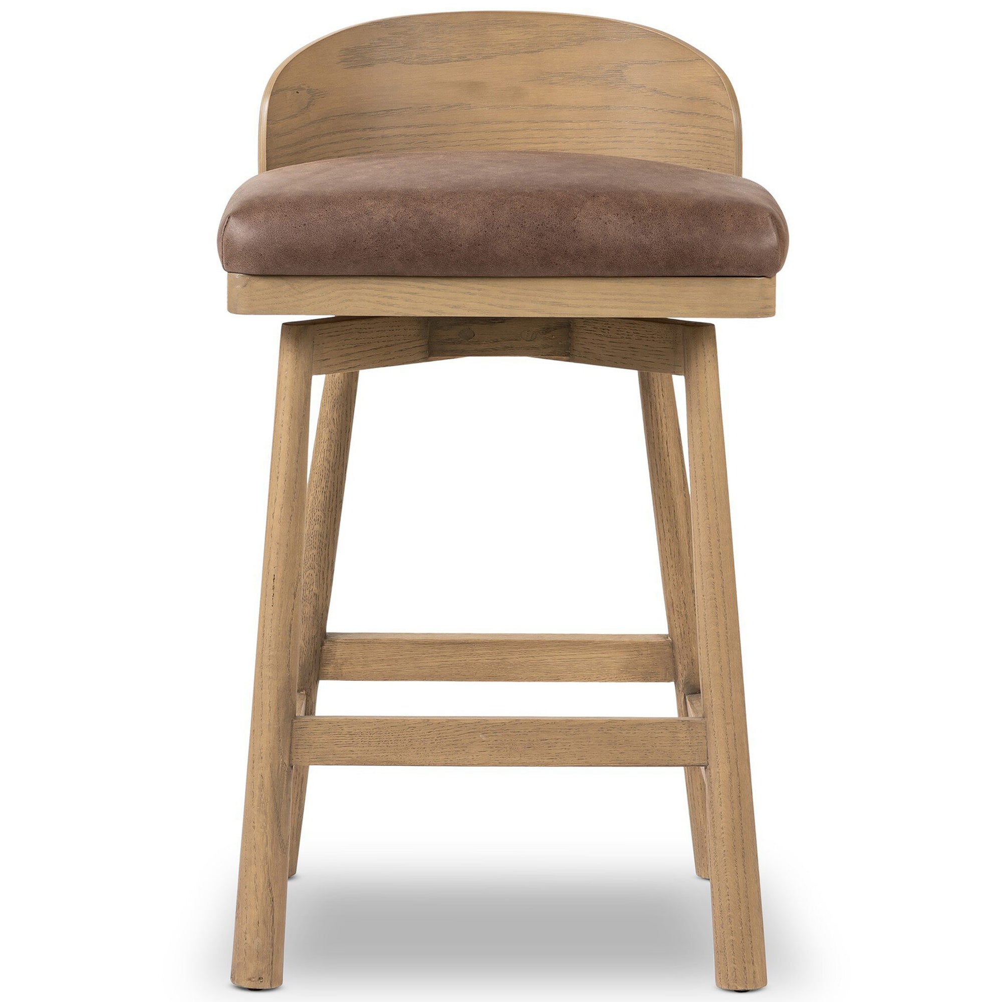 The Cloris Leather Swivel Bar & Counter Stool combines vintage-inspired style with practical function. Featuring a molded low-back wooden frame and a fixed upholstered seat, this armless counter stool provides comfort and playful character. Crafted from solid oak with oak veneer accents, the stool includes a 180-degree memory swivel mechanism, ensuring the curved back remains perfectly aligned with each use.