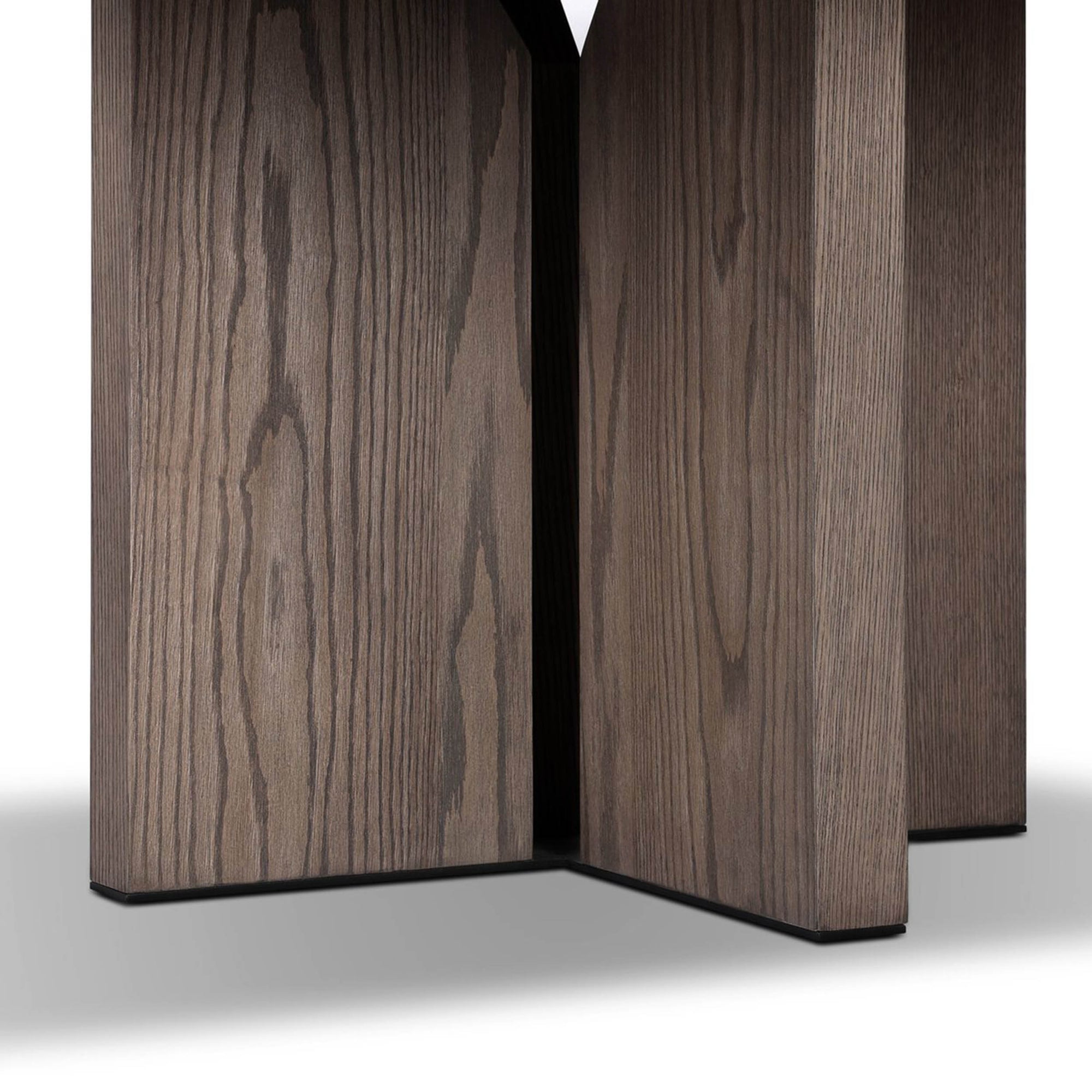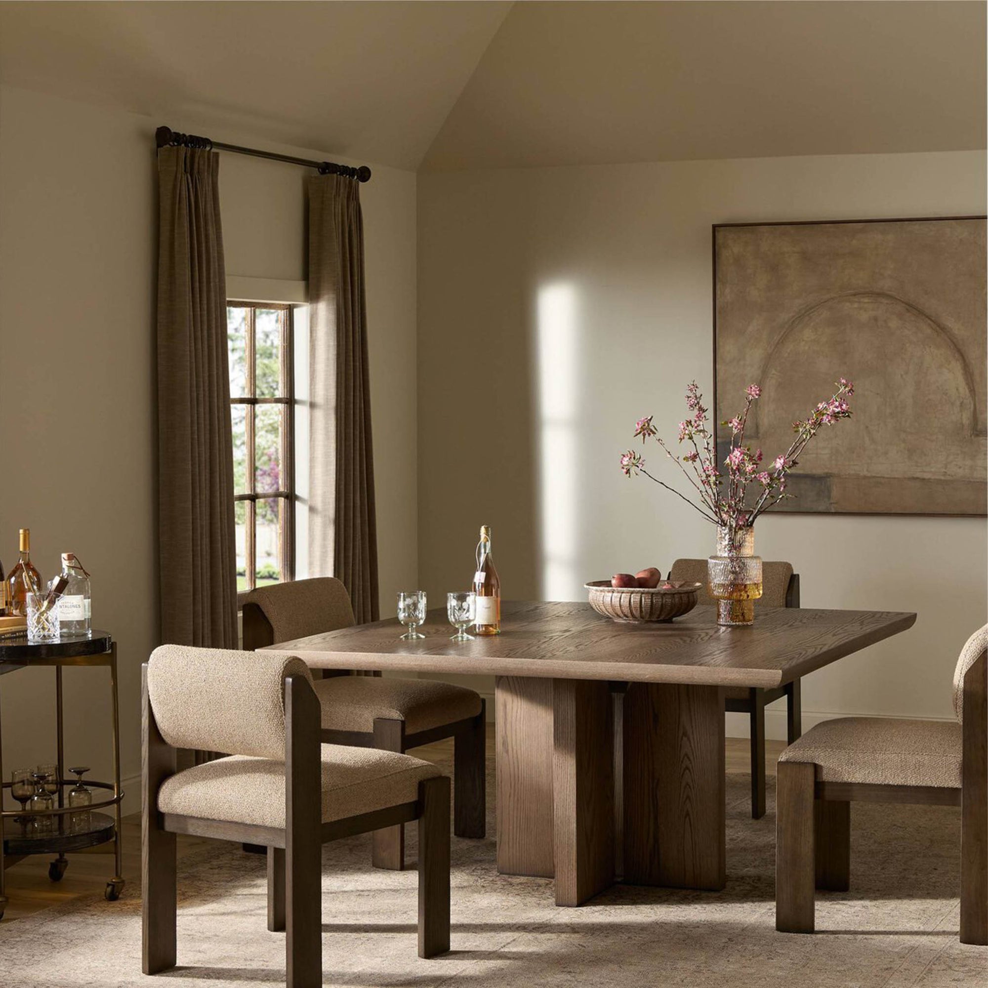 The Ernest Square Dining Table embraces Nordic minimalism with a softened square top and a bold plinth-leg base. Finished in grey-brown oak veneer and grounded by a black metal plate, this pedestal-style piece blends clean geometry with refined materiality.