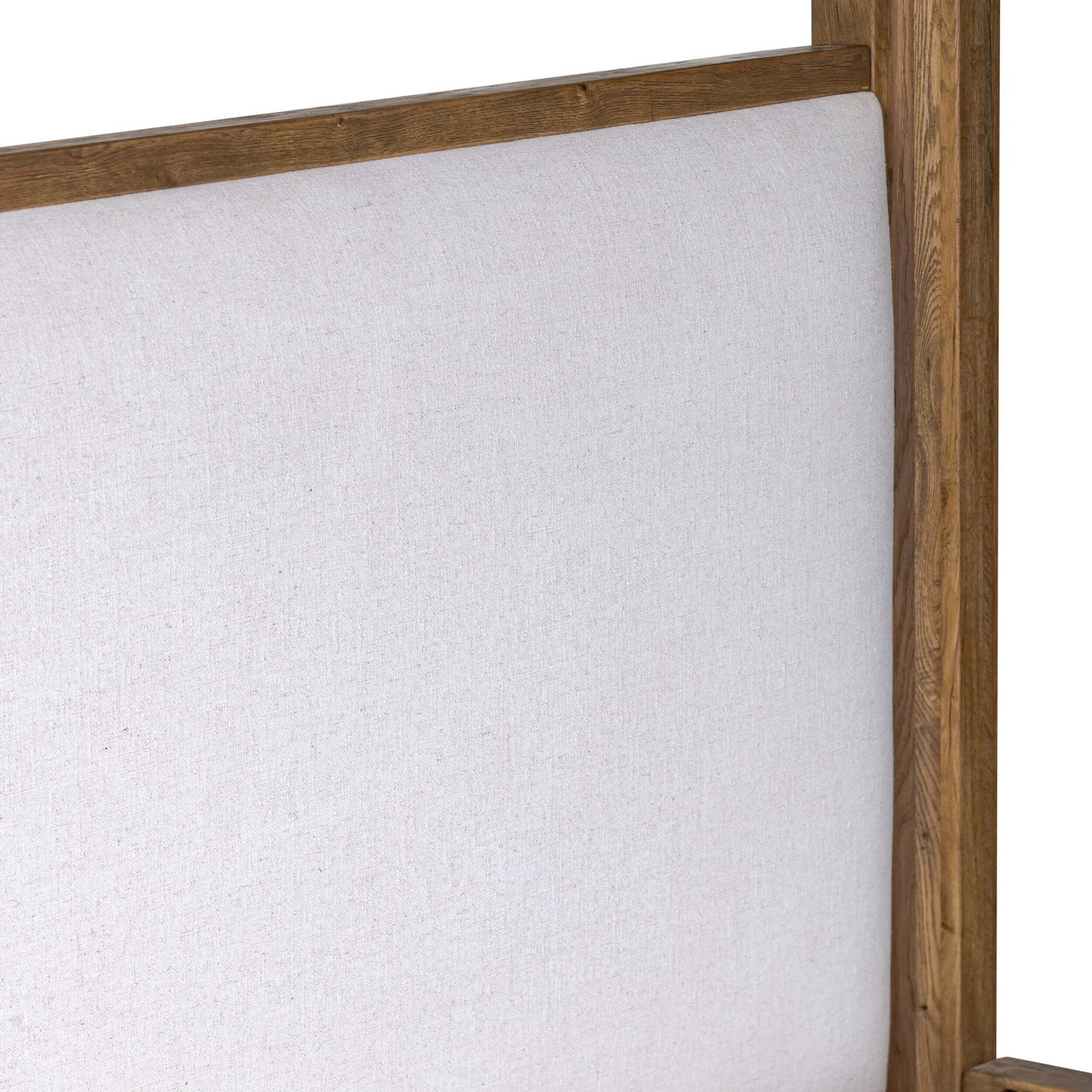 The Frederick Canopy Bed combines minimalist design with modern appeal in a sleek platform style. Its low-profile frame is softened by an upholstered headboard, offering a balanced mix of comfort and style. Crafted from character-rich oak, the bed features gently rounded corners and a light brown finish that brings warmth and freshness to any bedroom. This streamlined piece creates a calming, contemporary centerpiece that complements a variety of decor styles.