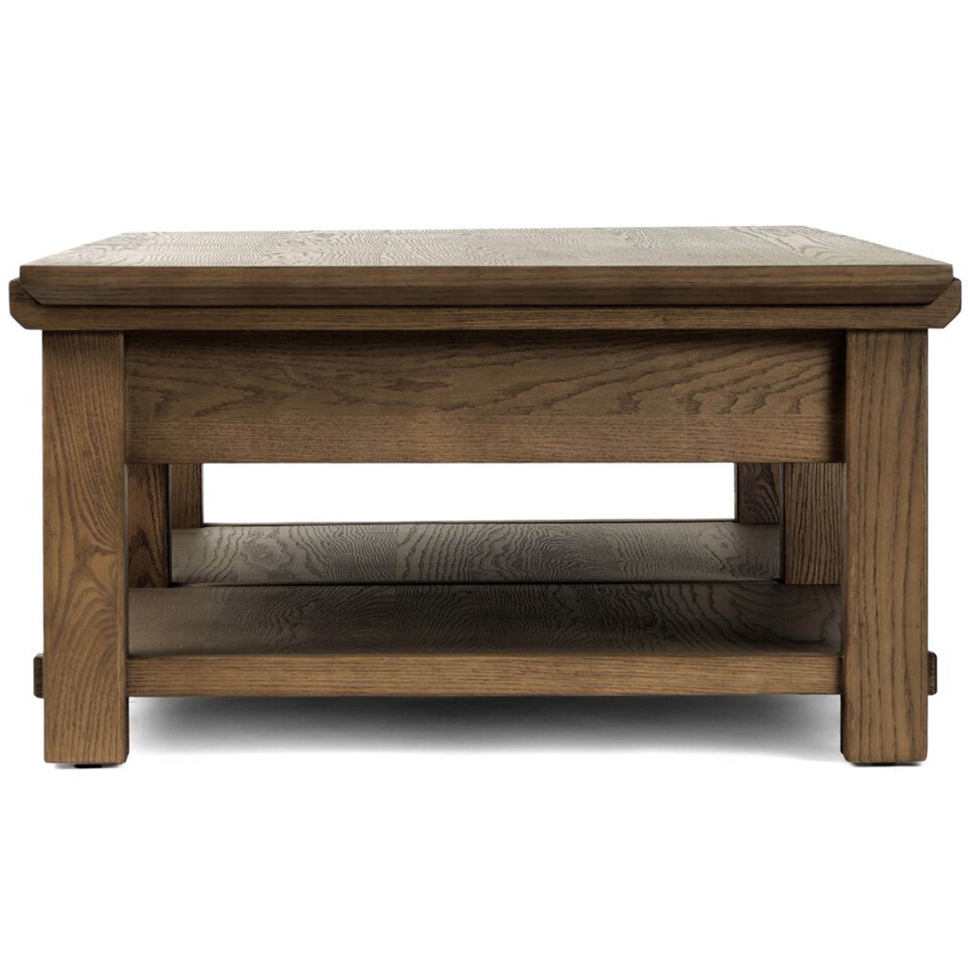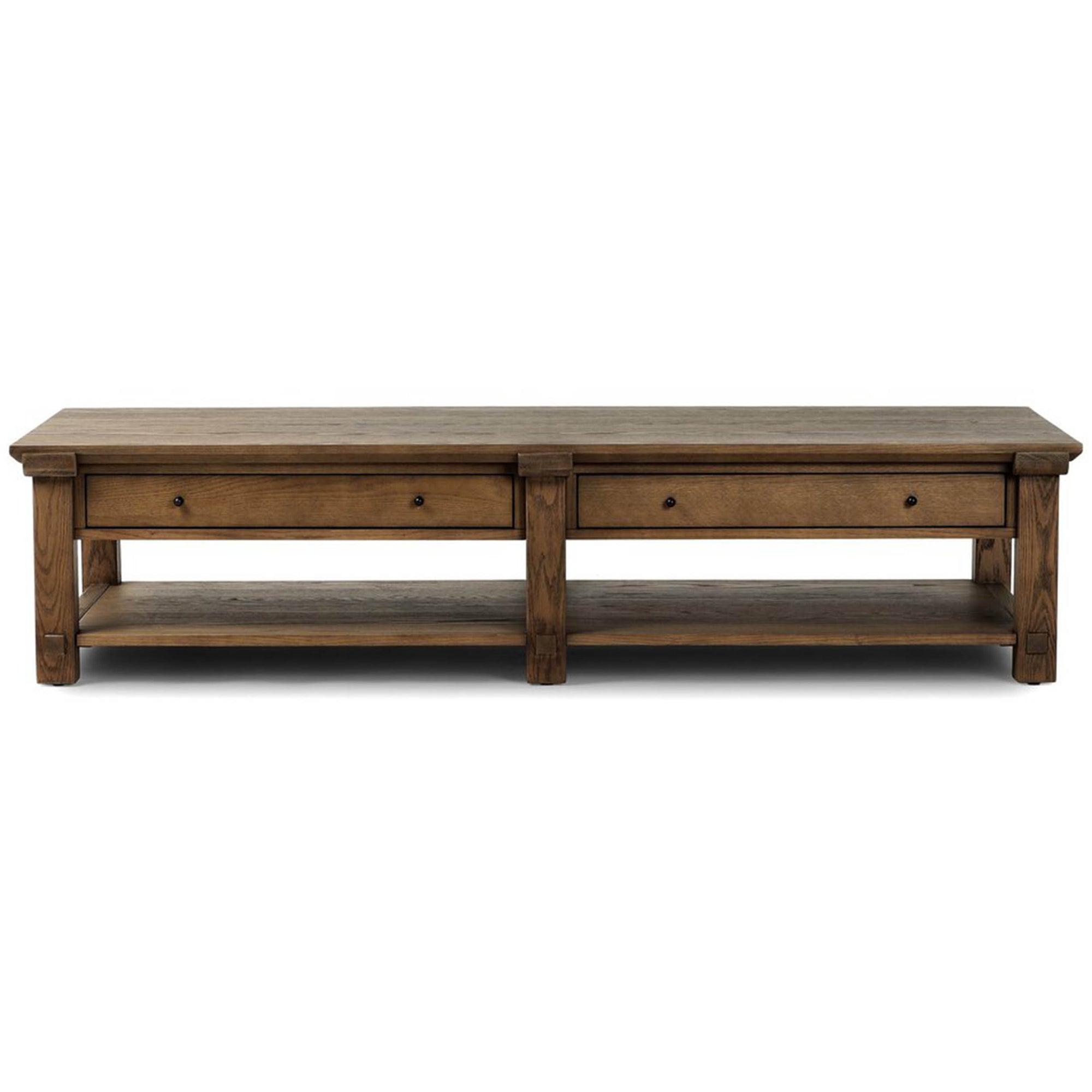 The Gardendale Coffee Table brings functional warmth to your living space. Crafted from warm oak with black iron accents, it features four drawers and two open lower shelves for ample storage. Exposed joint detailing enhances its artisanal appeal.