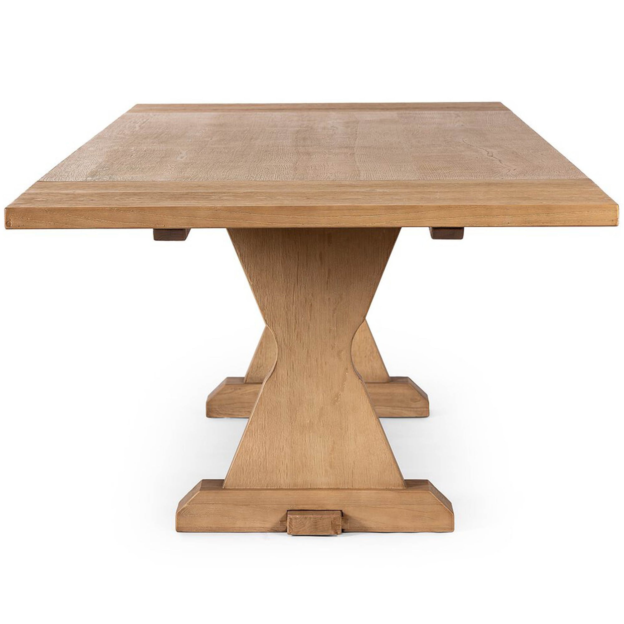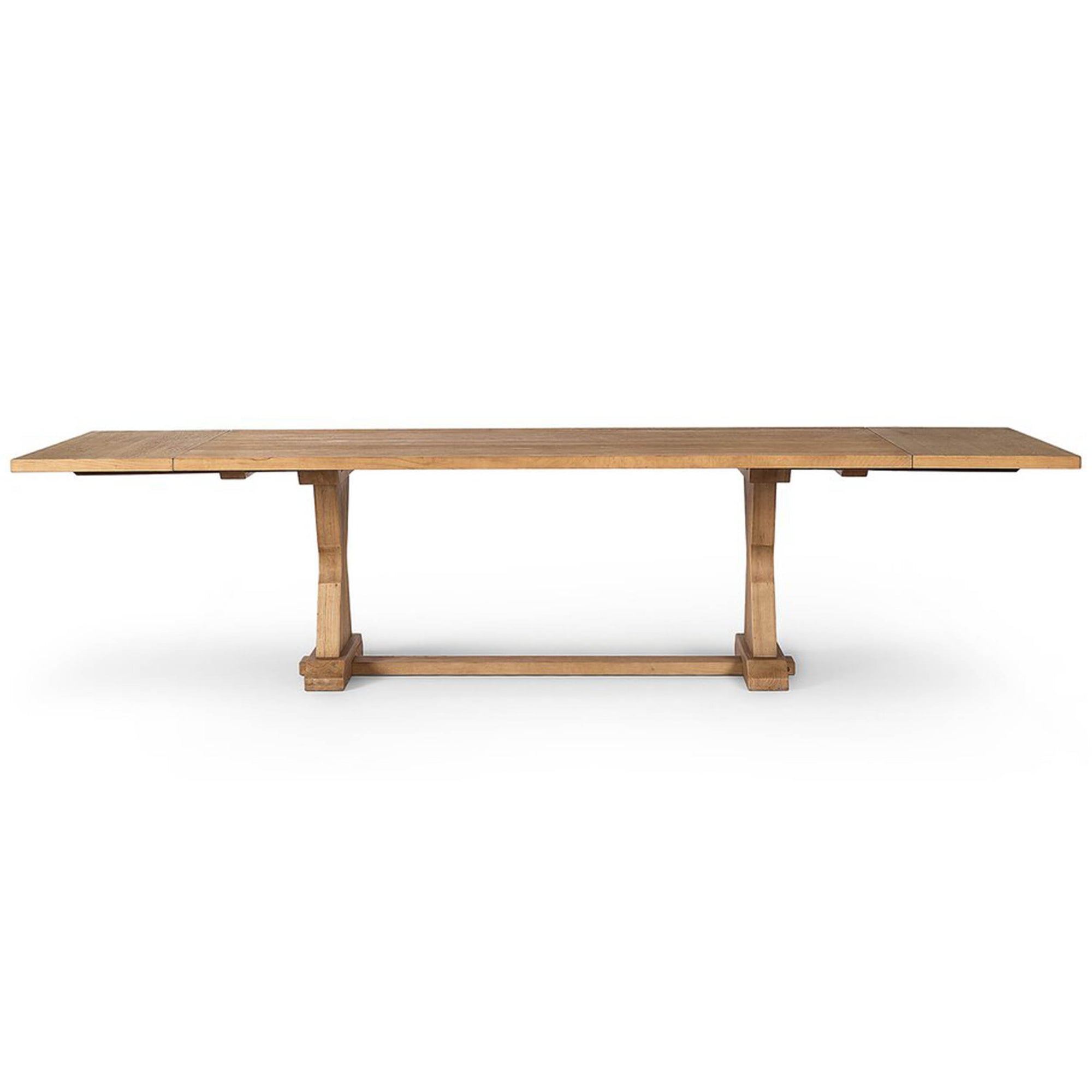 The Idella Extension Dining Table features a classic trestle design with a modern twist, including a center cutout and hourglass silhouette. Its breadboard top extends from 88" to 128", seating up to 12 for gatherings large and small.