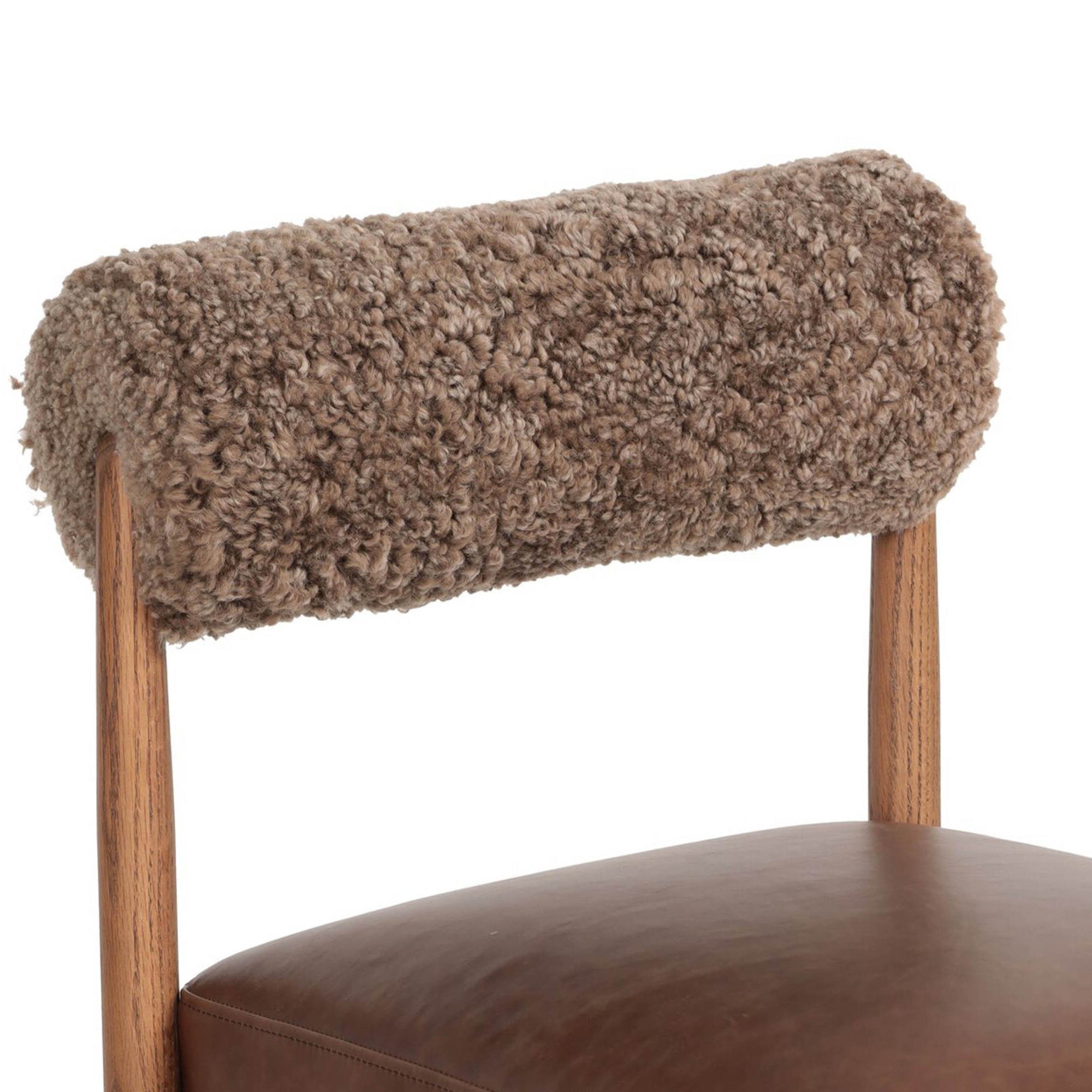The Jazelle Leather Dining Chair blends retro influence with modern materiality, pairing a bolstered cylinder back with a mix of top-grain leather, solid oak, and soft taupe shearling. A statement piece for any dining space.