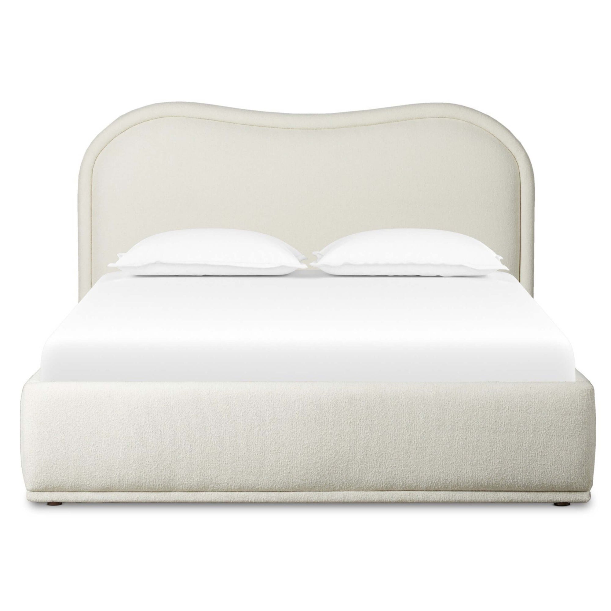The Julia Bed blends swooping curves with full upholstery to create an elegant and inviting design. Wrapped in soft cream fabric, the generous cushioning envelops the frame, adding rich textural depth and comfort. Its graceful silhouette enhances any bedroom, offering a refined yet cozy atmosphere. Perfect for those seeking a stylish bed that combines form and function with timeless appeal.