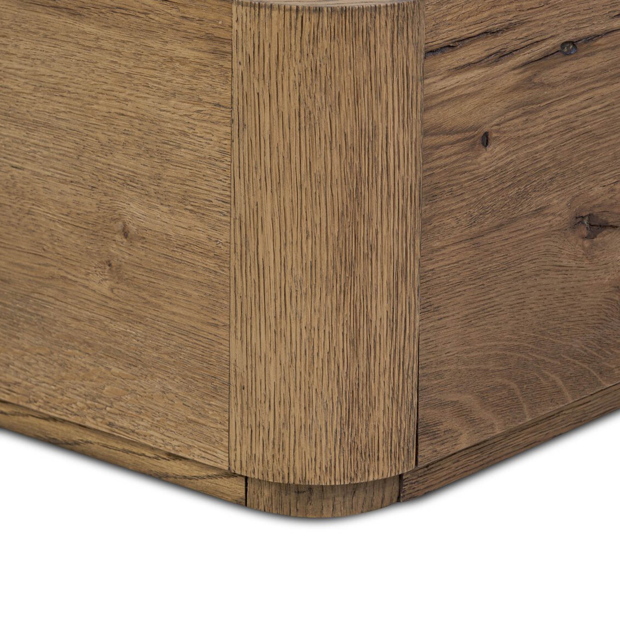 The Maeve Bed blends clean lines with contoured curves for a timeless silhouette. A petal-shaped, fully upholstered headboard overlaps side rails, grounded by a thick natural oak base.