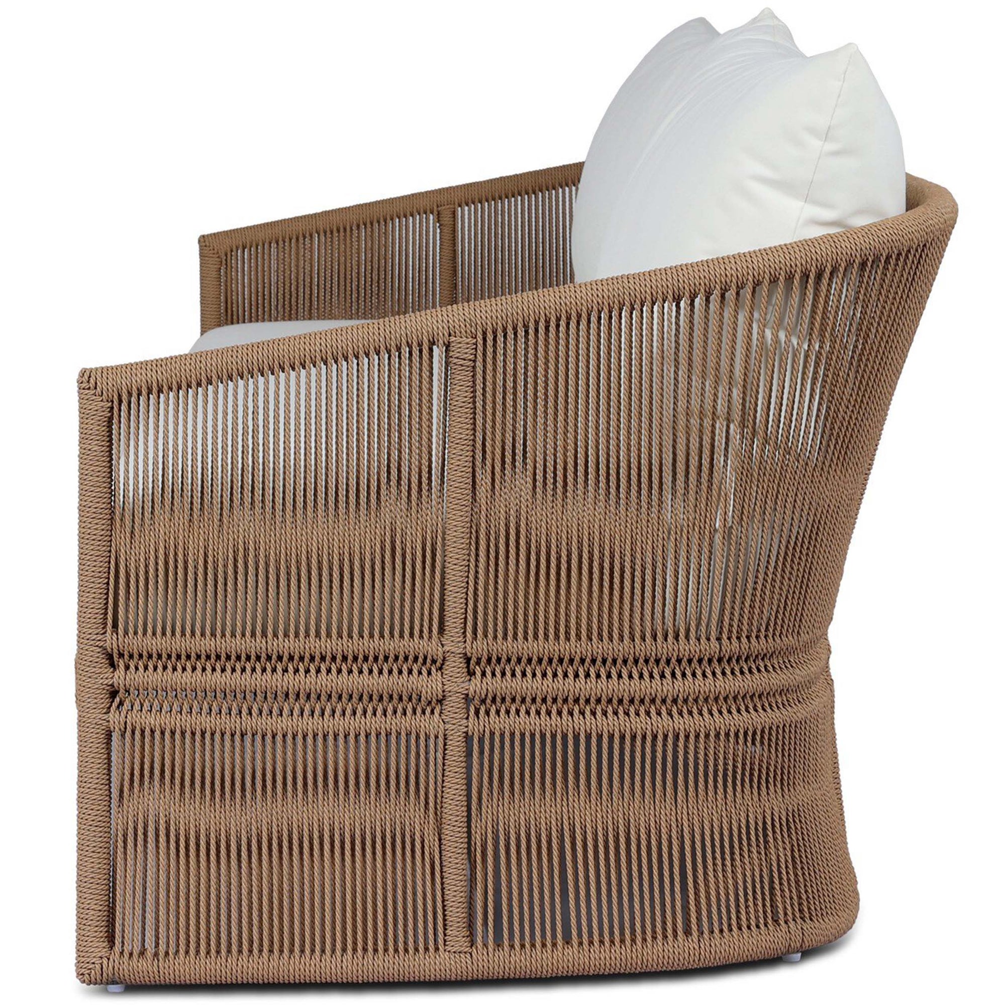The Mondira Outdoor Sofa features a clean-lined silhouette and textured natural base with water-resistant performance upholstery in Arashi Salt. Loose knife-edge back cushions and a semi-attached boxed seat cushion offer inviting comfort, while webbed seat construction ensures lasting support.