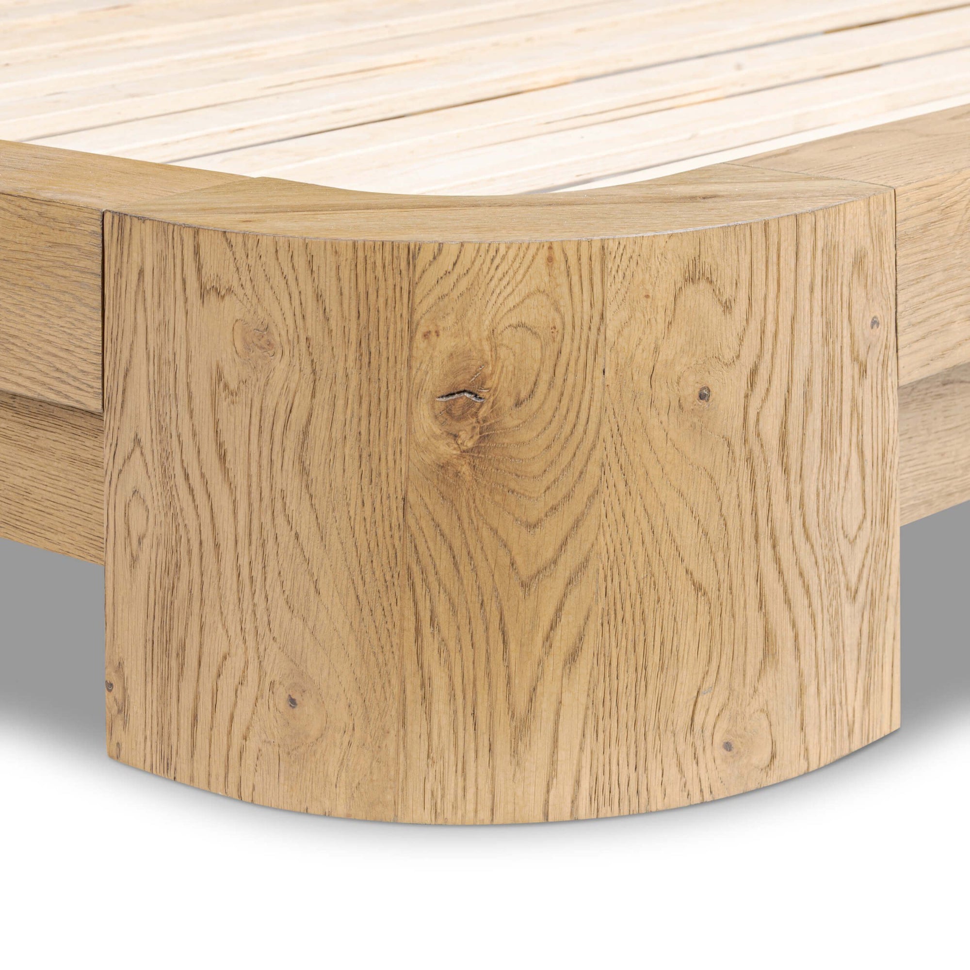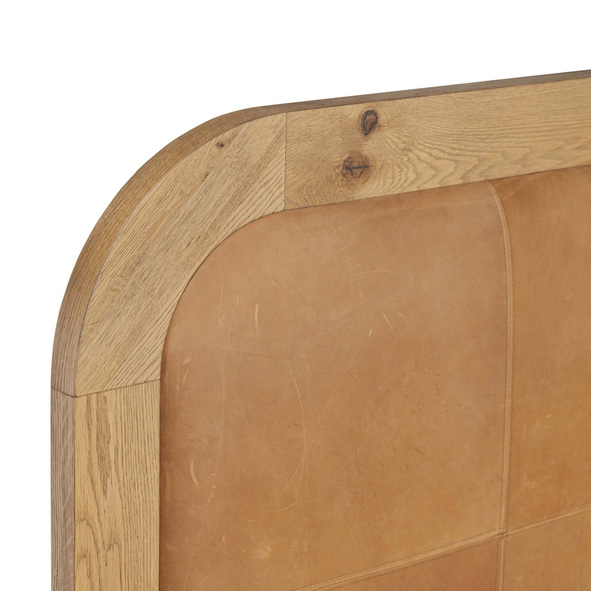 Write product description in less than 150 words for Rane Bed without using the word "introducing", based on: Bring a soft, sleek look to bedroom styling with a mixed material bed of honey-finished oak featuring a curved, cushioned headboard of aged brown top-grain leather. Sourced from one of the oldest family-owned tanneries in Italy’s Bassano del Grappa, heirloom leather is salvaged and processed from upcycled hides featuring an abundance of natural markings, scars and color variations. The result? Beautifully supple, buttery soft hides with an unmatched depth of color and richness, and an authentic lived-in look.