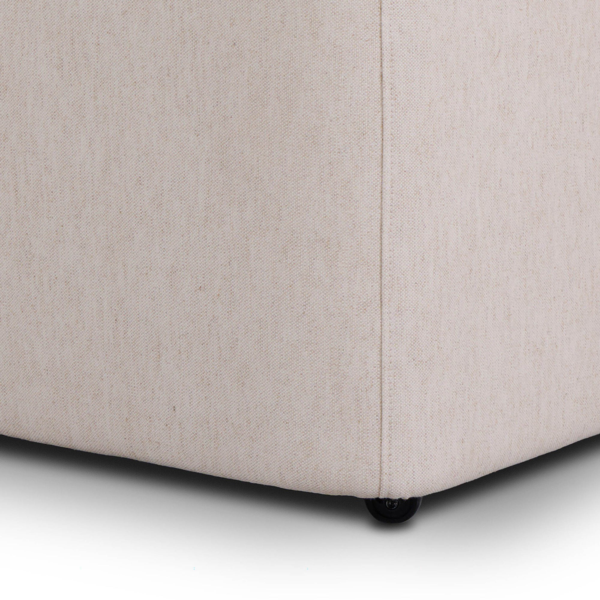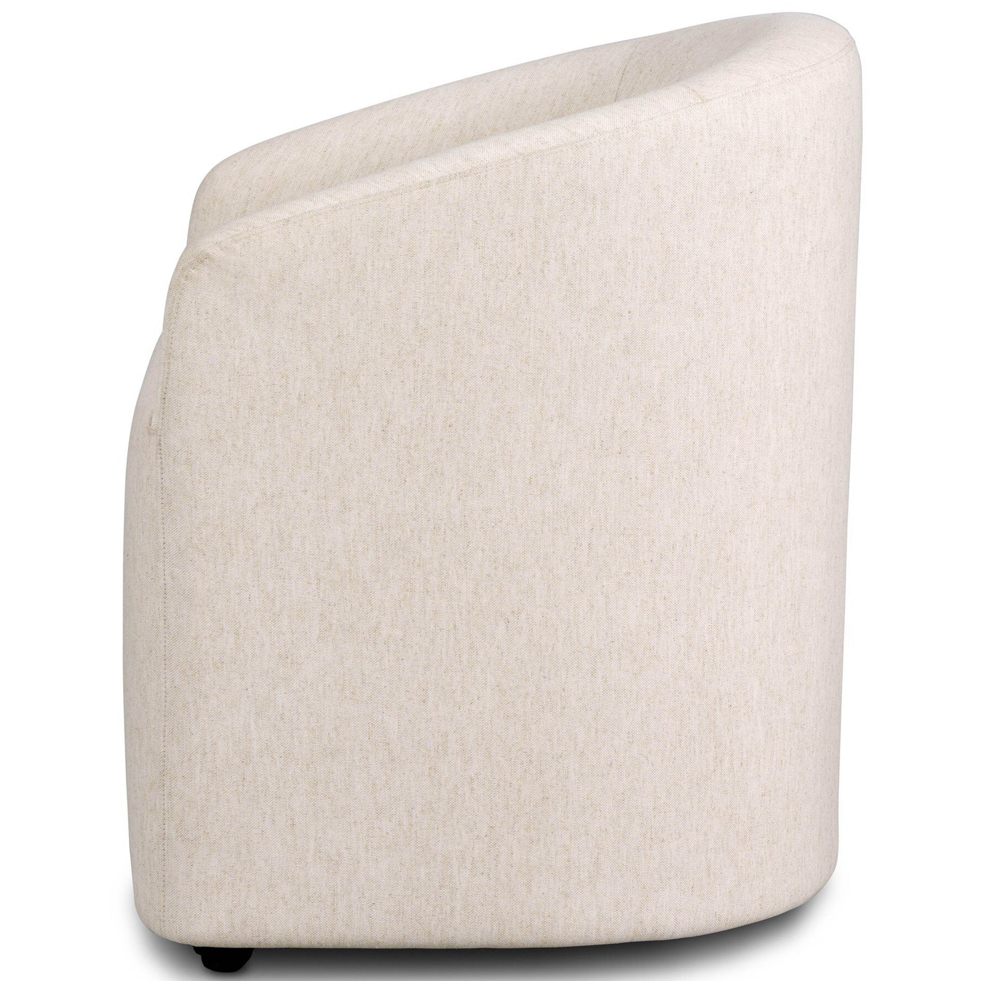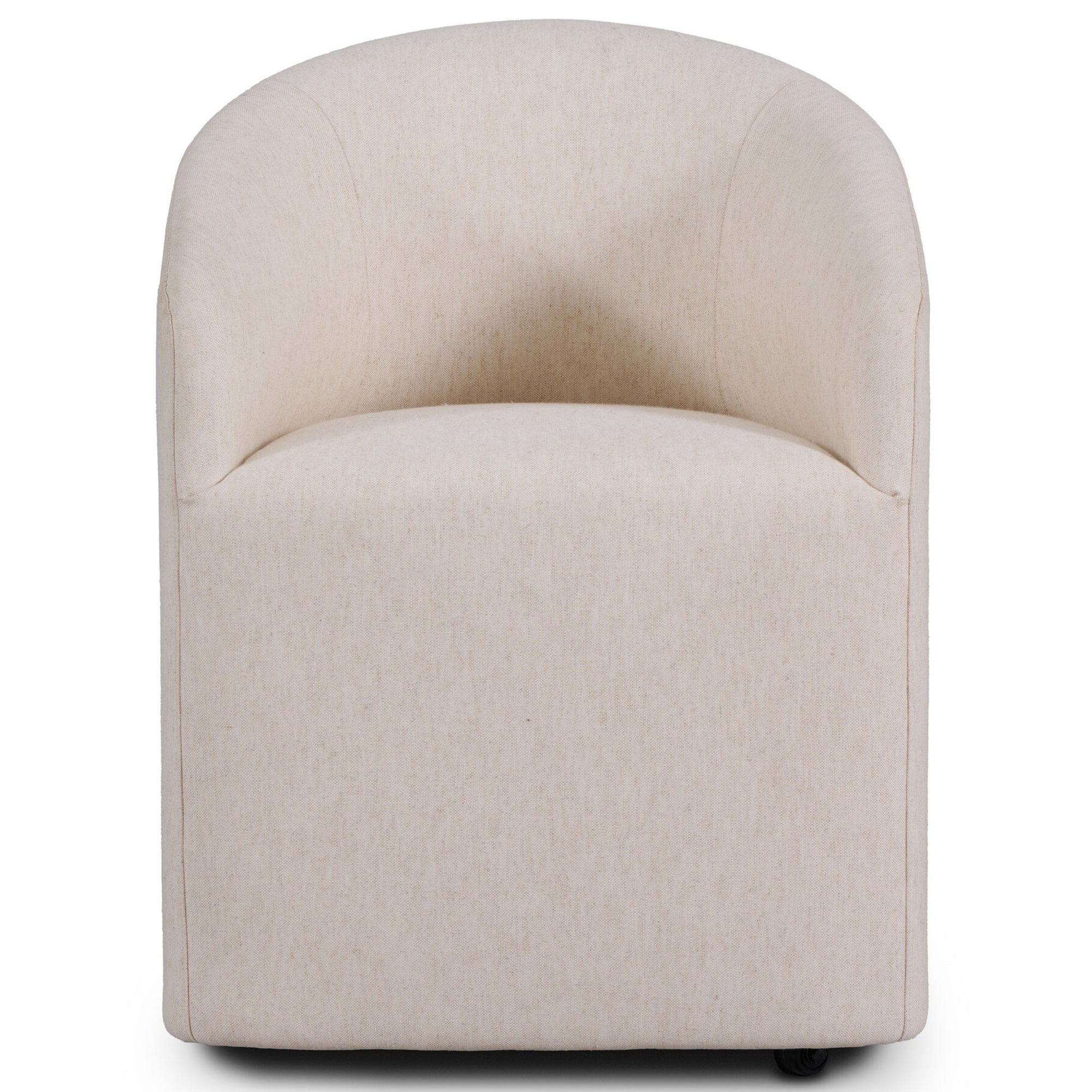 The Rhett Dining Chair features a fully upholstered barrel-style back that provides a cocoon-like sit. Compact in scale, it’s ideal for smaller dining spaces, offering both comfort and elegant form. Casters allow for smooth, effortless mobility.