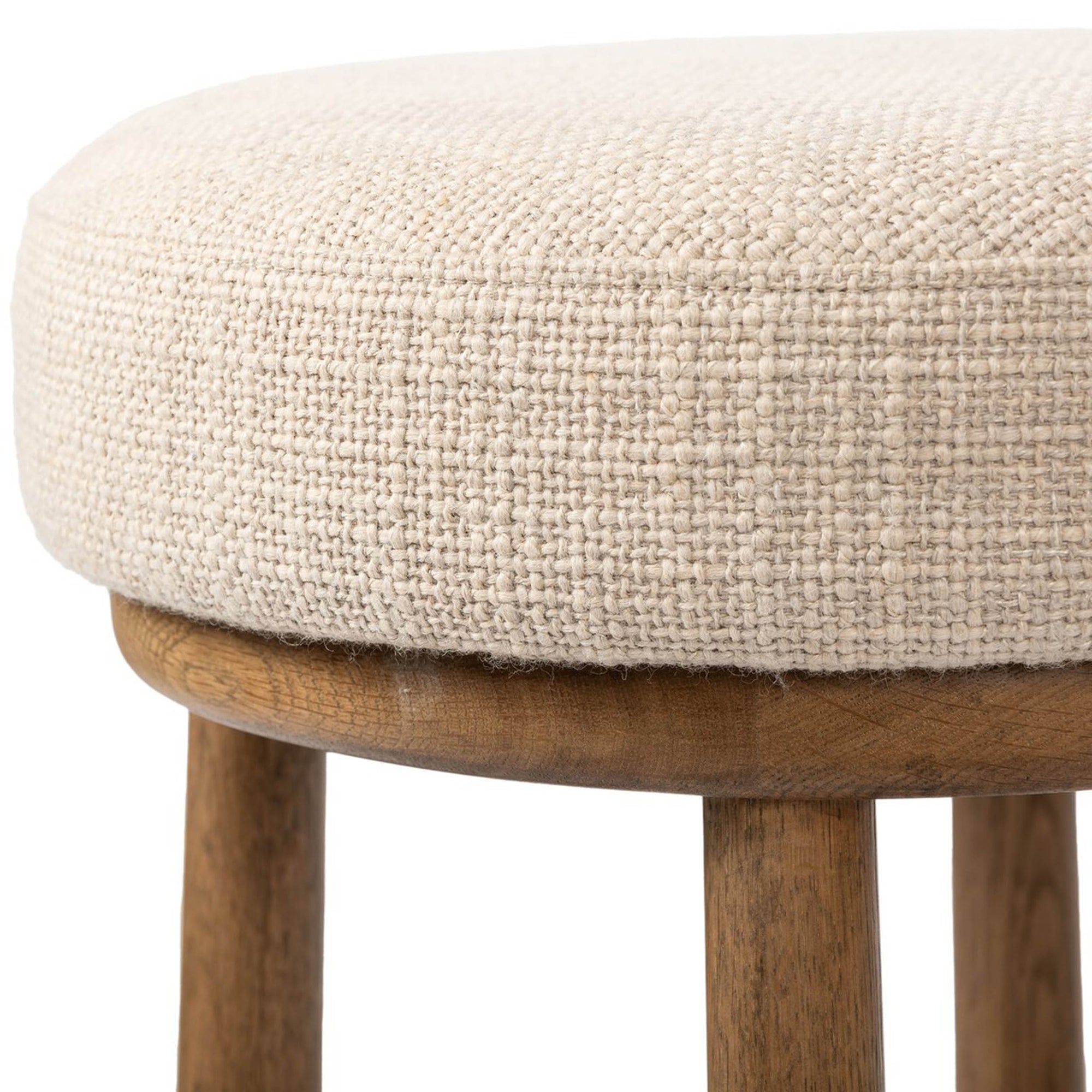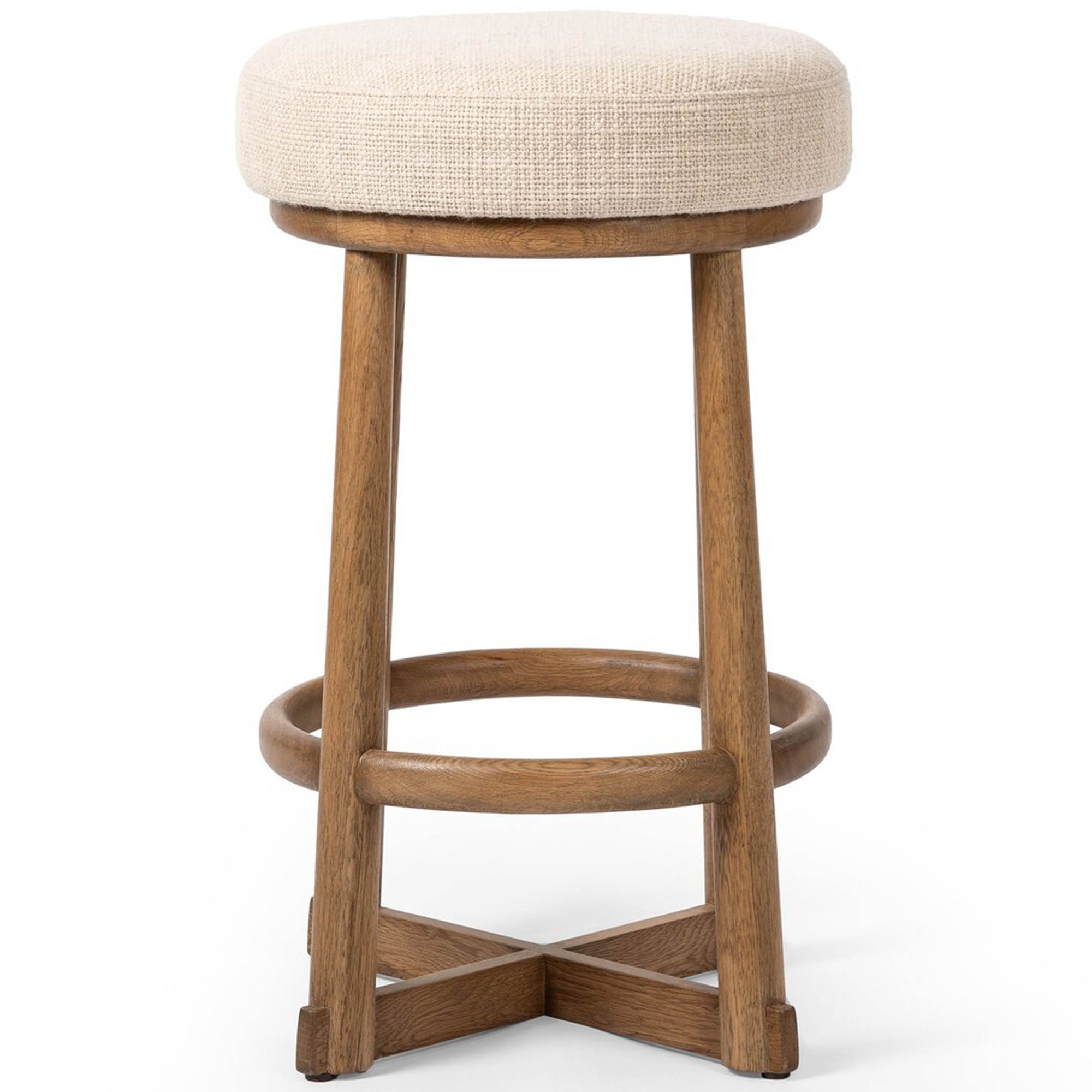 The Staria Swivel Stool offers counter-height functionality with modern elegance, featuring a 360-degree swivel, warm oak frame, and chunky basketweave upholstered seat. A crossed base and tapered legs provide balance and visual appeal.